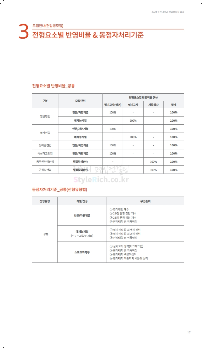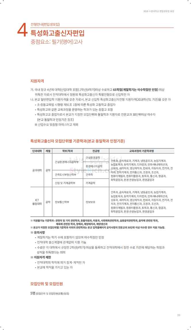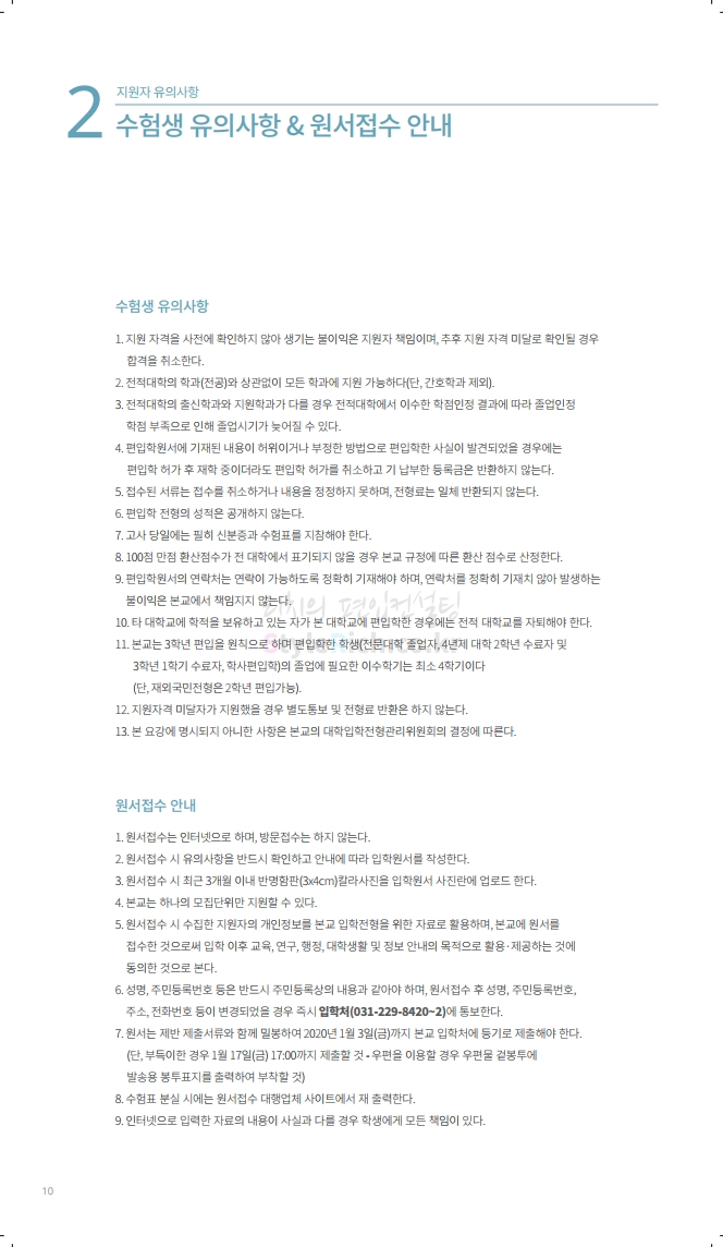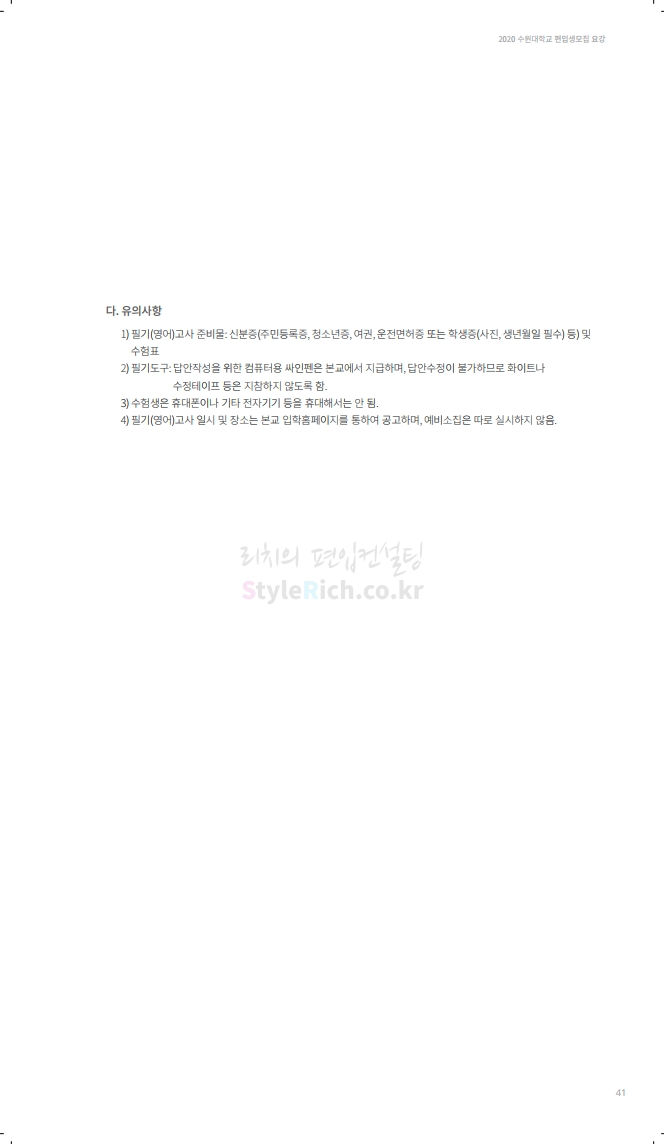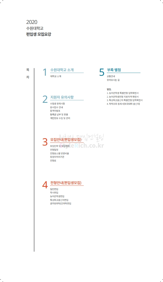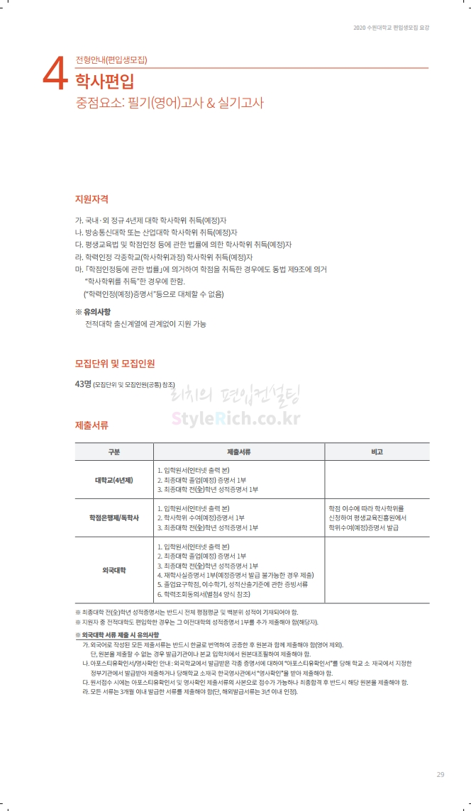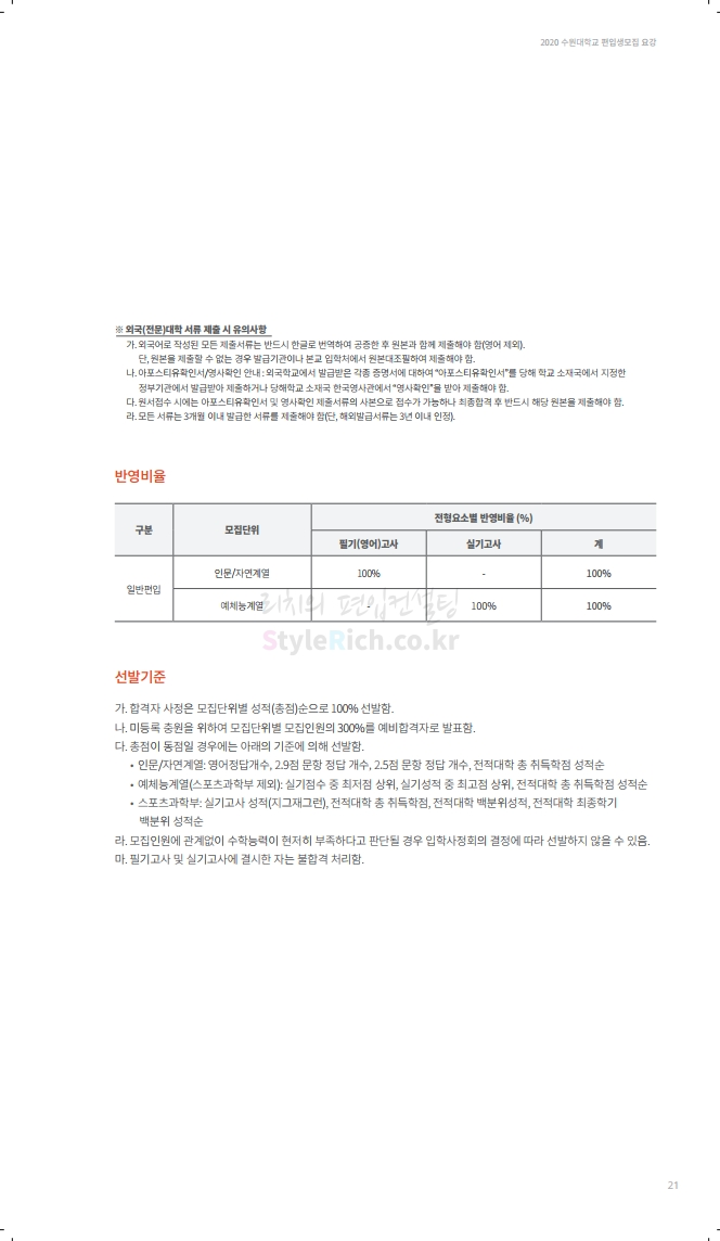 수원대 편입 2020학년도 모집요강 간편하게 보자 2019.12.07 02:46 편입 모집요강/2020학년도 모집요강 2020학년도 수원대 편입 모집요강을 간편하게 확인하세요. PC와 모바일 모두에서 이미지를 클릭(터치) 후 이미지의 좌우측을 각각 클릭하면 모집요강 순서를 앞뒤로 넘길 수 있습니다. 좌측 클릭(터치)는 이전 페이지, 우측 클릭(터치)는 다음 페이지입니다. * 최종 모집요강 발표 후에도 일부 내용이 변경될 수 있으니 지원 전 반드시 수원대 입학처의 모집요강을 확인하시기 바랍니다. 2020학년도 수원대 편입 모집요강 다운받기 usw_2020_transfer.pdf 3.17MB <출처: 수원대 홈페이지> [VLOG] 수원대학교 가을축제 너나들이 브이로그 공유하기 게시글 관리 리치의 편입컨설팅 저작자표시 비영리 변경금지 (새창열림) '편입 모집요강 > 2020학년도 모집요강' 카테고리의 다른 글 한양대(ERICA) 편입 2020학년도 모집요강 간편하게 보자 (0) 2019.12.09 경희대 편입 2020학년도 모집요강 간편하게 보자 (0) 2019.12.09 연세대(미래) 편입 2020학년도 모집요강 간편하게 보자 (0) 2019.12.07 한국산업기술대 편입 2020학년도 모집요강 간편하게 보자 (0) 2019.12.07 숙명여대 편입 2020학년도 모집요강 간편하게 보자 (0) 2019.12.07 댓글 공유하기 다른 글 댓글 이 글 공유하기 구독하기 구독하기 카카오톡 카카오톡 라인 라인 트위터 트위터 Facebook Facebook 카카오스토리 카카오스토리 밴드 밴드 네이버 블로그 네이버 블로그 Pocket Pocket Evernote Evernote 다른 글 한양대(ERICA) 편입 2020학년도 모집요강 간편하게 보자 한양대(ERICA) 편입 2020학년도 모집요강 간편하게 보자 2019.12.09 경희대 편입 2020학년도 모집요강 간편하게 보자 경희대 편입 2020학년도 모집요강 간편하게 보자 2019.12.09 연세대(미래) 편입 2020학년도 모집요강 간편하게 보자 연세대(미래) 편입 2020학년도 모집요강 간편하게 보자 2019.12.07 한국산업기술대 편입 2020학년도 모집요강 간편하게 보자 한국산업기술대 편입 2020학년도 모집요강 간편하게 보자 2019.12.07 다른 글 더 둘러보기