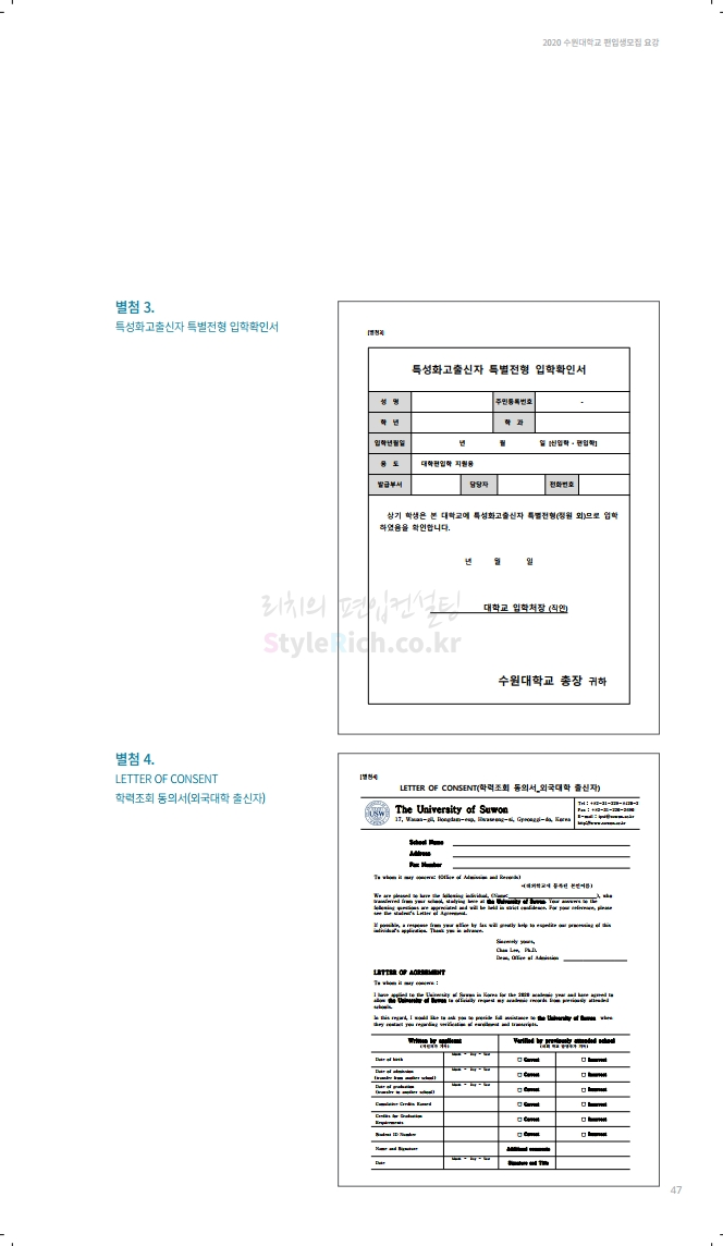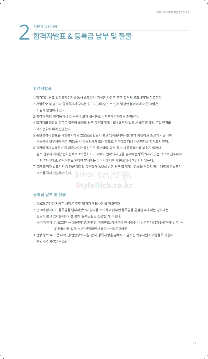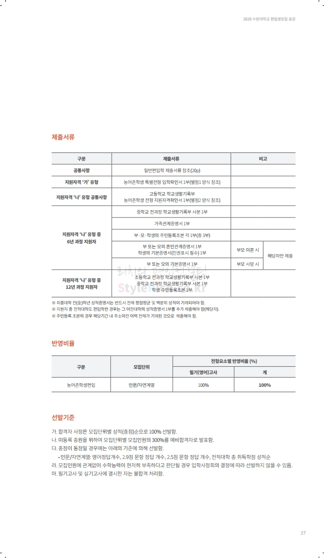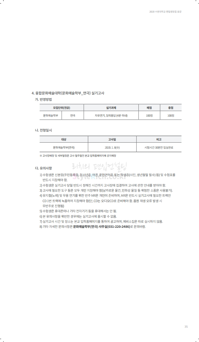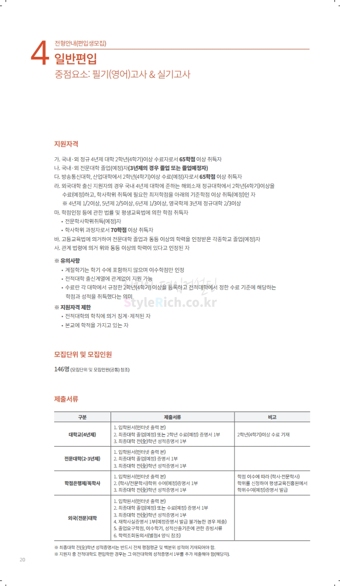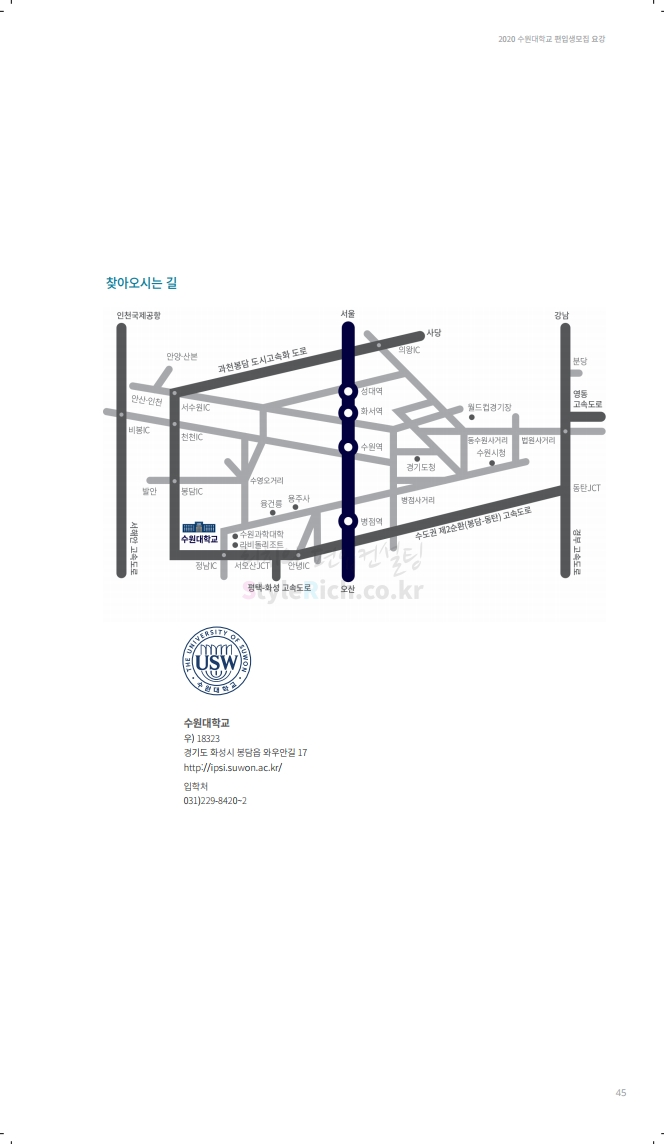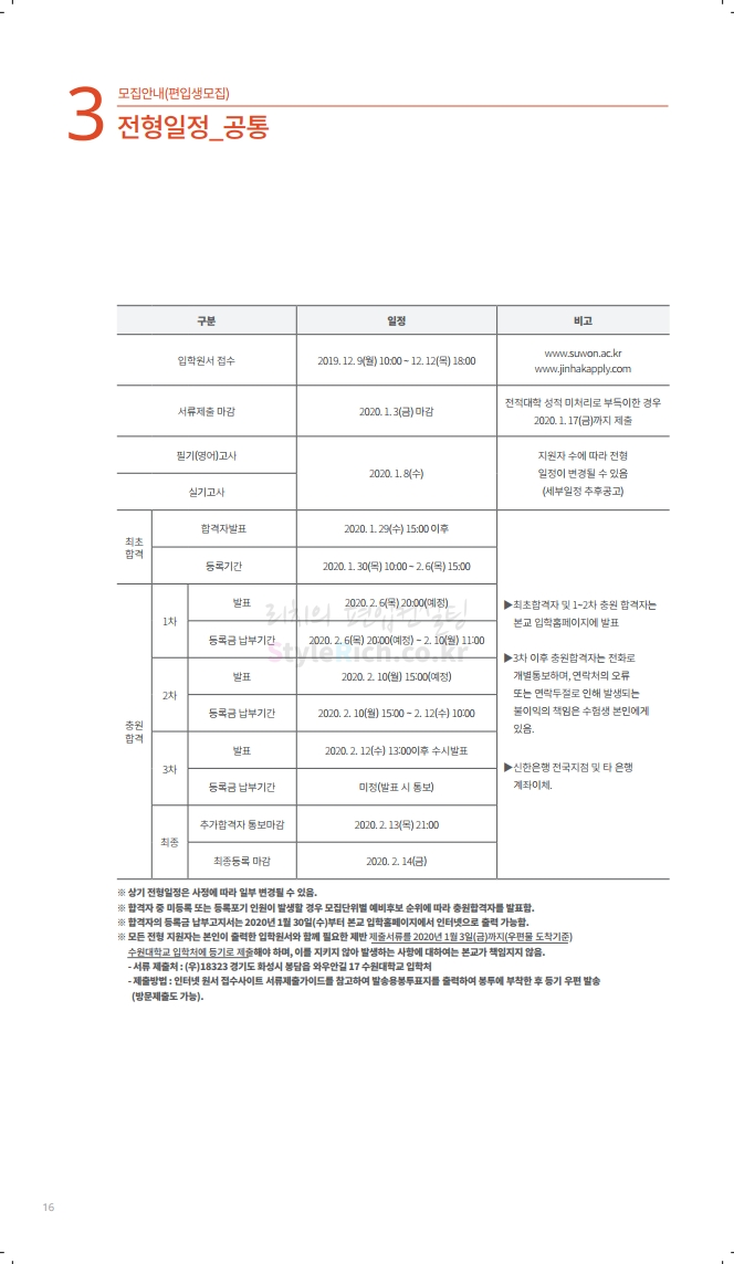 수원대 편입 2020학년도 모집요강 간편하게 보자 2019.12.07 02:46 편입 모집요강/2020학년도 모집요강 2020학년도 수원대 편입 모집요강을 간편하게 확인하세요. PC와 모바일 모두에서 이미지를 클릭(터치) 후 이미지의 좌우측을 각각 클릭하면 모집요강 순서를 앞뒤로 넘길 수 있습니다. 좌측 클릭(터치)는 이전 페이지, 우측 클릭(터치)는 다음 페이지입니다. * 최종 모집요강 발표 후에도 일부 내용이 변경될 수 있으니 지원 전 반드시 수원대 입학처의 모집요강을 확인하시기 바랍니다. 2020학년도 수원대 편입 모집요강 다운받기 usw_2020_transfer.pdf 3.17MB <출처: 수원대 홈페이지> [VLOG] 수원대학교 가을축제 너나들이 브이로그 공유하기 게시글 관리 리치의 편입컨설팅 저작자표시 비영리 변경금지 (새창열림) '편입 모집요강 > 2020학년도 모집요강' 카테고리의 다른 글 한양대(ERICA) 편입 2020학년도 모집요강 간편하게 보자 (0) 2019.12.09 경희대 편입 2020학년도 모집요강 간편하게 보자 (0) 2019.12.09 연세대(미래) 편입 2020학년도 모집요강 간편하게 보자 (0) 2019.12.07 한국산업기술대 편입 2020학년도 모집요강 간편하게 보자 (0) 2019.12.07 숙명여대 편입 2020학년도 모집요강 간편하게 보자 (0) 2019.12.07 댓글 공유하기 다른 글 댓글 이 글 공유하기 구독하기 구독하기 카카오톡 카카오톡 라인 라인 트위터 트위터 Facebook Facebook 카카오스토리 카카오스토리 밴드 밴드 네이버 블로그 네이버 블로그 Pocket Pocket Evernote Evernote 다른 글 한양대(ERICA) 편입 2020학년도 모집요강 간편하게 보자 한양대(ERICA) 편입 2020학년도 모집요강 간편하게 보자 2019.12.09 경희대 편입 2020학년도 모집요강 간편하게 보자 경희대 편입 2020학년도 모집요강 간편하게 보자 2019.12.09 연세대(미래) 편입 2020학년도 모집요강 간편하게 보자 연세대(미래) 편입 2020학년도 모집요강 간편하게 보자 2019.12.07 한국산업기술대 편입 2020학년도 모집요강 간편하게 보자 한국산업기술대 편입 2020학년도 모집요강 간편하게 보자 2019.12.07 다른 글 더 둘러보기