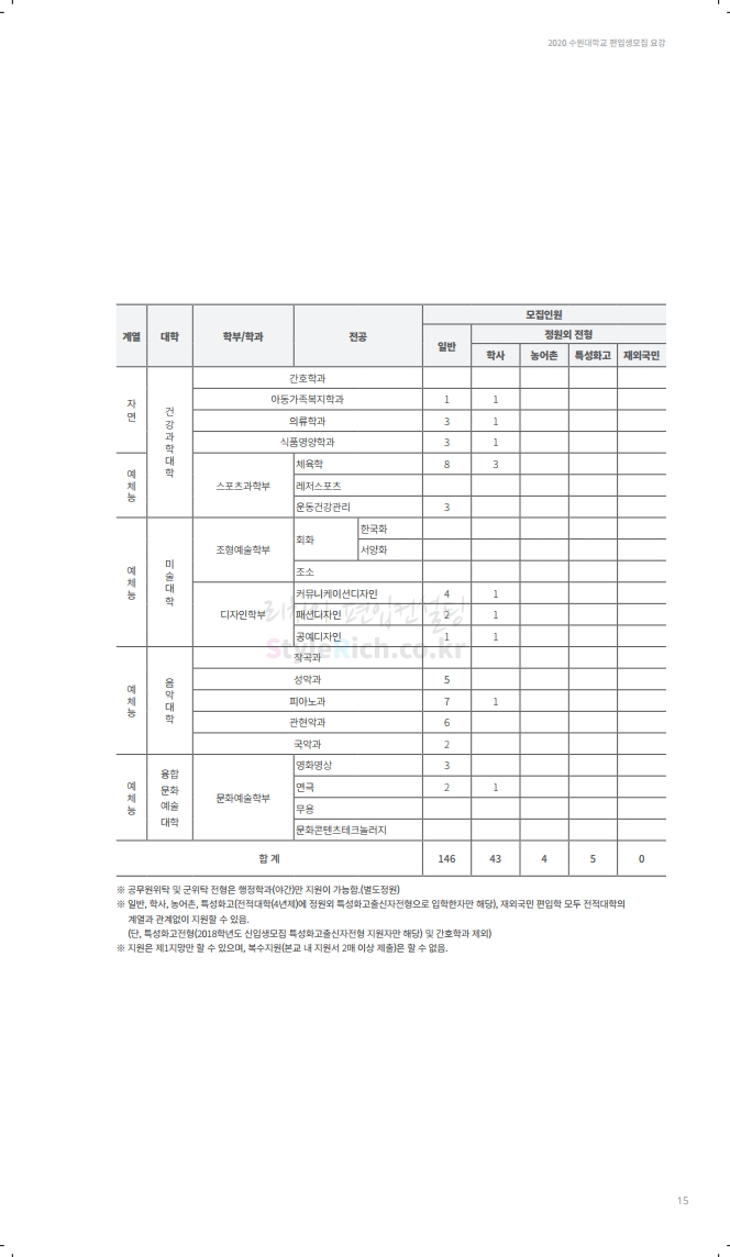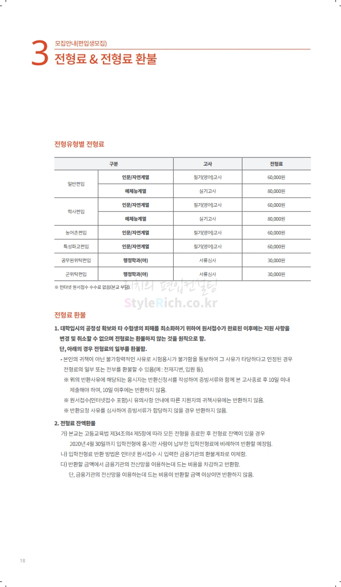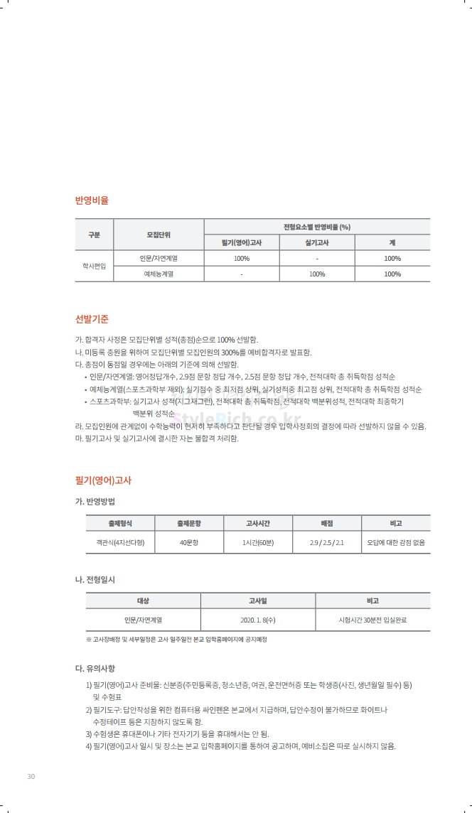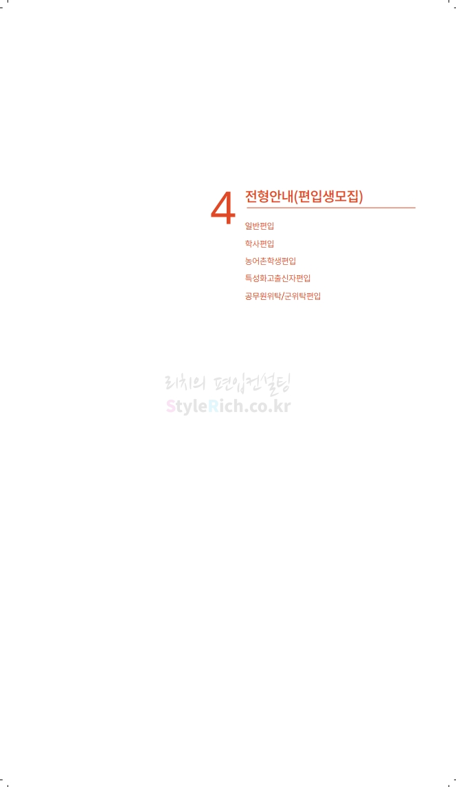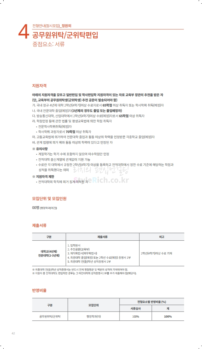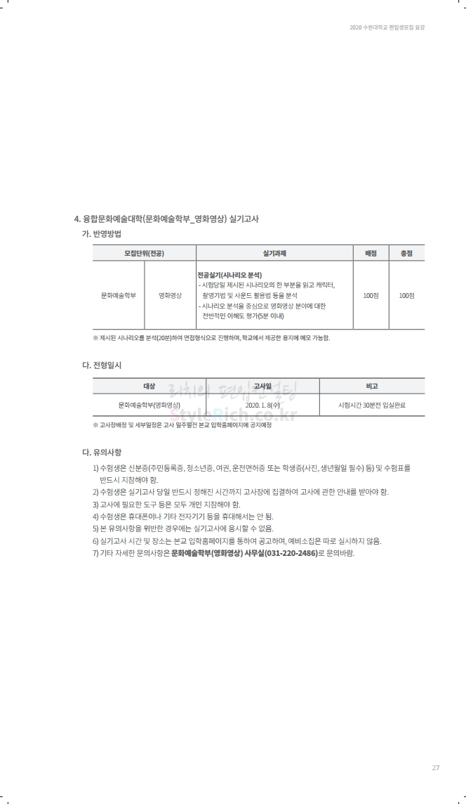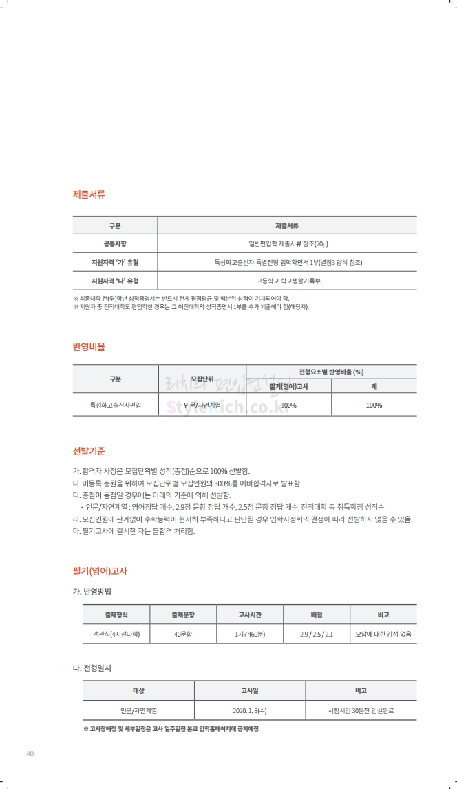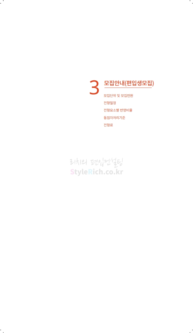 수원대 편입 2020학년도 모집요강 간편하게 보자 2019.12.07 02:46 편입 모집요강/2020학년도 모집요강 2020학년도 수원대 편입 모집요강을 간편하게 확인하세요. PC와 모바일 모두에서 이미지를 클릭(터치) 후 이미지의 좌우측을 각각 클릭하면 모집요강 순서를 앞뒤로 넘길 수 있습니다. 좌측 클릭(터치)는 이전 페이지, 우측 클릭(터치)는 다음 페이지입니다. * 최종 모집요강 발표 후에도 일부 내용이 변경될 수 있으니 지원 전 반드시 수원대 입학처의 모집요강을 확인하시기 바랍니다. 2020학년도 수원대 편입 모집요강 다운받기 usw_2020_transfer.pdf 3.17MB <출처: 수원대 홈페이지> [VLOG] 수원대학교 가을축제 너나들이 브이로그 공유하기 게시글 관리 리치의 편입컨설팅 저작자표시 비영리 변경금지 (새창열림) '편입 모집요강 > 2020학년도 모집요강' 카테고리의 다른 글 한양대(ERICA) 편입 2020학년도 모집요강 간편하게 보자 (0) 2019.12.09 경희대 편입 2020학년도 모집요강 간편하게 보자 (0) 2019.12.09 연세대(미래) 편입 2020학년도 모집요강 간편하게 보자 (0) 2019.12.07 한국산업기술대 편입 2020학년도 모집요강 간편하게 보자 (0) 2019.12.07 숙명여대 편입 2020학년도 모집요강 간편하게 보자 (0) 2019.12.07 댓글 공유하기 다른 글 댓글 이 글 공유하기 구독하기 구독하기 카카오톡 카카오톡 라인 라인 트위터 트위터 Facebook Facebook 카카오스토리 카카오스토리 밴드 밴드 네이버 블로그 네이버 블로그 Pocket Pocket Evernote Evernote 다른 글 한양대(ERICA) 편입 2020학년도 모집요강 간편하게 보자 한양대(ERICA) 편입 2020학년도 모집요강 간편하게 보자 2019.12.09 경희대 편입 2020학년도 모집요강 간편하게 보자 경희대 편입 2020학년도 모집요강 간편하게 보자 2019.12.09 연세대(미래) 편입 2020학년도 모집요강 간편하게 보자 연세대(미래) 편입 2020학년도 모집요강 간편하게 보자 2019.12.07 한국산업기술대 편입 2020학년도 모집요강 간편하게 보자 한국산업기술대 편입 2020학년도 모집요강 간편하게 보자 2019.12.07 다른 글 더 둘러보기