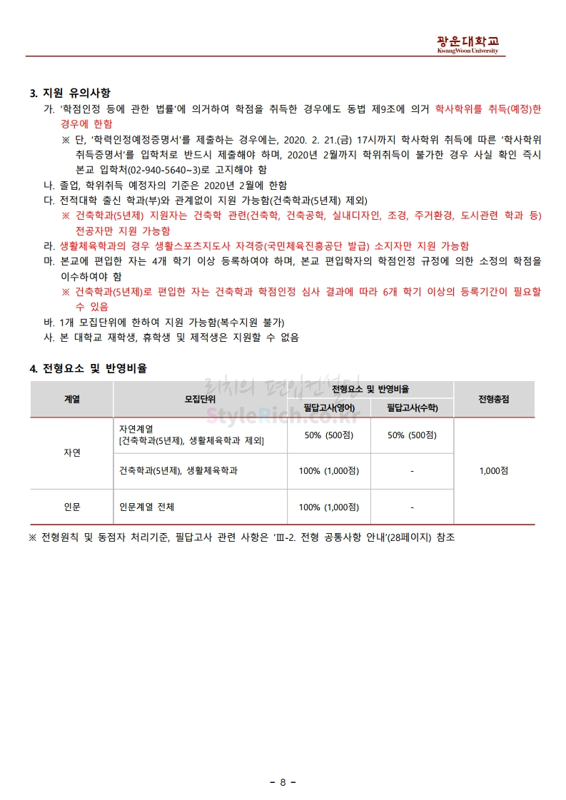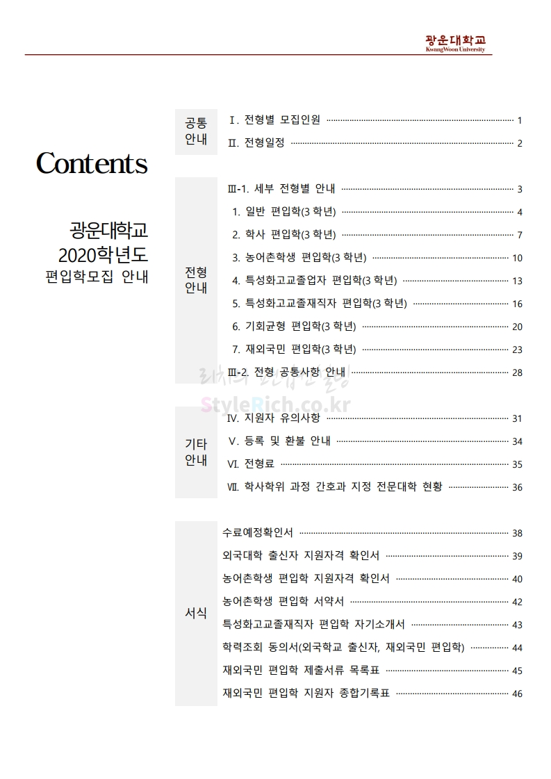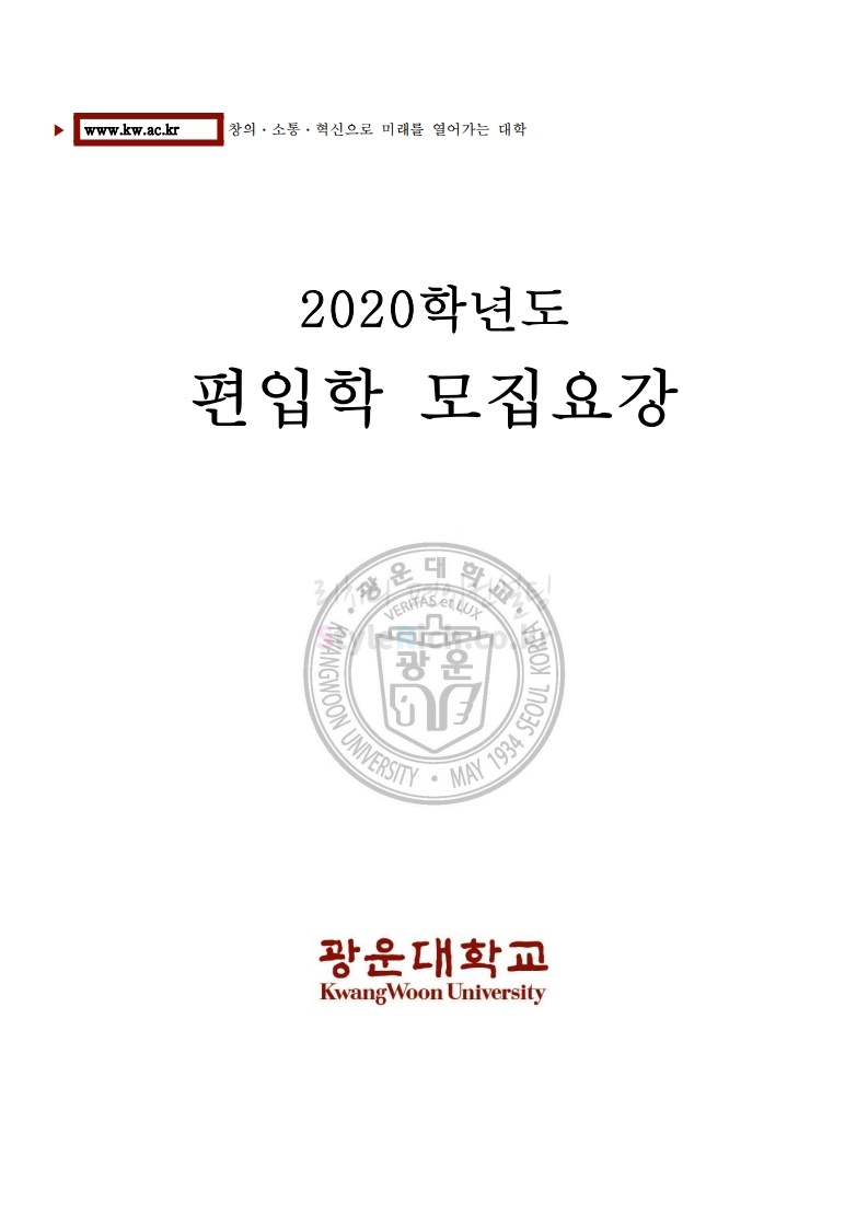 광운대 편입 2020학년도 모집요강 간편하게 보자 2019.12.11 03:18 편입 모집요강/2020학년도 모집요강 2020학년도 광운대 편입 모집요강을 간편하게 확인하세요. PC와 모바일 모두에서 이미지를 클릭(터치) 후 이미지의 좌우측을 각각 클릭하면 모집요강 순서를 앞뒤로 넘길 수 있습니다. 좌측 클릭(터치)는 이전 페이지, 우측 클릭(터치)는 다음 페이지입니다. * 최종 모집요강 발표 후에도 일부 내용이 변경될 수 있으니 지원 전 반드시 광운대 입학처의 모집요강을 확인하시기 바랍니다. 2020학년도 광운대 편입 모집요강 다운받기 2020_pyunip.pdf 1.67MB <출처: 광운대 홈페이지> 광운뉴스 154회 따스한 감성 영화 추천 #광운대학교 공유하기 게시글 관리 리치의 편입컨설팅 저작자표시 비영리 변경금지 (새창열림) '편입 모집요강 > 2020학년도 모집요강' 카테고리의 다른 글 가톨릭대 편입 2020학년도 모집요강 간편하게 보자 (0) 2019.12.12 아주대 편입 2020학년도 모집요강 간편하게 보자 (0) 2019.12.11 홍익대 편입 2020학년도 모집요강 간편하게 보자 (0) 2019.12.11 인하대 편입 2020학년도 모집요강 간편하게 보자 (0) 2019.12.11 서울시립대 편입 2020학년도 모집요강 간편하게 보자(12/4 수정기준) (0) 2019.12.11 댓글 공유하기 다른 글 댓글 이 글 공유하기 구독하기 구독하기 카카오톡 카카오톡 라인 라인 트위터 트위터 Facebook Facebook 카카오스토리 카카오스토리 밴드 밴드 네이버 블로그 네이버 블로그 Pocket Pocket Evernote Evernote 다른 글 가톨릭대 편입 2020학년도 모집요강 간편하게 보자 가톨릭대 편입 2020학년도 모집요강 간편하게 보자 2019.12.12 아주대 편입 2020학년도 모집요강 간편하게 보자 아주대 편입 2020학년도 모집요강 간편하게 보자 2019.12.11 홍익대 편입 2020학년도 모집요강 간편하게 보자 홍익대 편입 2020학년도 모집요강 간편하게 보자 2019.12.11 인하대 편입 2020학년도 모집요강 간편하게 보자 인하대 편입 2020학년도 모집요강 간편하게 보자 2019.12.11 다른 글 더 둘러보기