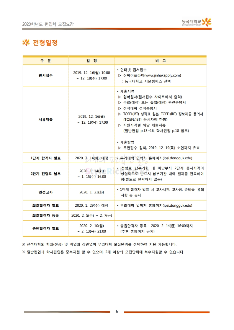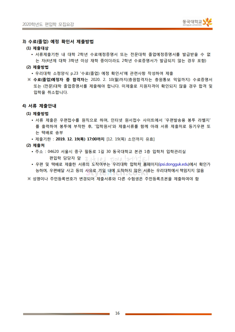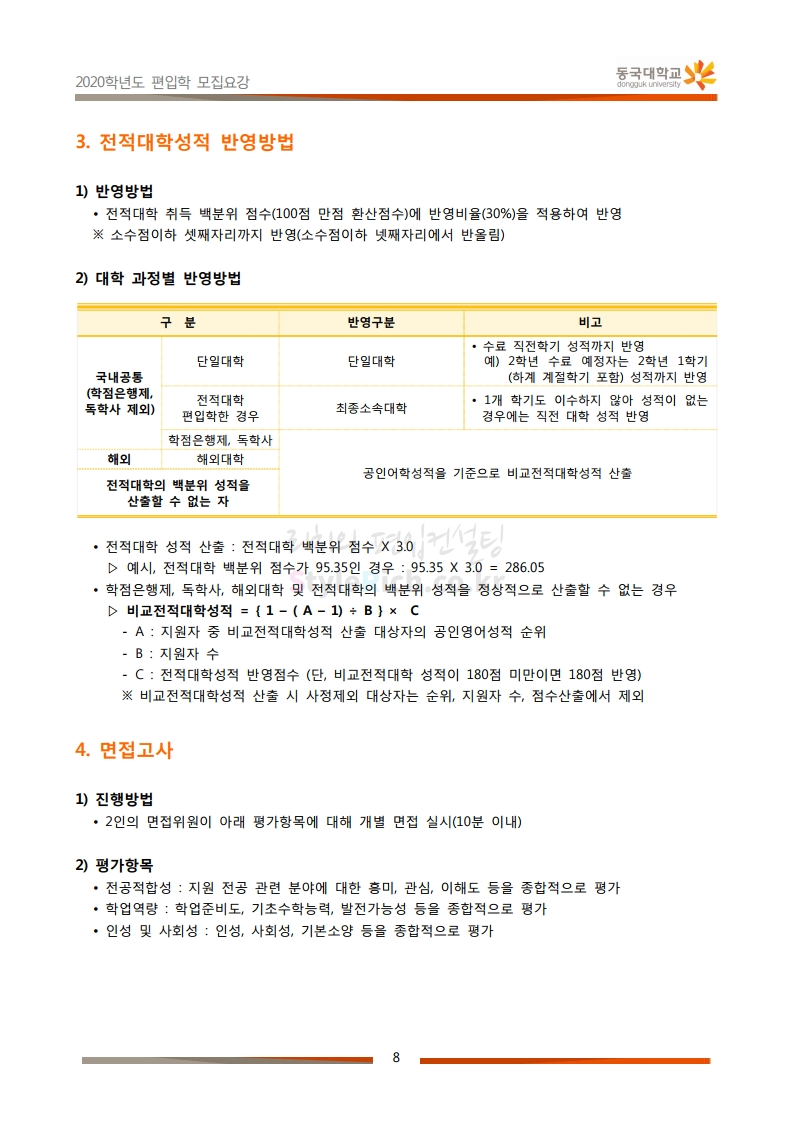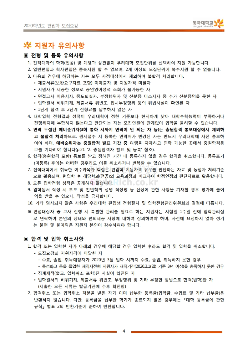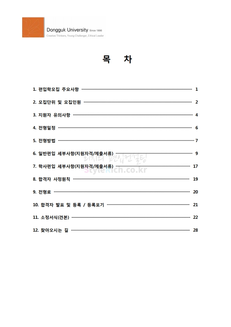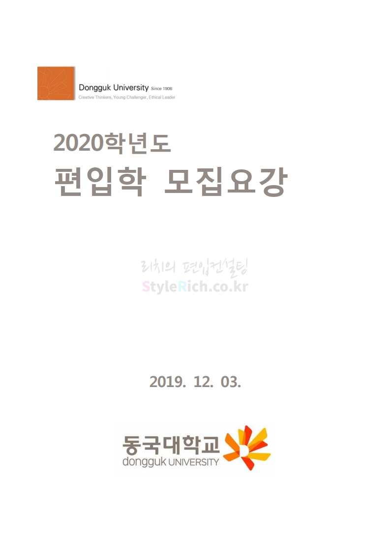 동국대 편입 2020학년도 모집요강 간편하게 보자 2019.12.12 02:07 편입 모집요강/2020학년도 모집요강 2020학년도 동국대 편입 모집요강을 간편하게 확인하세요. PC와 모바일 모두에서 이미지를 클릭(터치) 후 이미지의 좌우측을 각각 클릭하면 모집요강 순서를 앞뒤로 넘길 수 있습니다. 좌측 클릭(터치)는 이전 페이지, 우측 클릭(터치)는 다음 페이지입니다. * 최종 모집요강 발표 후에도 일부 내용이 변경될 수 있으니 지원 전 반드시 동국대 입학처의 모집요강을 확인하시기 바랍니다. 2020학년도 동국대 편입 모집요강 다운받기 2020학년도편입학모집요강(배포용).pdf 1.64MB <출처: 동국대 홈페이지> 동국대의 소통공감 홈페이지를 아시나요? 공유하기 게시글 관리 리치의 편입컨설팅 저작자표시 비영리 변경금지 (새창열림) '편입 모집요강 > 2020학년도 모집요강' 카테고리의 다른 글 중앙대 편입 2020학년도 모집요강 간편하게 보자 (0) 2019.12.13 서울과학기술대 편입 2020학년도 모집요강 간편하게 보자 (0) 2019.12.12 동덕여대 편입 2020학년도 모집요강 간편하게 보자 (0) 2019.12.12 가톨릭대 편입 2020학년도 모집요강 간편하게 보자 (0) 2019.12.12 아주대 편입 2020학년도 모집요강 간편하게 보자 (0) 2019.12.11 댓글 공유하기 다른 글 댓글 이 글 공유하기 구독하기 구독하기 카카오톡 카카오톡 라인 라인 트위터 트위터 Facebook Facebook 카카오스토리 카카오스토리 밴드 밴드 네이버 블로그 네이버 블로그 Pocket Pocket Evernote Evernote 다른 글 중앙대 편입 2020학년도 모집요강 간편하게 보자 중앙대 편입 2020학년도 모집요강 간편하게 보자 2019.12.13 서울과학기술대 편입 2020학년도 모집요강 간편하게 보자 서울과학기술대 편입 2020학년도 모집요강 간편하게 보자 2019.12.12 동덕여대 편입 2020학년도 모집요강 간편하게 보자 동덕여대 편입 2020학년도 모집요강 간편하게 보자 2019.12.12 가톨릭대 편입 2020학년도 모집요강 간편하게 보자 가톨릭대 편입 2020학년도 모집요강 간편하게 보자 2019.12.12 다른 글 더 둘러보기