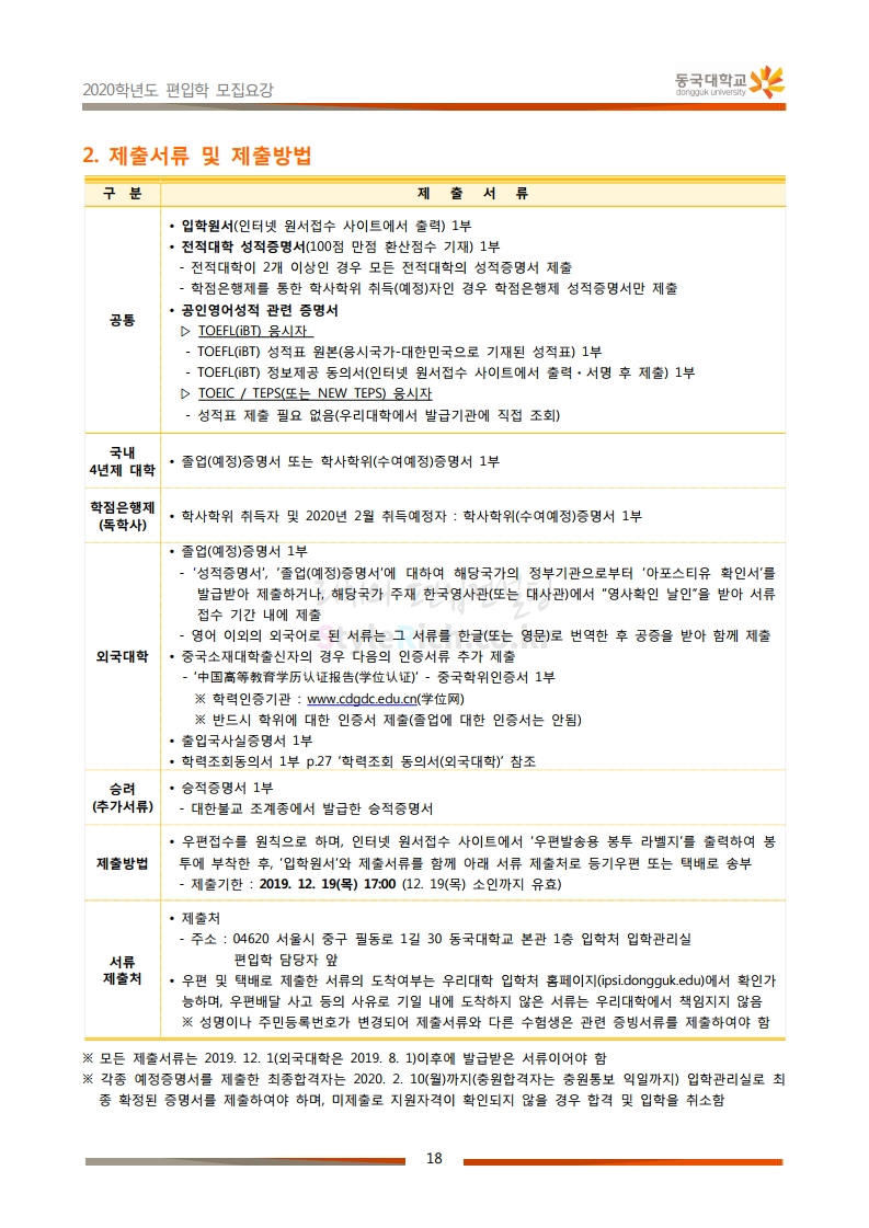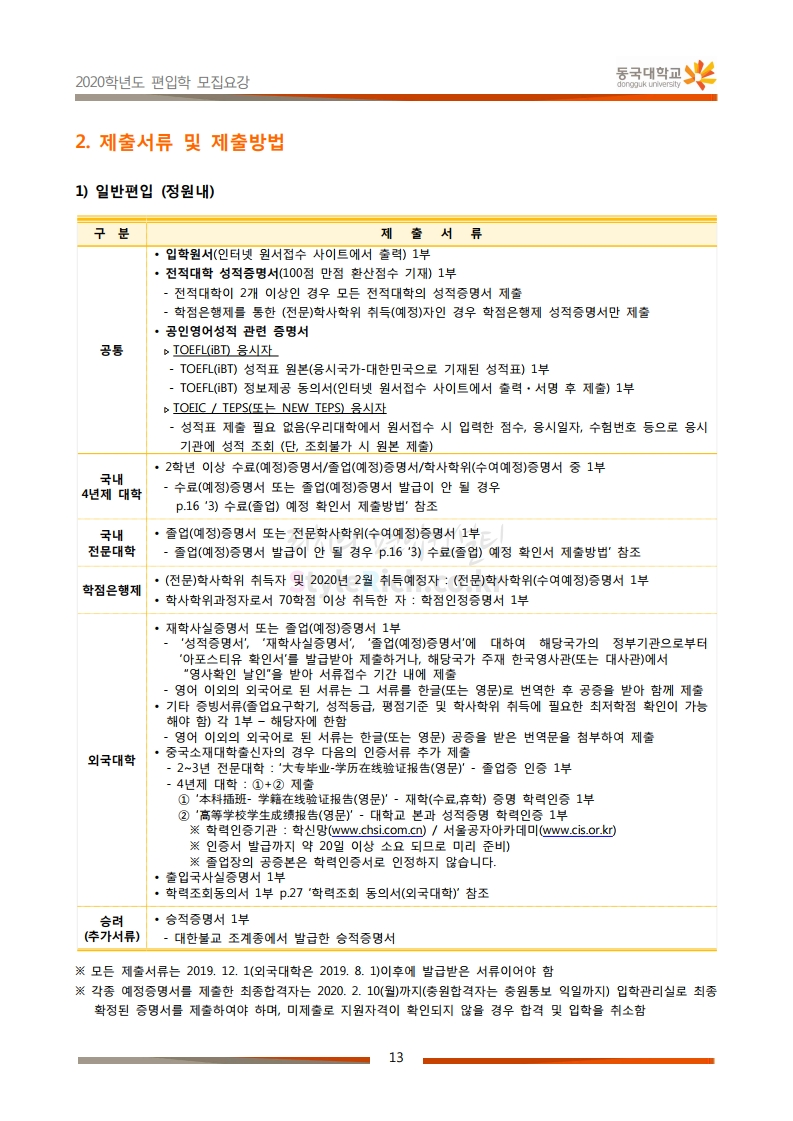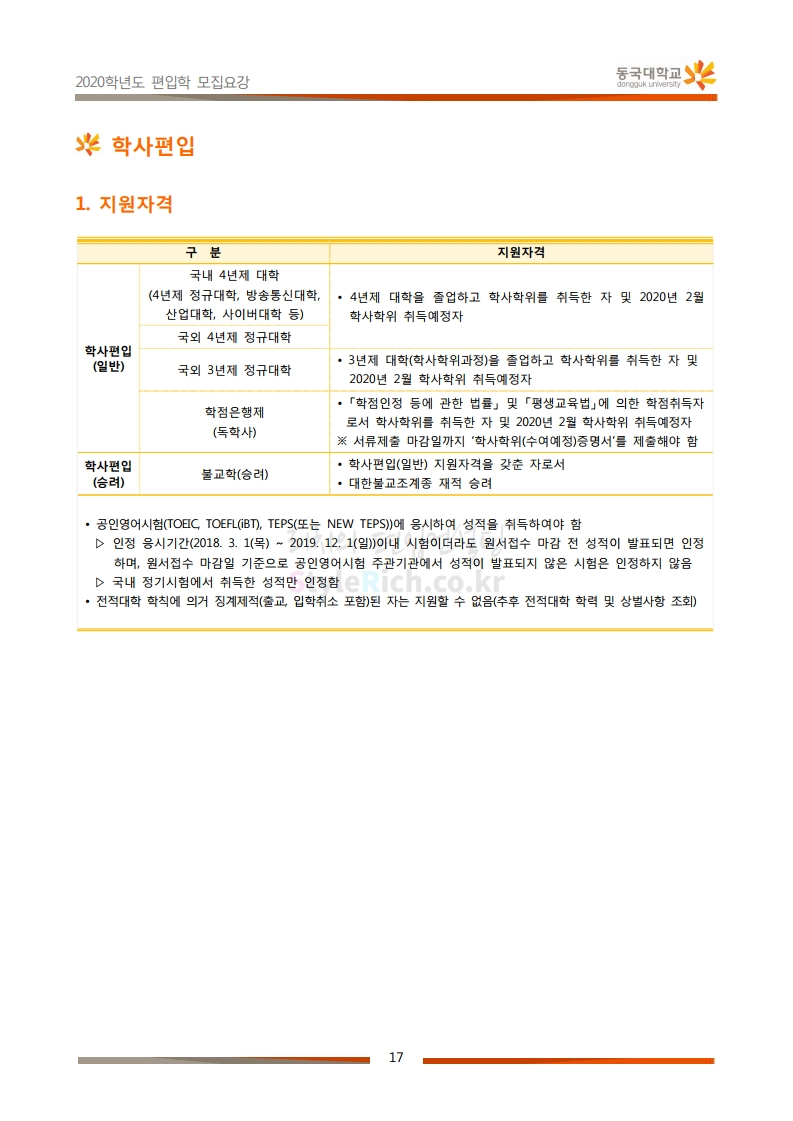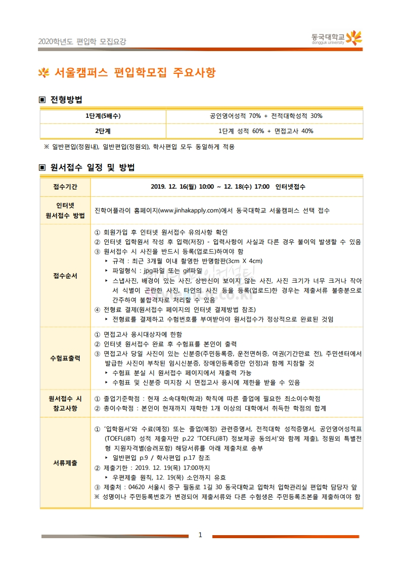 동국대 편입 2020학년도 모집요강 간편하게 보자 2019.12.12 02:07 편입 모집요강/2020학년도 모집요강 2020학년도 동국대 편입 모집요강을 간편하게 확인하세요. PC와 모바일 모두에서 이미지를 클릭(터치) 후 이미지의 좌우측을 각각 클릭하면 모집요강 순서를 앞뒤로 넘길 수 있습니다. 좌측 클릭(터치)는 이전 페이지, 우측 클릭(터치)는 다음 페이지입니다. * 최종 모집요강 발표 후에도 일부 내용이 변경될 수 있으니 지원 전 반드시 동국대 입학처의 모집요강을 확인하시기 바랍니다. 2020학년도 동국대 편입 모집요강 다운받기 2020학년도편입학모집요강(배포용).pdf 1.64MB <출처: 동국대 홈페이지> 동국대의 소통공감 홈페이지를 아시나요? 공유하기 게시글 관리 리치의 편입컨설팅 저작자표시 비영리 변경금지 (새창열림) '편입 모집요강 > 2020학년도 모집요강' 카테고리의 다른 글 중앙대 편입 2020학년도 모집요강 간편하게 보자 (0) 2019.12.13 서울과학기술대 편입 2020학년도 모집요강 간편하게 보자 (0) 2019.12.12 동덕여대 편입 2020학년도 모집요강 간편하게 보자 (0) 2019.12.12 가톨릭대 편입 2020학년도 모집요강 간편하게 보자 (0) 2019.12.12 아주대 편입 2020학년도 모집요강 간편하게 보자 (0) 2019.12.11 댓글 공유하기 다른 글 댓글 이 글 공유하기 구독하기 구독하기 카카오톡 카카오톡 라인 라인 트위터 트위터 Facebook Facebook 카카오스토리 카카오스토리 밴드 밴드 네이버 블로그 네이버 블로그 Pocket Pocket Evernote Evernote 다른 글 중앙대 편입 2020학년도 모집요강 간편하게 보자 중앙대 편입 2020학년도 모집요강 간편하게 보자 2019.12.13 서울과학기술대 편입 2020학년도 모집요강 간편하게 보자 서울과학기술대 편입 2020학년도 모집요강 간편하게 보자 2019.12.12 동덕여대 편입 2020학년도 모집요강 간편하게 보자 동덕여대 편입 2020학년도 모집요강 간편하게 보자 2019.12.12 가톨릭대 편입 2020학년도 모집요강 간편하게 보자 가톨릭대 편입 2020학년도 모집요강 간편하게 보자 2019.12.12 다른 글 더 둘러보기