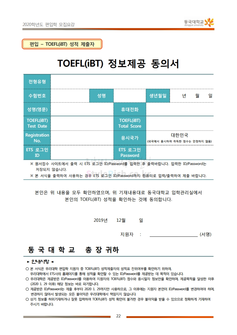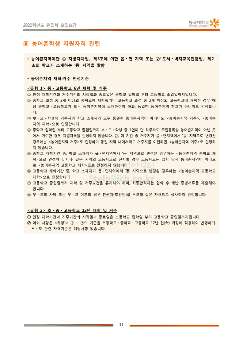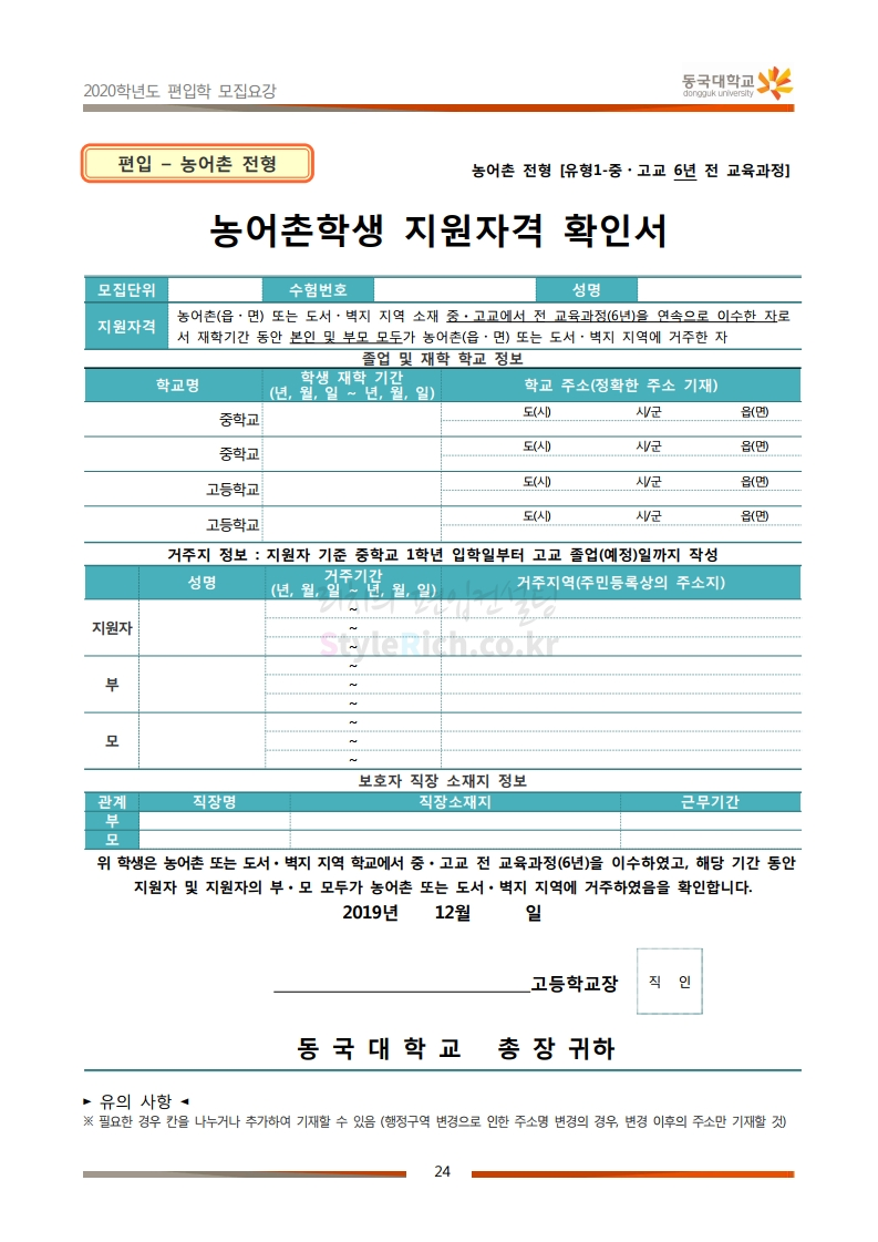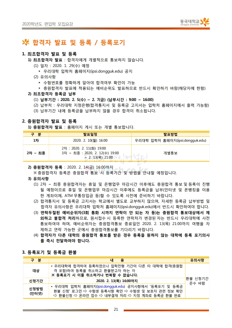 동국대 편입 2020학년도 모집요강 간편하게 보자 2019.12.12 02:07 편입 모집요강/2020학년도 모집요강 2020학년도 동국대 편입 모집요강을 간편하게 확인하세요. PC와 모바일 모두에서 이미지를 클릭(터치) 후 이미지의 좌우측을 각각 클릭하면 모집요강 순서를 앞뒤로 넘길 수 있습니다. 좌측 클릭(터치)는 이전 페이지, 우측 클릭(터치)는 다음 페이지입니다. * 최종 모집요강 발표 후에도 일부 내용이 변경될 수 있으니 지원 전 반드시 동국대 입학처의 모집요강을 확인하시기 바랍니다. 2020학년도 동국대 편입 모집요강 다운받기 2020학년도편입학모집요강(배포용).pdf 1.64MB <출처: 동국대 홈페이지> 동국대의 소통공감 홈페이지를 아시나요? 공유하기 게시글 관리 리치의 편입컨설팅 저작자표시 비영리 변경금지 (새창열림) '편입 모집요강 > 2020학년도 모집요강' 카테고리의 다른 글 중앙대 편입 2020학년도 모집요강 간편하게 보자 (0) 2019.12.13 서울과학기술대 편입 2020학년도 모집요강 간편하게 보자 (0) 2019.12.12 동덕여대 편입 2020학년도 모집요강 간편하게 보자 (0) 2019.12.12 가톨릭대 편입 2020학년도 모집요강 간편하게 보자 (0) 2019.12.12 아주대 편입 2020학년도 모집요강 간편하게 보자 (0) 2019.12.11 댓글 공유하기 다른 글 댓글 이 글 공유하기 구독하기 구독하기 카카오톡 카카오톡 라인 라인 트위터 트위터 Facebook Facebook 카카오스토리 카카오스토리 밴드 밴드 네이버 블로그 네이버 블로그 Pocket Pocket Evernote Evernote 다른 글 중앙대 편입 2020학년도 모집요강 간편하게 보자 중앙대 편입 2020학년도 모집요강 간편하게 보자 2019.12.13 서울과학기술대 편입 2020학년도 모집요강 간편하게 보자 서울과학기술대 편입 2020학년도 모집요강 간편하게 보자 2019.12.12 동덕여대 편입 2020학년도 모집요강 간편하게 보자 동덕여대 편입 2020학년도 모집요강 간편하게 보자 2019.12.12 가톨릭대 편입 2020학년도 모집요강 간편하게 보자 가톨릭대 편입 2020학년도 모집요강 간편하게 보자 2019.12.12 다른 글 더 둘러보기
