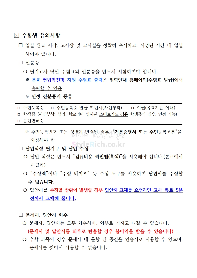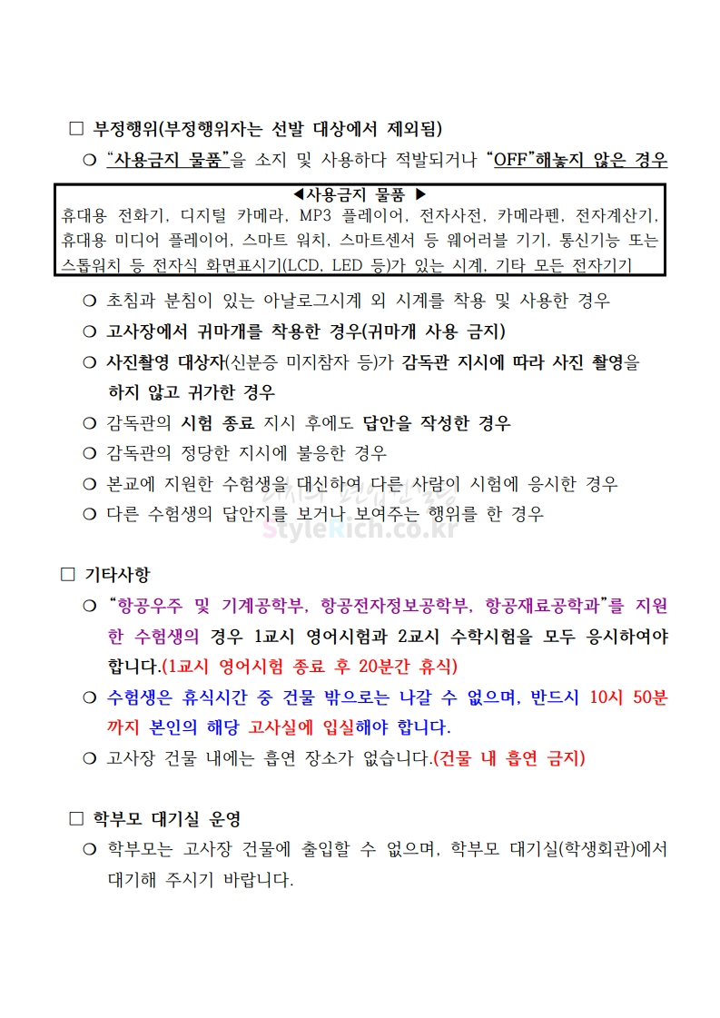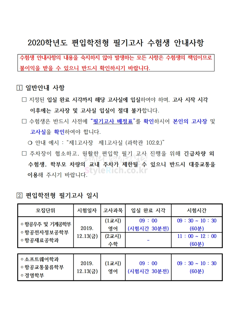 한국항공대 편입 2020학년도 필기고사 안내사항 간편하게 보자 2019.12.12 03:29 편입 유의사항/2020학년도 유의사항 2020학년도 한국항공대 편입 필기고사 안내사항을 살펴보겠습니다. ※ 내용 일부가 변경되거나 오표기가 있을 수 있으므로 시험 전 반드시 한국항공대 입학처 홈페이지에서 최종적으로 확인 바랍니다. 2020학년도 한국항공대 편입 필기고사 안내사항 다운받기 2020학년도_편입학전형_필기고사_수험생_안내_사항-복사.pdf 0.12MB 2020학년도편입학전형필기고사배정표(수험생공지용).pdf 0.04MB 한국항공대학교 국문 홍보영상 공유하기 게시글 관리 리치의 편입컨설팅 저작자표시 비영리 변경금지 (새창열림) '편입 유의사항 > 2020학년도 유의사항' 카테고리의 다른 글 이화여대 편입 2020학년도 필기고사 안내사항 간편하게 보자 (0) 2019.12.21 연세대 편입 2020학년도 필기고사 안내사항 간편하게 보자 (0) 2019.12.20 숙명여대 편입 2020학년도 필기고사 안내사항 간편하게 보자 (0) 2019.12.20 국민대 편입 2020학년도 필기고사 안내사항 간편하게 보자 (0) 2019.12.14 고려대 편입 2020학년도 필기고사 안내사항 간편하게 보자 (0) 2019.12.14 댓글 공유하기 다른 글 댓글 이 글 공유하기 구독하기 구독하기 카카오톡 카카오톡 라인 라인 트위터 트위터 Facebook Facebook 카카오스토리 카카오스토리 밴드 밴드 네이버 블로그 네이버 블로그 Pocket Pocket Evernote Evernote 다른 글 연세대 편입 2020학년도 필기고사 안내사항 간편하게 보자 연세대 편입 2020학년도 필기고사 안내사항 간편하게 보자 2019.12.20 숙명여대 편입 2020학년도 필기고사 안내사항 간편하게 보자 숙명여대 편입 2020학년도 필기고사 안내사항 간편하게 보자 2019.12.20 국민대 편입 2020학년도 필기고사 안내사항 간편하게 보자 국민대 편입 2020학년도 필기고사 안내사항 간편하게 보자 2019.12.14 고려대 편입 2020학년도 필기고사 안내사항 간편하게 보자 고려대 편입 2020학년도 필기고사 안내사항 간편하게 보자 2019.12.14 다른 글 더 둘러보기