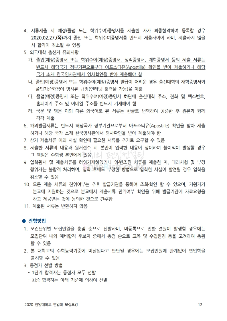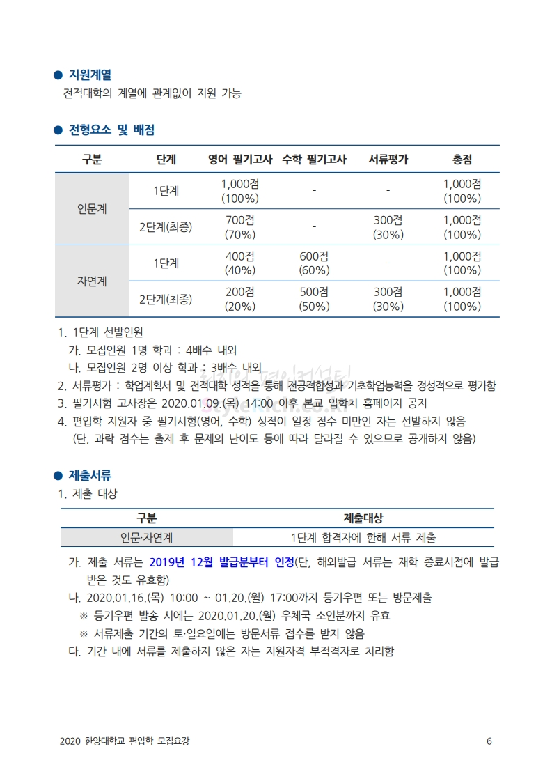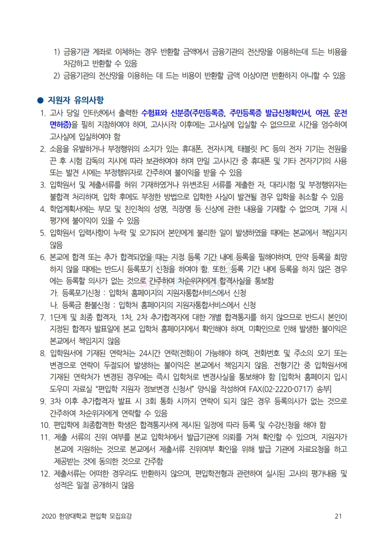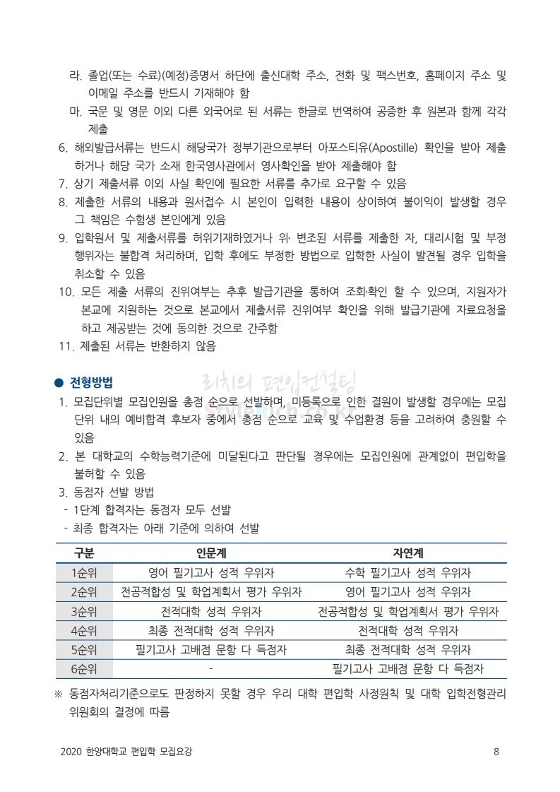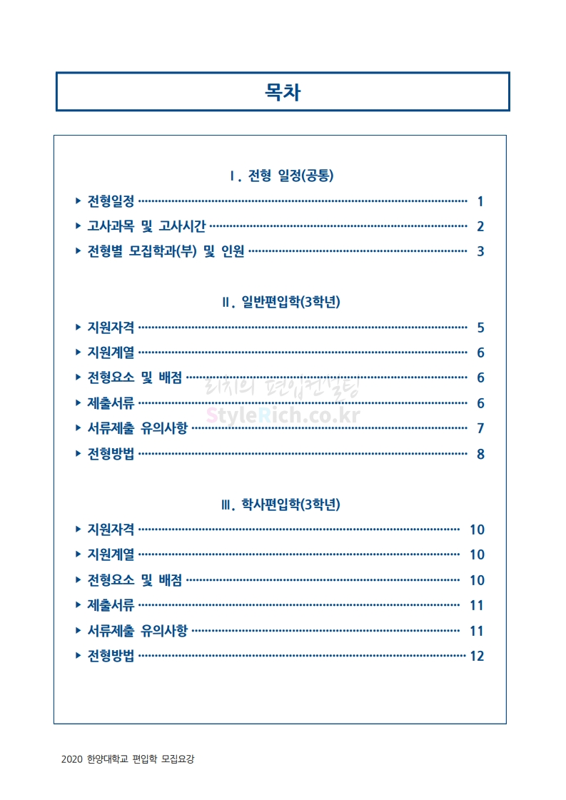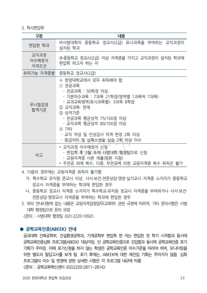 한양대 편입 2020학년도 모집요강 간편하게 보자 2019.12.13 02:52 편입 모집요강/2020학년도 모집요강 2020학년도 한양대 편입 모집요강을 간편하게 확인하세요. PC와 모바일 모두에서 이미지를 클릭(터치) 후 이미지의 좌우측을 각각 클릭하면 모집요강 순서를 앞뒤로 넘길 수 있습니다. 좌측 클릭(터치)는 이전 페이지, 우측 클릭(터치)는 다음 페이지입니다. * 최종 모집요강 발표 후에도 일부 내용이 변경될 수 있으니 지원 전 반드시 한양대 입학처의 모집요강을 확인하시기 바랍니다. 2020학년도 한양대 편입 모집요강 다운받기 93831d81-fbc9-4f73-8a47-82bbc166ad3c.pdf 0.81MB <출처: 한양대 홈페이지> 2019 한양대학교 홍보영상 공유하기 게시글 관리 리치의 편입컨설팅 저작자표시 비영리 변경금지 (새창열림) '편입 모집요강 > 2020학년도 모집요강' 카테고리의 다른 글 세종대 편입 2020학년도 모집요강 간편하게 보자 (0) 2019.12.18 숭실대 편입 2020학년도 모집요강 간편하게 보자 (0) 2019.12.18 중앙대 편입 2020학년도 모집요강 간편하게 보자 (0) 2019.12.13 서울과학기술대 편입 2020학년도 모집요강 간편하게 보자 (0) 2019.12.12 동국대 편입 2020학년도 모집요강 간편하게 보자 (0) 2019.12.12 댓글 공유하기 다른 글 댓글 이 글 공유하기 구독하기 구독하기 카카오톡 카카오톡 라인 라인 트위터 트위터 Facebook Facebook 카카오스토리 카카오스토리 밴드 밴드 네이버 블로그 네이버 블로그 Pocket Pocket Evernote Evernote 다른 글 세종대 편입 2020학년도 모집요강 간편하게 보자 세종대 편입 2020학년도 모집요강 간편하게 보자 2019.12.18 숭실대 편입 2020학년도 모집요강 간편하게 보자 숭실대 편입 2020학년도 모집요강 간편하게 보자 2019.12.18 중앙대 편입 2020학년도 모집요강 간편하게 보자 중앙대 편입 2020학년도 모집요강 간편하게 보자 2019.12.13 서울과학기술대 편입 2020학년도 모집요강 간편하게 보자 서울과학기술대 편입 2020학년도 모집요강 간편하게 보자 2019.12.12 다른 글 더 둘러보기