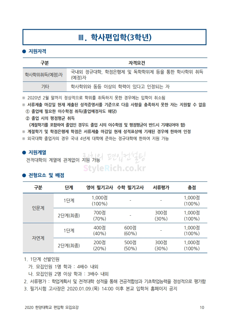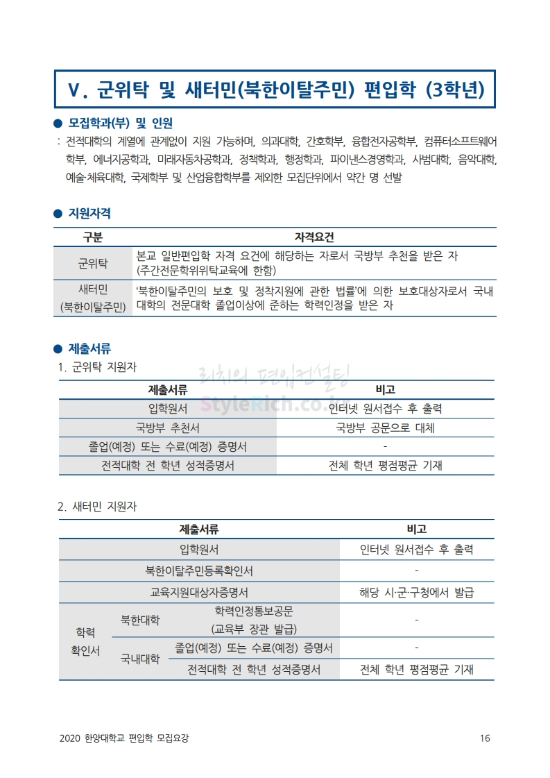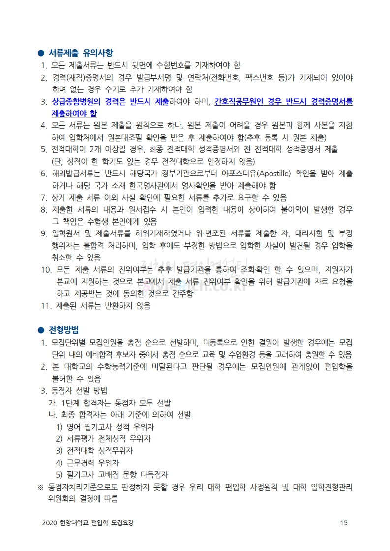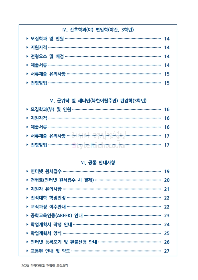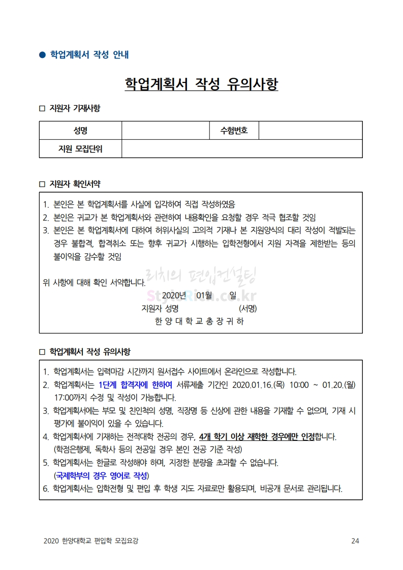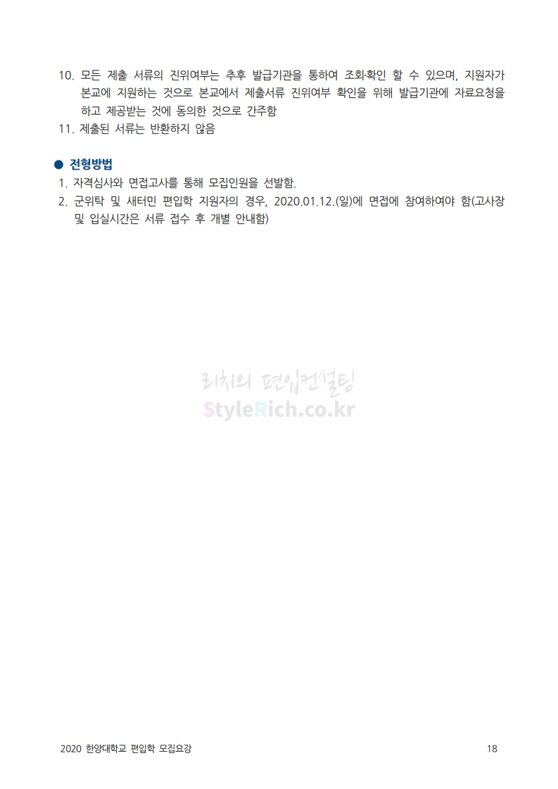 한양대 편입 2020학년도 모집요강 간편하게 보자 2019.12.13 02:52 편입 모집요강/2020학년도 모집요강 2020학년도 한양대 편입 모집요강을 간편하게 확인하세요. PC와 모바일 모두에서 이미지를 클릭(터치) 후 이미지의 좌우측을 각각 클릭하면 모집요강 순서를 앞뒤로 넘길 수 있습니다. 좌측 클릭(터치)는 이전 페이지, 우측 클릭(터치)는 다음 페이지입니다. * 최종 모집요강 발표 후에도 일부 내용이 변경될 수 있으니 지원 전 반드시 한양대 입학처의 모집요강을 확인하시기 바랍니다. 2020학년도 한양대 편입 모집요강 다운받기 93831d81-fbc9-4f73-8a47-82bbc166ad3c.pdf 0.81MB <출처: 한양대 홈페이지> 2019 한양대학교 홍보영상 공유하기 게시글 관리 리치의 편입컨설팅 저작자표시 비영리 변경금지 (새창열림) '편입 모집요강 > 2020학년도 모집요강' 카테고리의 다른 글 세종대 편입 2020학년도 모집요강 간편하게 보자 (0) 2019.12.18 숭실대 편입 2020학년도 모집요강 간편하게 보자 (0) 2019.12.18 중앙대 편입 2020학년도 모집요강 간편하게 보자 (0) 2019.12.13 서울과학기술대 편입 2020학년도 모집요강 간편하게 보자 (0) 2019.12.12 동국대 편입 2020학년도 모집요강 간편하게 보자 (0) 2019.12.12 댓글 공유하기 다른 글 댓글 이 글 공유하기 구독하기 구독하기 카카오톡 카카오톡 라인 라인 트위터 트위터 Facebook Facebook 카카오스토리 카카오스토리 밴드 밴드 네이버 블로그 네이버 블로그 Pocket Pocket Evernote Evernote 다른 글 세종대 편입 2020학년도 모집요강 간편하게 보자 세종대 편입 2020학년도 모집요강 간편하게 보자 2019.12.18 숭실대 편입 2020학년도 모집요강 간편하게 보자 숭실대 편입 2020학년도 모집요강 간편하게 보자 2019.12.18 중앙대 편입 2020학년도 모집요강 간편하게 보자 중앙대 편입 2020학년도 모집요강 간편하게 보자 2019.12.13 서울과학기술대 편입 2020학년도 모집요강 간편하게 보자 서울과학기술대 편입 2020학년도 모집요강 간편하게 보자 2019.12.12 다른 글 더 둘러보기