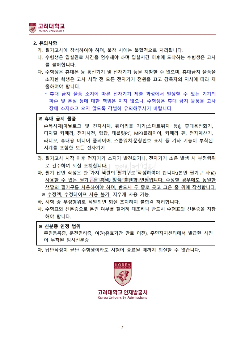 ※ 내용 일부가 변경되거나 오표기가 있을 수 있으므로 시험 전 반드시 고려대 입학처 홈페이지에서 최종적으로 확인 바랍니다.