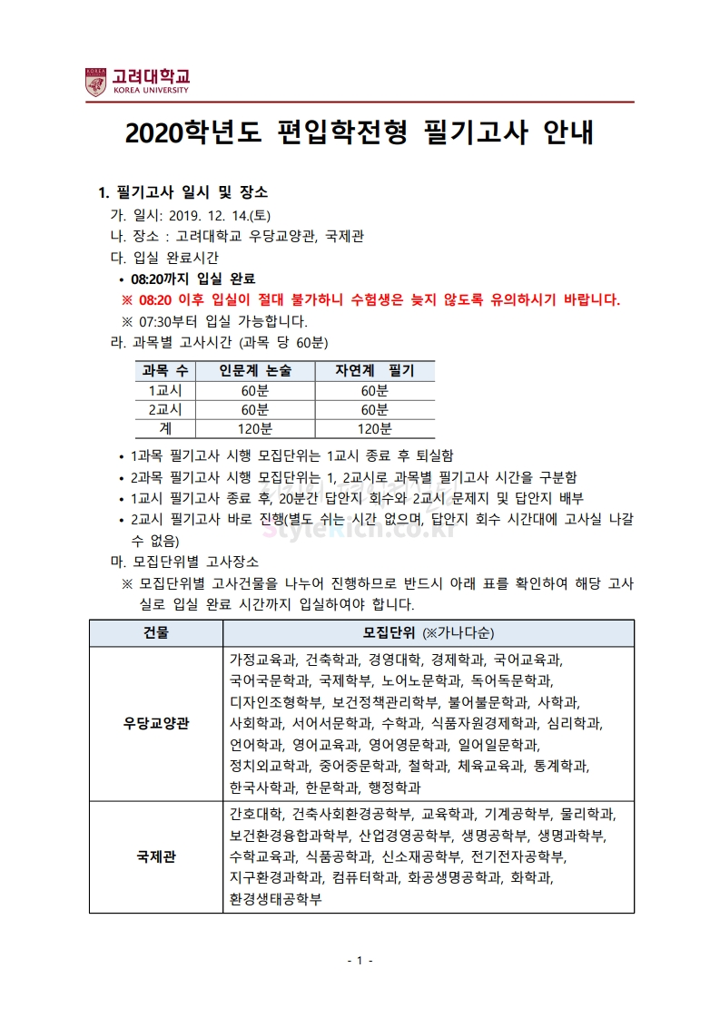 2020학년도 고려대 편입 필기고사 안내사항을 살펴보겠습니다.