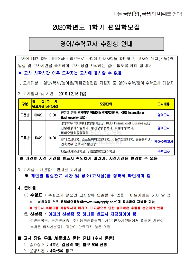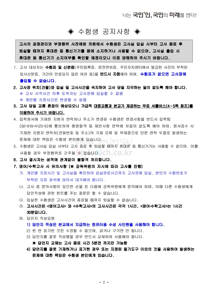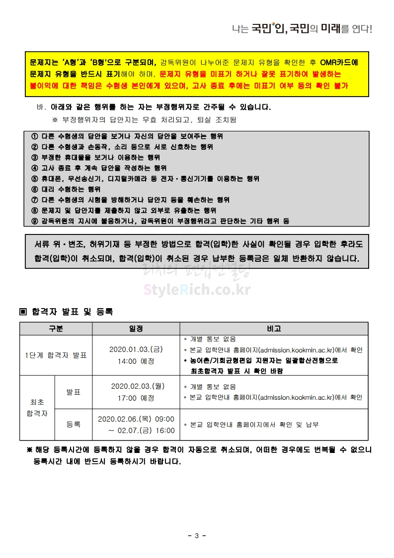 국민대 편입 2020학년도 필기고사 안내사항 간편하게 보자 2019.12.14 00:51 편입 유의사항/2020학년도 유의사항 2020학년도 국민대 편입 필기고사 안내사항을 살펴보겠습니다. ※ 내용 일부가 변경되거나 오표기가 있을 수 있으므로 시험 전 반드시 국민대 입학처 홈페이지에서 최종적으로 확인 바랍니다. 2020학년도 국민대 편입 필기고사 안내사항 다운받기 2020학년도 국민대 편입 필기고사 안내사항.pdf 0.53MB <출처: 국민대 홈페이지> 국민대학교 홍보영상 공유하기 게시글 관리 리치의 편입컨설팅 저작자표시 비영리 변경금지 (새창열림) '편입 유의사항 > 2020학년도 유의사항' 카테고리의 다른 글 이화여대 편입 2020학년도 필기고사 안내사항 간편하게 보자 (0) 2019.12.21 연세대 편입 2020학년도 필기고사 안내사항 간편하게 보자 (0) 2019.12.20 숙명여대 편입 2020학년도 필기고사 안내사항 간편하게 보자 (0) 2019.12.20 고려대 편입 2020학년도 필기고사 안내사항 간편하게 보자 (0) 2019.12.14 한국항공대 편입 2020학년도 필기고사 안내사항 간편하게 보자 (0) 2019.12.12 댓글 공유하기 다른 글 댓글 이 글 공유하기 구독하기 구독하기 카카오톡 카카오톡 라인 라인 트위터 트위터 Facebook Facebook 카카오스토리 카카오스토리 밴드 밴드 네이버 블로그 네이버 블로그 Pocket Pocket Evernote Evernote 다른 글 연세대 편입 2020학년도 필기고사 안내사항 간편하게 보자 연세대 편입 2020학년도 필기고사 안내사항 간편하게 보자 2019.12.20 숙명여대 편입 2020학년도 필기고사 안내사항 간편하게 보자 숙명여대 편입 2020학년도 필기고사 안내사항 간편하게 보자 2019.12.20 고려대 편입 2020학년도 필기고사 안내사항 간편하게 보자 고려대 편입 2020학년도 필기고사 안내사항 간편하게 보자 2019.12.14 한국항공대 편입 2020학년도 필기고사 안내사항 간편하게 보자 한국항공대 편입 2020학년도 필기고사 안내사항 간편하게 보자 2019.12.12 다른 글 더 둘러보기