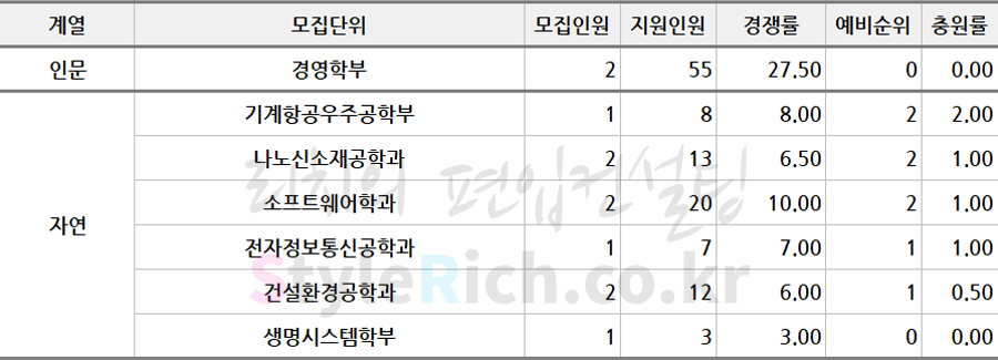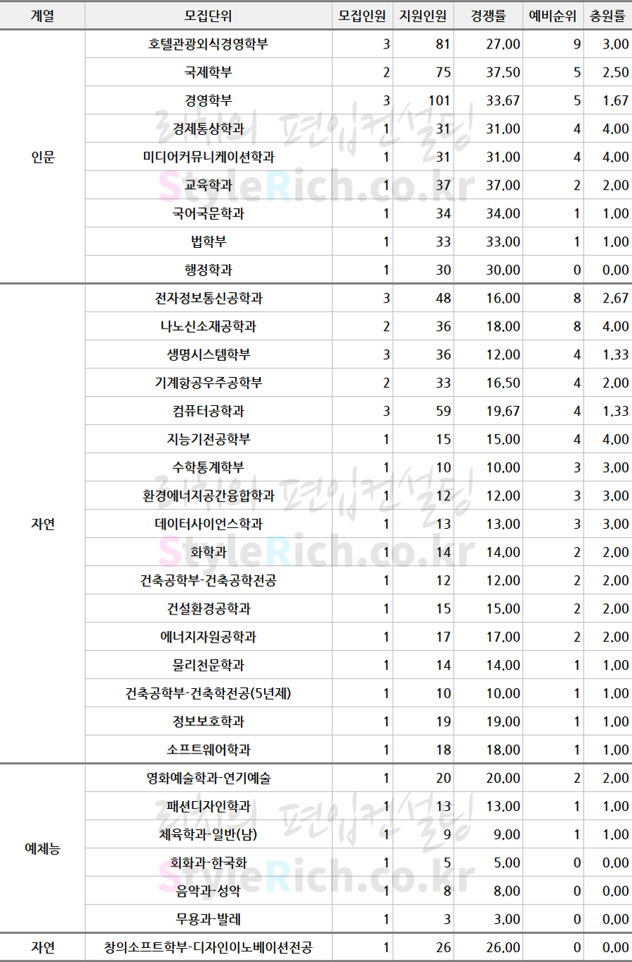 모집단위는 인문, 자연, 예체능, 창의소프트학부로 분류한 후 추가합격이 많은 순으로 정렬