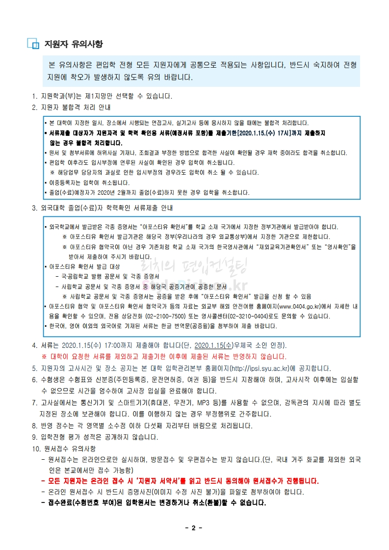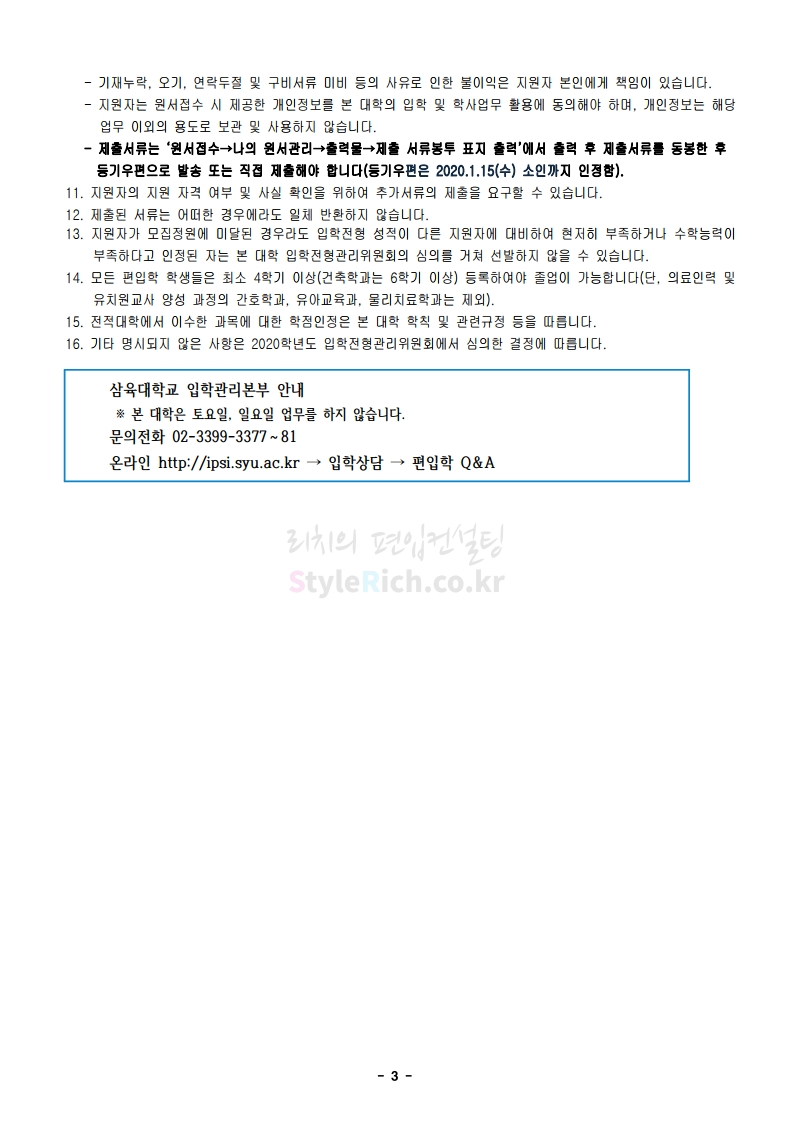 삼육대 편입 2020학년도 모집요강 간편하게 보자 2019.12.20 03:12 편입 모집요강/2020학년도 모집요강 2020학년도 삼육대 편입 모집요강을 간편하게 확인하세요. PC와 모바일 모두에서 이미지를 클릭(터치) 후 이미지의 좌우측을 각각 클릭하면 모집요강 순서를 앞뒤로 넘길 수 있습니다. 좌측 클릭(터치)는 이전 페이지, 우측 클릭(터치)는 다음 페이지입니다. * 최종 모집요강 발표 후에도 일부 내용이 변경될 수 있으니 지원 전 반드시 삼육대 입학처의 모집요강을 확인하시기 바랍니다. 2020학년도 삼육대 편입 모집요강 다운받기 2020학년도-편입학모집요강(201912016).pdf 0.45MB <출처: 삼육대 홈페이지> 삼육대학교 홍보영상 공유하기 게시글 관리 리치의 편입컨설팅 저작자표시 비영리 변경금지 (새창열림) '편입 모집요강 > 2020학년도 모집요강' 카테고리의 다른 글 서강대 편입 2020학년도 자연계열 필기시험(수학) 참고분야를 알아보자 (0) 2019.12.21 성균관대 편입 2020학년도 모집요강 간편하게 보자 (0) 2019.12.20 서강대 편입 2020학년도 모집요강 간편하게 보자 (0) 2019.12.18 세종대 편입 2020학년도 모집요강 간편하게 보자 (0) 2019.12.18 숭실대 편입 2020학년도 모집요강 간편하게 보자 (0) 2019.12.18 댓글 공유하기 다른 글 댓글 이 글 공유하기 구독하기 구독하기 카카오톡 카카오톡 라인 라인 트위터 트위터 Facebook Facebook 카카오스토리 카카오스토리 밴드 밴드 네이버 블로그 네이버 블로그 Pocket Pocket Evernote Evernote 다른 글 서강대 편입 2020학년도 자연계열 필기시험(수학) 참고분야를 알아보자 서강대 편입 2020학년도 자연계열 필기시험(수학) 참고분야를 알아보자 2019.12.21 성균관대 편입 2020학년도 모집요강 간편하게 보자 성균관대 편입 2020학년도 모집요강 간편하게 보자 2019.12.20 서강대 편입 2020학년도 모집요강 간편하게 보자 서강대 편입 2020학년도 모집요강 간편하게 보자 2019.12.18 세종대 편입 2020학년도 모집요강 간편하게 보자 세종대 편입 2020학년도 모집요강 간편하게 보자 2019.12.18 다른 글 더 둘러보기