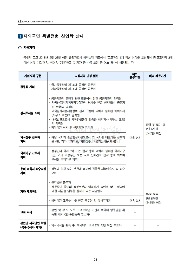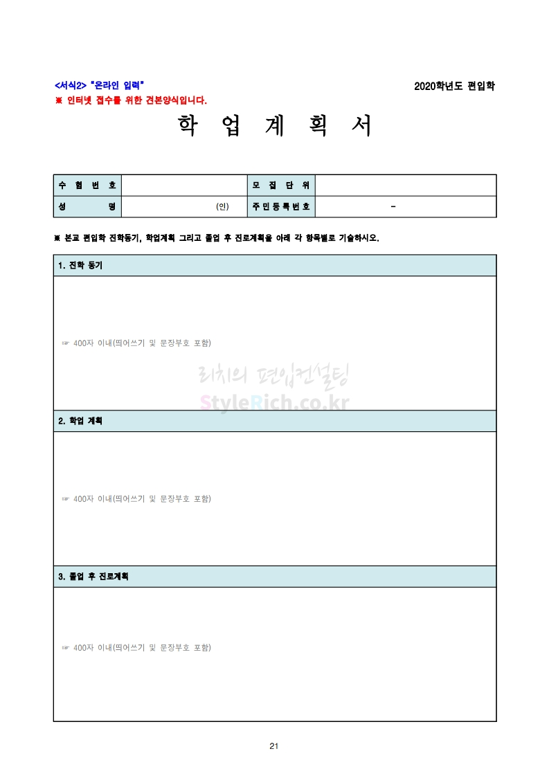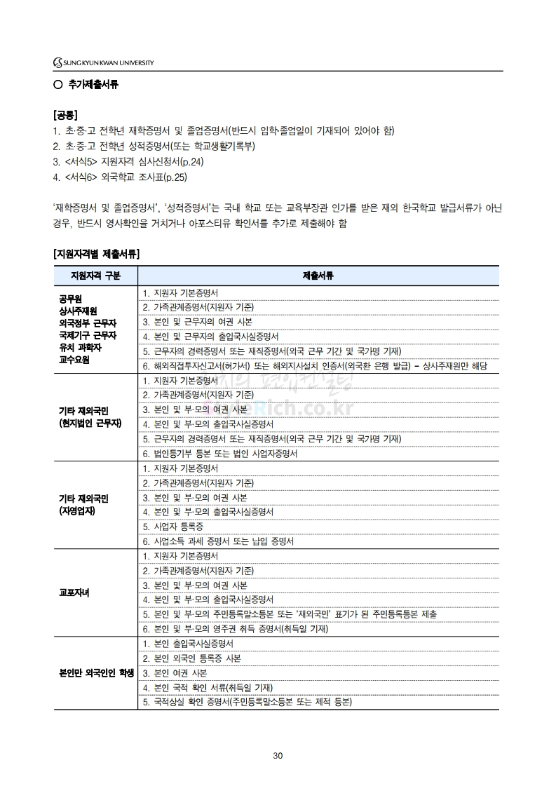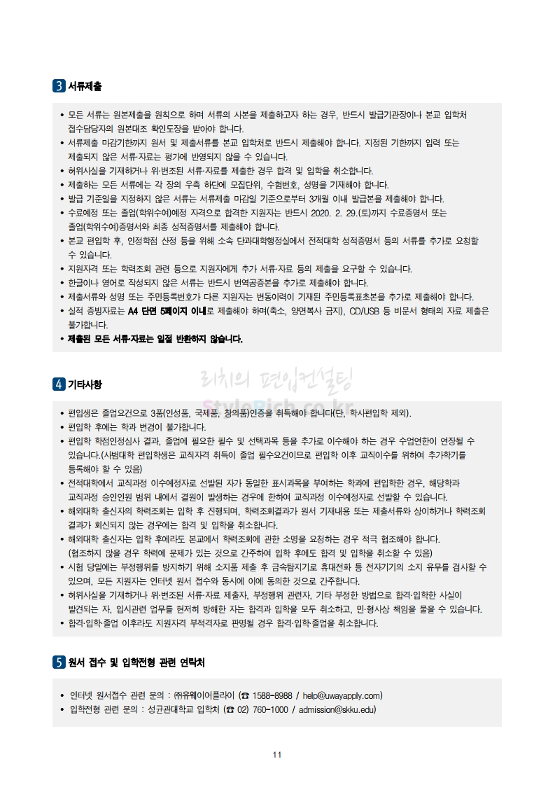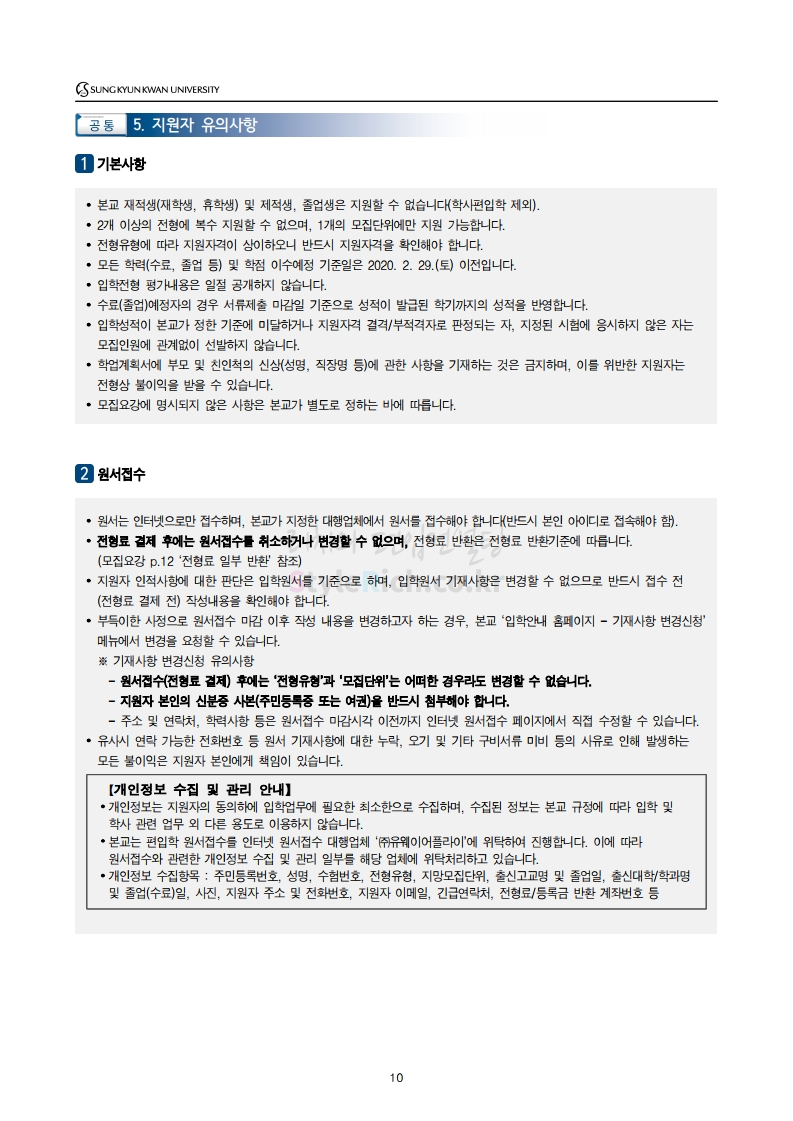 성균관대 편입 2020학년도 모집요강 간편하게 보자 2019.12.20 03:28 편입 모집요강/2020학년도 모집요강 2020학년도 성균관대 편입 모집요강을 간편하게 확인하세요. PC와 모바일 모두에서 이미지를 클릭(터치) 후 이미지의 좌우측을 각각 클릭하면 모집요강 순서를 앞뒤로 넘길 수 있습니다. 좌측 클릭(터치)는 이전 페이지, 우측 클릭(터치)는 다음 페이지입니다. * 최종 모집요강 발표 후에도 일부 내용이 변경될 수 있으니 지원 전 반드시 성균관대 입학처의 모집요강을 확인하시기 바랍니다. 2020학년도 성균관대 편입 모집요강 다운받기 2020학년도 편입학 모집요강.pdf 0.83MB <출처: 성균관대 홈페이지> 성균관대(skku) 홍보 영상 공유하기 게시글 관리 리치의 편입컨설팅 저작자표시 비영리 변경금지 (새창열림) '편입 모집요강 > 2020학년도 모집요강' 카테고리의 다른 글 건국대 편입 2020학년도 면접고사 출제범위를 알아보자 (0) 2019.12.21 서강대 편입 2020학년도 자연계열 필기시험(수학) 참고분야를 알아보자 (0) 2019.12.21 삼육대 편입 2020학년도 모집요강 간편하게 보자 (0) 2019.12.20 서강대 편입 2020학년도 모집요강 간편하게 보자 (0) 2019.12.18 세종대 편입 2020학년도 모집요강 간편하게 보자 (0) 2019.12.18 댓글 공유하기 다른 글 댓글 이 글 공유하기 구독하기 구독하기 카카오톡 카카오톡 라인 라인 트위터 트위터 Facebook Facebook 카카오스토리 카카오스토리 밴드 밴드 네이버 블로그 네이버 블로그 Pocket Pocket Evernote Evernote 다른 글 건국대 편입 2020학년도 면접고사 출제범위를 알아보자 건국대 편입 2020학년도 면접고사 출제범위를 알아보자 2019.12.21 서강대 편입 2020학년도 자연계열 필기시험(수학) 참고분야를 알아보자 서강대 편입 2020학년도 자연계열 필기시험(수학) 참고분야를 알아보자 2019.12.21 삼육대 편입 2020학년도 모집요강 간편하게 보자 삼육대 편입 2020학년도 모집요강 간편하게 보자 2019.12.20 서강대 편입 2020학년도 모집요강 간편하게 보자 서강대 편입 2020학년도 모집요강 간편하게 보자 2019.12.18 다른 글 더 둘러보기