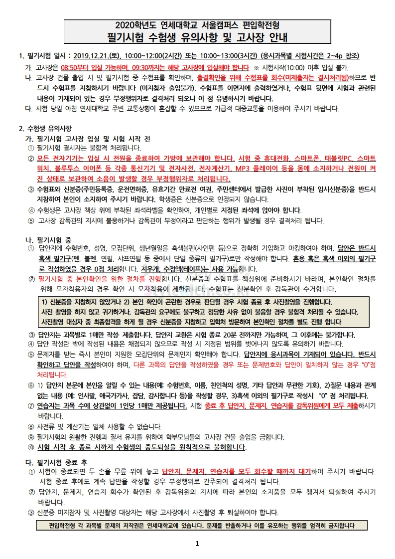 연세대 편입 2020학년도 필기고사 안내사항 간편하게 보자 2019.12.20 23:59 편입 유의사항/2020학년도 유의사항 2020학년도 연세대 편입 필기고사 안내사항을 살펴보겠습니다. ※ 내용 일부가 변경되거나 오표기가 있을 수 있으므로 시험 전 반드시 연세대 입학처 홈페이지에서 최종적으로 확인 바랍니다. 2020학년도 연세대 편입 필기고사 안내사항 다운받기 2020_notice.pdf 0.52MB <출처: 연세대 홈페이지> 과잠 in YONSEI 연세대학교 학과 별 과잠 알아보기! 공유하기 게시글 관리 리치의 편입컨설팅 저작자표시 비영리 변경금지 (새창열림) '편입 유의사항 > 2020학년도 유의사항' 카테고리의 다른 글 건국대 편입 2020학년도 필기고사 유의사항 간편하게 보자 (0) 2019.12.23 이화여대 편입 2020학년도 필기고사 안내사항 간편하게 보자 (0) 2019.12.21 숙명여대 편입 2020학년도 필기고사 안내사항 간편하게 보자 (0) 2019.12.20 국민대 편입 2020학년도 필기고사 안내사항 간편하게 보자 (0) 2019.12.14 고려대 편입 2020학년도 필기고사 안내사항 간편하게 보자 (0) 2019.12.14 댓글 공유하기 다른 글 댓글 이 글 공유하기 구독하기 구독하기 카카오톡 카카오톡 라인 라인 트위터 트위터 Facebook Facebook 카카오스토리 카카오스토리 밴드 밴드 네이버 블로그 네이버 블로그 Pocket Pocket Evernote Evernote 다른 글 건국대 편입 2020학년도 필기고사 유의사항 간편하게 보자 건국대 편입 2020학년도 필기고사 유의사항 간편하게 보자 2019.12.23 이화여대 편입 2020학년도 필기고사 안내사항 간편하게 보자 이화여대 편입 2020학년도 필기고사 안내사항 간편하게 보자 2019.12.21 숙명여대 편입 2020학년도 필기고사 안내사항 간편하게 보자 숙명여대 편입 2020학년도 필기고사 안내사항 간편하게 보자 2019.12.20 국민대 편입 2020학년도 필기고사 안내사항 간편하게 보자 국민대 편입 2020학년도 필기고사 안내사항 간편하게 보자 2019.12.14 다른 글 더 둘러보기