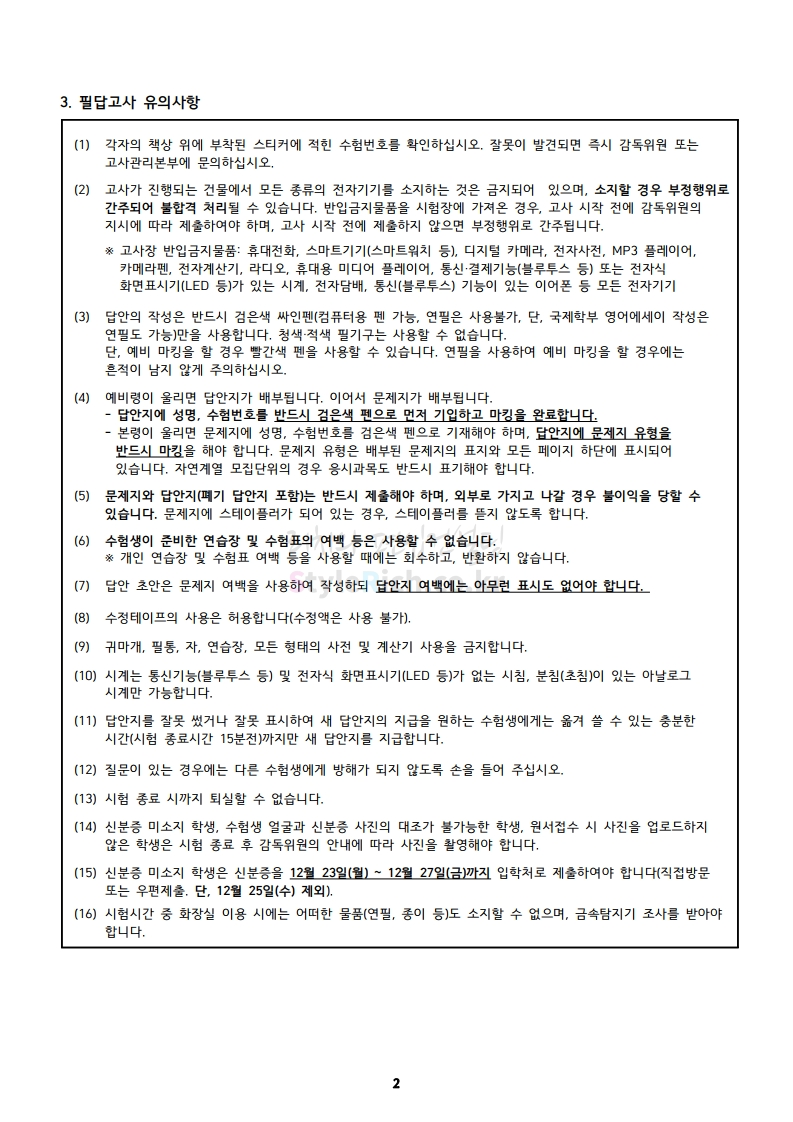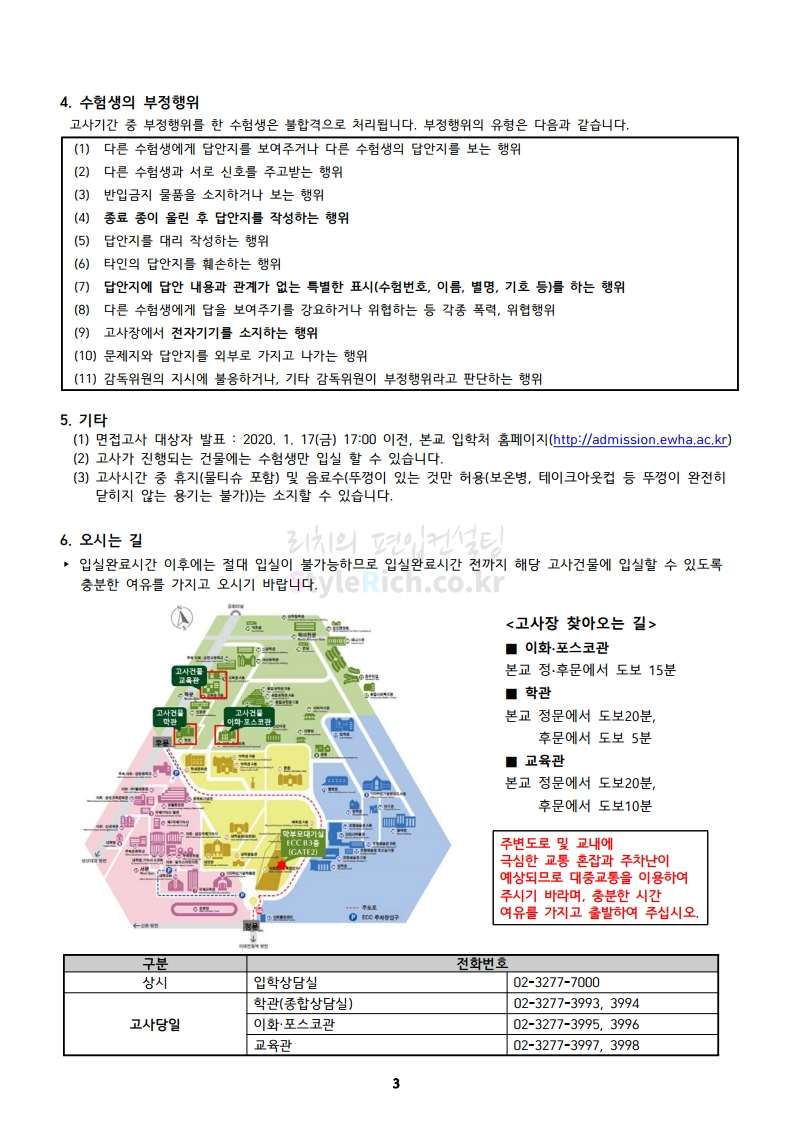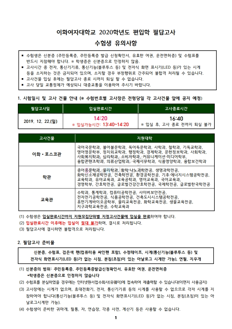 이화여대 편입 2020학년도 필기고사 안내사항 간편하게 보자 2019.12.21 00:19 편입 유의사항/2020학년도 유의사항 2020학년도 이화여대 편입 필기고사 안내사항을 살펴보겠습니다. ※ 내용 일부가 변경되거나 오표기가 있을 수 있으므로 시험 전 반드시 이화여대 입학처 홈페이지에서 최종적으로 확인 바랍니다. 2020학년도 이화여대 편입 필기고사 안내사항 다운받기 2020편입학필답고사수험생유의사항.pdf 0.35MB <출처: 이화여대 홈페이지> [이화라이프] #82 유바바의 '이화그린' 사용설명서 공유하기 게시글 관리 리치의 편입컨설팅 저작자표시 비영리 변경금지 (새창열림) '편입 유의사항 > 2020학년도 유의사항' 카테고리의 다른 글 단국대(죽전) 편입 2020학년도 필기고사 유의사항 간편하게 보자 (0) 2019.12.24 건국대 편입 2020학년도 필기고사 유의사항 간편하게 보자 (0) 2019.12.23 연세대 편입 2020학년도 필기고사 안내사항 간편하게 보자 (0) 2019.12.20 숙명여대 편입 2020학년도 필기고사 안내사항 간편하게 보자 (0) 2019.12.20 국민대 편입 2020학년도 필기고사 안내사항 간편하게 보자 (0) 2019.12.14 댓글 공유하기 다른 글 댓글 이 글 공유하기 구독하기 구독하기 카카오톡 카카오톡 라인 라인 트위터 트위터 Facebook Facebook 카카오스토리 카카오스토리 밴드 밴드 네이버 블로그 네이버 블로그 Pocket Pocket Evernote Evernote 다른 글 단국대(죽전) 편입 2020학년도 필기고사 유의사항 간편하게 보자 단국대(죽전) 편입 2020학년도 필기고사 유의사항 간편하게 보자 2019.12.24 건국대 편입 2020학년도 필기고사 유의사항 간편하게 보자 건국대 편입 2020학년도 필기고사 유의사항 간편하게 보자 2019.12.23 연세대 편입 2020학년도 필기고사 안내사항 간편하게 보자 연세대 편입 2020학년도 필기고사 안내사항 간편하게 보자 2019.12.20 숙명여대 편입 2020학년도 필기고사 안내사항 간편하게 보자 숙명여대 편입 2020학년도 필기고사 안내사항 간편하게 보자 2019.12.20 다른 글 더 둘러보기