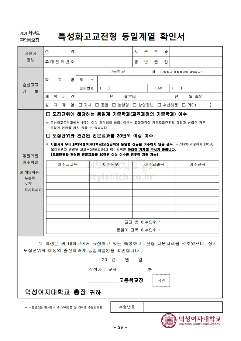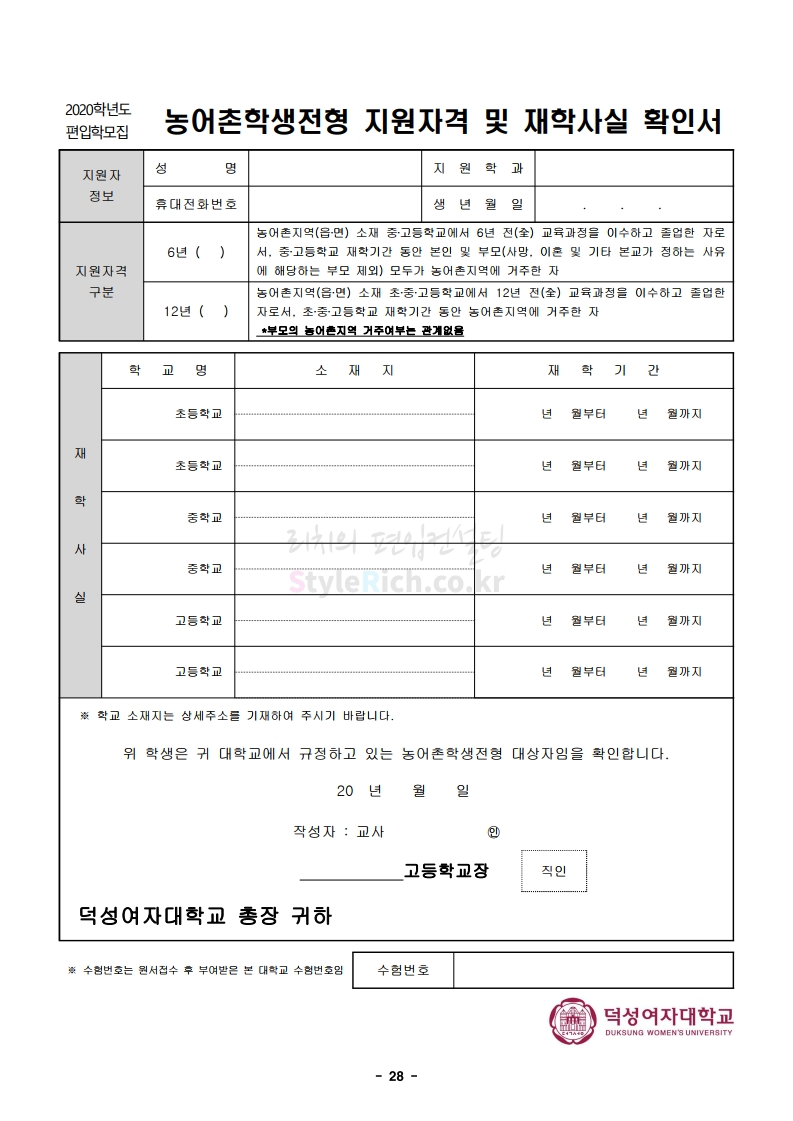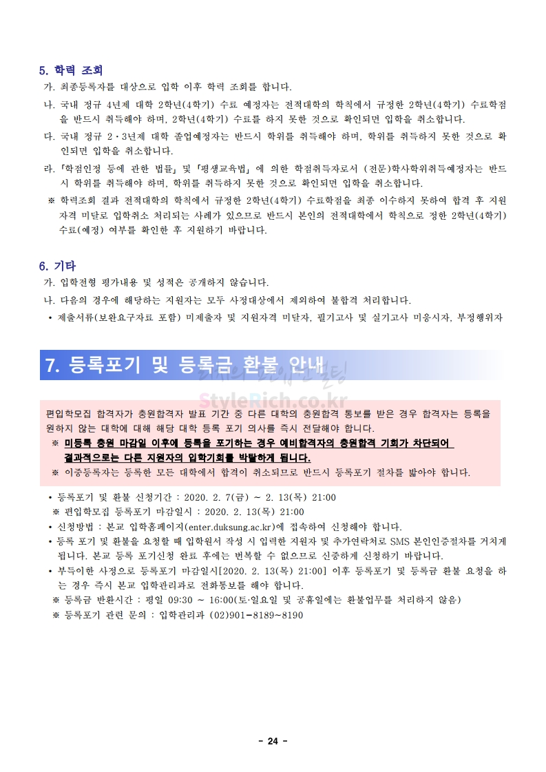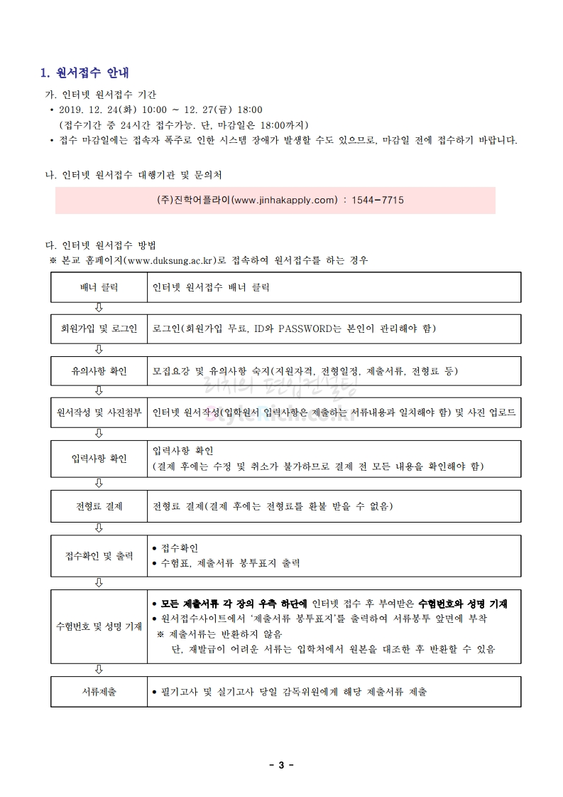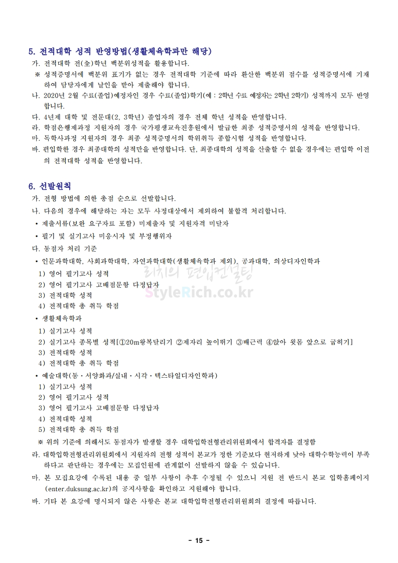 덕성여대 편입 2020학년도 모집요강 간편하게 보자 2019.12.21 01:40 편입 모집요강/2020학년도 모집요강 2020학년도 덕성여대 편입 모집요강을 간편하게 확인하세요. PC와 모바일 모두에서 이미지를 클릭(터치) 후 이미지의 좌우측을 각각 클릭하면 모집요강 순서를 앞뒤로 넘길 수 있습니다. 좌측 클릭(터치)는 이전 페이지, 우측 클릭(터치)는 다음 페이지입니다. * 최종 모집요강 발표 후에도 일부 내용이 변경될 수 있으니 지원 전 반드시 덕성여대 입학처의 모집요강을 확인하시기 바랍니다. 2020학년도 덕성여대 편입 모집요강 다운받기 2020_pyen.pdf 0.65MB <출처: 덕성여대 홈페이지> 덕성 유튜브로 축제가자_! [백년의인연, 백년의행복] 공유하기 게시글 관리 리치의 편입컨설팅 저작자표시 비영리 변경금지 (새창열림) '편입 모집요강 > 2020학년도 모집요강' 카테고리의 다른 글 한성대 편입 2020학년도 모집요강 간편하게 보자 (0) 2019.12.23 상명대 편입 2020학년도 모집요강 간편하게 보자 (0) 2019.12.23 건국대 편입 2020학년도 면접고사 출제범위를 알아보자 (0) 2019.12.21 서강대 편입 2020학년도 자연계열 필기시험(수학) 참고분야를 알아보자 (0) 2019.12.21 성균관대 편입 2020학년도 모집요강 간편하게 보자 (0) 2019.12.20 댓글 공유하기 다른 글 댓글 이 글 공유하기 구독하기 구독하기 카카오톡 카카오톡 라인 라인 트위터 트위터 Facebook Facebook 카카오스토리 카카오스토리 밴드 밴드 네이버 블로그 네이버 블로그 Pocket Pocket Evernote Evernote 다른 글 한성대 편입 2020학년도 모집요강 간편하게 보자 한성대 편입 2020학년도 모집요강 간편하게 보자 2019.12.23 상명대 편입 2020학년도 모집요강 간편하게 보자 상명대 편입 2020학년도 모집요강 간편하게 보자 2019.12.23 건국대 편입 2020학년도 면접고사 출제범위를 알아보자 건국대 편입 2020학년도 면접고사 출제범위를 알아보자 2019.12.21 서강대 편입 2020학년도 자연계열 필기시험(수학) 참고분야를 알아보자 서강대 편입 2020학년도 자연계열 필기시험(수학) 참고분야를 알아보자 2019.12.21 다른 글 더 둘러보기