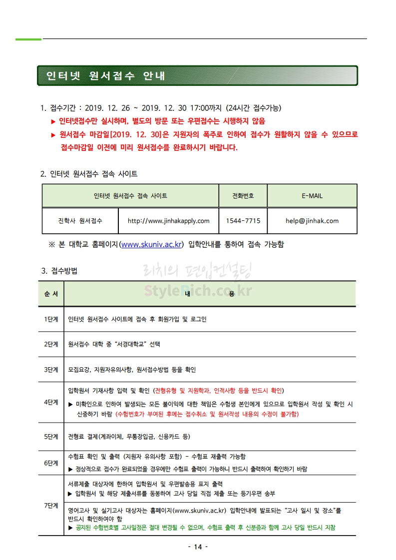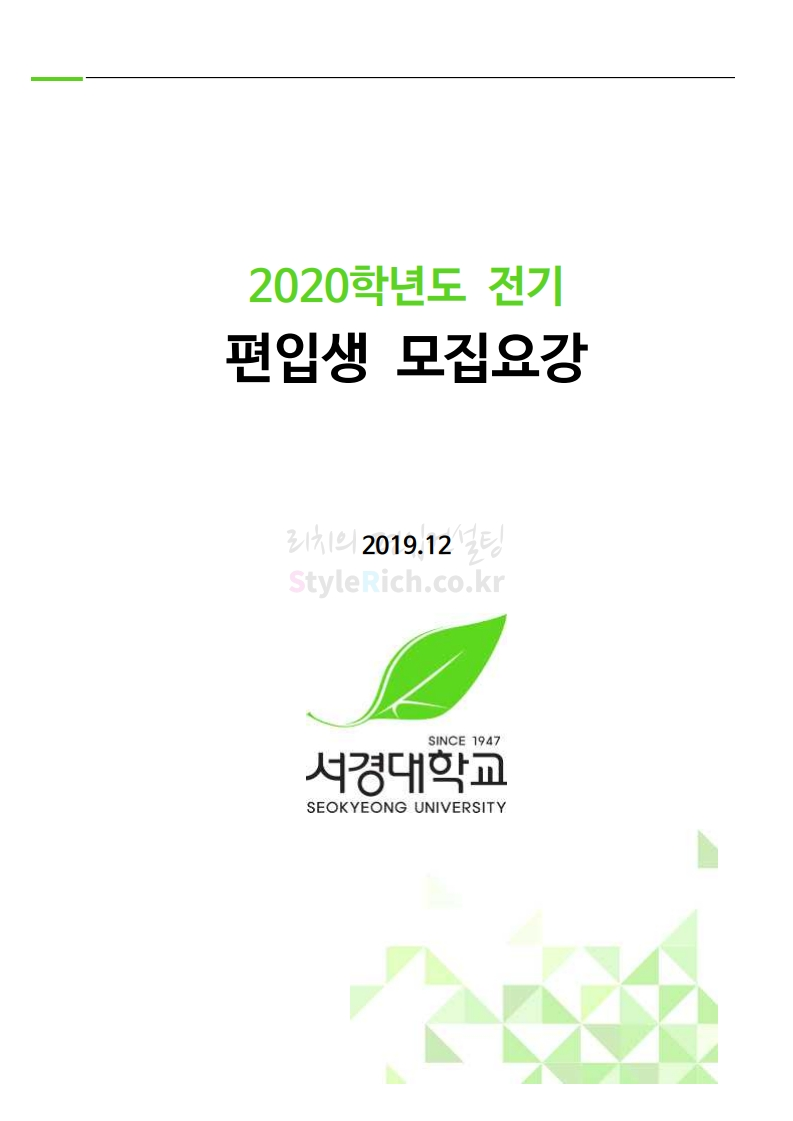 서경대 편입 2020학년도 모집요강 간편하게 보자 2019.12.25 02:30 편입 모집요강/2020학년도 모집요강 2020학년도 서경대 편입 모집요강을 간편하게 확인하세요. PC와 모바일 모두에서 이미지를 클릭(터치) 후 이미지의 좌우측을 각각 클릭하면 모집요강 순서를 앞뒤로 넘길 수 있습니다. 좌측 클릭(터치)는 이전 페이지, 우측 클릭(터치)는 다음 페이지입니다. * 최종 모집요강 발표 후에도 일부 내용이 변경될 수 있으니 지원 전 반드시 서경대 입학처의 모집요강을 확인하시기 바랍니다. <출처: 서경대 홈페이지> 서경대학교 TV CF 광고(15초) | 실용이 최고의 가치다 공유하기 게시글 관리 리치의 편입컨설팅 저작자표시 비영리 변경금지 (새창열림) '편입 모집요강 > 2020학년도 모집요강' 카테고리의 다른 글 성신여대 편입 2020학년도 모집요강 간편하게 보자 (0) 2019.12.25 서울여대 편입 2020학년도 모집요강 간편하게 보자 (0) 2019.12.25 상명대(천안) 편입 2020학년도 모집요강 간편하게 보자 (0) 2019.12.24 한성대 편입 2020학년도 모집요강 간편하게 보자 (0) 2019.12.23 상명대 편입 2020학년도 모집요강 간편하게 보자 (0) 2019.12.23 댓글 공유하기 다른 글 댓글 이 글 공유하기 구독하기 구독하기 카카오톡 카카오톡 라인 라인 트위터 트위터 Facebook Facebook 카카오스토리 카카오스토리 밴드 밴드 네이버 블로그 네이버 블로그 Pocket Pocket Evernote Evernote 다른 글 성신여대 편입 2020학년도 모집요강 간편하게 보자 성신여대 편입 2020학년도 모집요강 간편하게 보자 2019.12.25 서울여대 편입 2020학년도 모집요강 간편하게 보자 서울여대 편입 2020학년도 모집요강 간편하게 보자 2019.12.25 상명대(천안) 편입 2020학년도 모집요강 간편하게 보자 상명대(천안) 편입 2020학년도 모집요강 간편하게 보자 2019.12.24 한성대 편입 2020학년도 모집요강 간편하게 보자 한성대 편입 2020학년도 모집요강 간편하게 보자 2019.12.23 다른 글 더 둘러보기