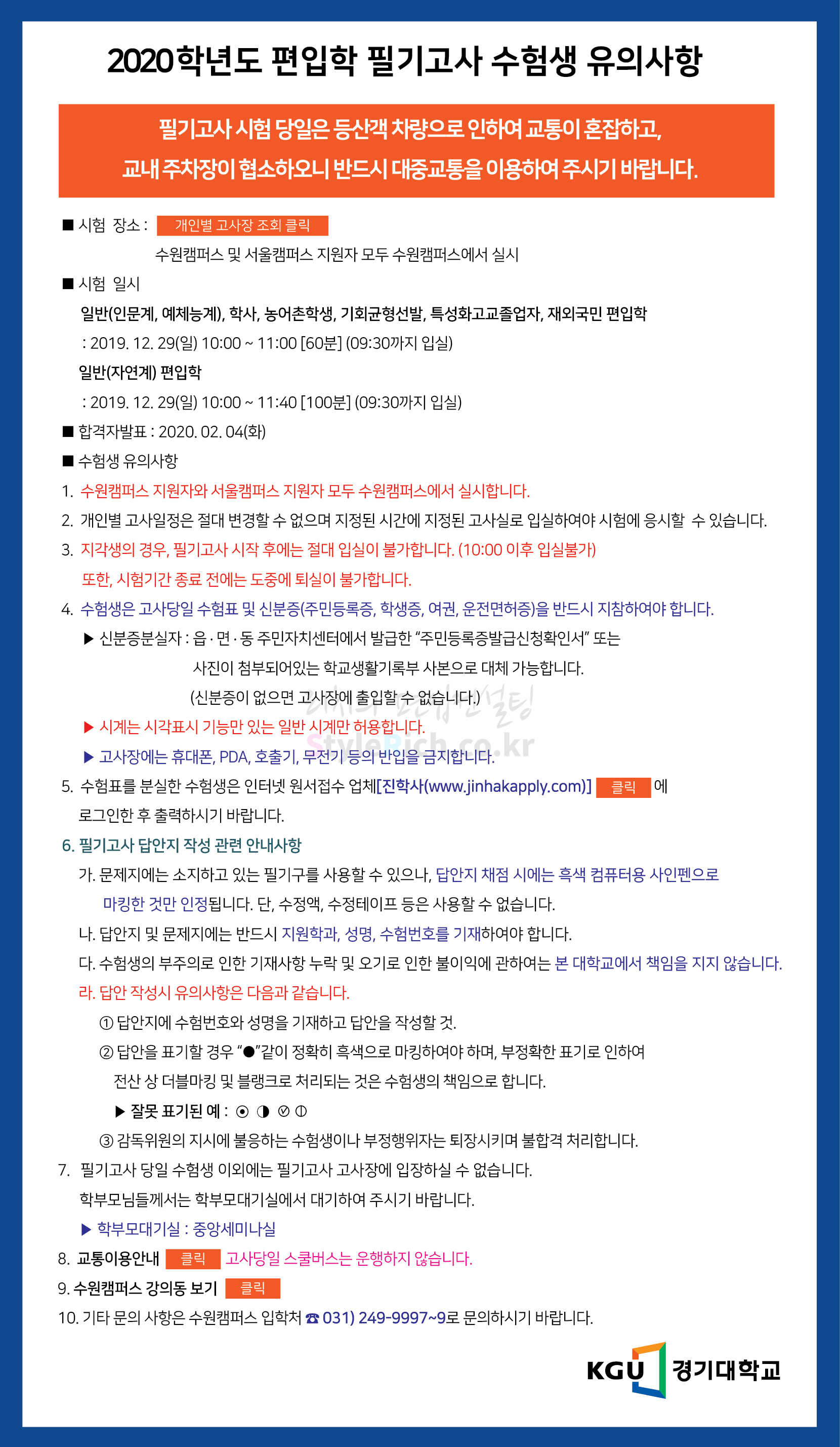 경기대 편입 2020학년도 필기고사 유의사항 간편하게 보자 2019.12.26 00:50 편입 유의사항/2020학년도 유의사항 2020학년도 경기대 편입 필기고사 안내사항을 살펴보겠습니다. ※ 내용 일부가 변경되거나 오표기가 있을 수 있으므로 시험 전 반드시 경기대 입학처 홈페이지에서 최종적으로 확인 바랍니다. 2020학년도 경기대 편입 필기고사 유의사항 <출처: 경기대 홈페이지> 경기대 웹드라마 NEW START 3화(최종화) : 새로운 출발! 공유하기 게시글 관리 리치의 편입컨설팅 저작자표시 비영리 변경금지 (새창열림) '편입 유의사항 > 2020학년도 유의사항' 카테고리의 다른 글 세종대 편입 2020학년도 필기고사 유의사항 간편하게 보자 (0) 2020.01.01 홍익대 편입 2020학년도 필기고사 유의사항 간편하게 보자 (0) 2020.01.01 한양대(에리카) 편입 2020학년도 필기고사 유의사항 간편하게 보자 (0) 2019.12.26 가천대 편입 2020학년도 필기고사 유의사항 간편하게 보자 (0) 2019.12.25 단국대(죽전) 편입 2020학년도 필기고사 유의사항 간편하게 보자 (0) 2019.12.24 댓글 공유하기 다른 글 댓글 이 글 공유하기 구독하기 구독하기 카카오톡 카카오톡 라인 라인 트위터 트위터 Facebook Facebook 카카오스토리 카카오스토리 밴드 밴드 네이버 블로그 네이버 블로그 Pocket Pocket Evernote Evernote 다른 글 세종대 편입 2020학년도 필기고사 유의사항 간편하게 보자 세종대 편입 2020학년도 필기고사 유의사항 간편하게 보자 2020.01.01 홍익대 편입 2020학년도 필기고사 유의사항 간편하게 보자 홍익대 편입 2020학년도 필기고사 유의사항 간편하게 보자 2020.01.01 한양대(에리카) 편입 2020학년도 필기고사 유의사항 간편하게 보자 한양대(에리카) 편입 2020학년도 필기고사 유의사항 간편하게 보자 2019.12.26 가천대 편입 2020학년도 필기고사 유의사항 간편하게 보자 가천대 편입 2020학년도 필기고사 유의사항 간편하게 보자 2019.12.25 다른 글 더 둘러보기