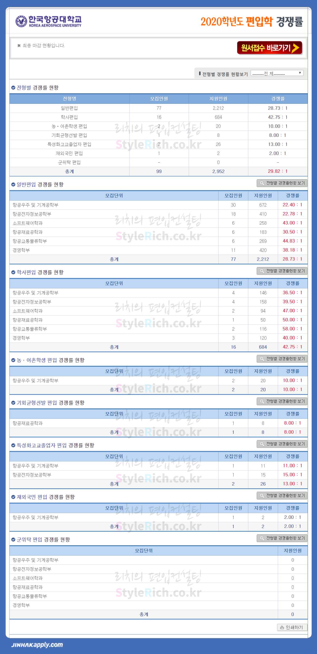 한국항공대 편입 2020학년도 경쟁률 간편하게 보자 2019.12.27 02:40 편입 경쟁률/2020학년도 경쟁률 2020학년도 한국항공대 편입 경쟁률을 살펴보겠습니다. 학사편입이 가장 높은 경쟁률을 보였으며, 그 뒤로 일반편입, 특성화고교졸업자 편입, 농어촌학생 편입, 기회균형선발 편입, 재외국민 편입 순이었습니다. 군위탁 편입은 지원자가 없었습니다. 2020학년도 한국항공대 편입 경쟁률 <출처: 대한민국 대표 인터넷 원서접수! 진학사 원서접수> 한국항공대 대표 항공우주특성화 프로그램, '보잉 데이(Boeing Day)' 공유하기 게시글 관리 리치의 편입컨설팅 저작자표시 비영리 변경금지 (새창열림) '편입 경쟁률 > 2020학년도 경쟁률' 카테고리의 다른 글 이화여대 편입 2020학년도 경쟁률 간편하게 보자 (0) 2019.12.31 연세대 편입 2020학년도 경쟁률 간편하게 보자 (0) 2019.12.29 숙명여대 편입 2020학년도 경쟁률 간편하게 보자 (0) 2019.12.29 국민대 편입 2020학년도 경쟁률 간편하게 보자 (0) 2019.12.28 고려대 편입 2020학년도 경쟁률 간편하게 보자 (0) 2019.12.28 댓글 공유하기 다른 글 댓글 이 글 공유하기 구독하기 구독하기 카카오톡 카카오톡 라인 라인 트위터 트위터 Facebook Facebook 카카오스토리 카카오스토리 밴드 밴드 네이버 블로그 네이버 블로그 Pocket Pocket Evernote Evernote 다른 글 연세대 편입 2020학년도 경쟁률 간편하게 보자 연세대 편입 2020학년도 경쟁률 간편하게 보자 2019.12.29 숙명여대 편입 2020학년도 경쟁률 간편하게 보자 숙명여대 편입 2020학년도 경쟁률 간편하게 보자 2019.12.29 국민대 편입 2020학년도 경쟁률 간편하게 보자 국민대 편입 2020학년도 경쟁률 간편하게 보자 2019.12.28 고려대 편입 2020학년도 경쟁률 간편하게 보자 고려대 편입 2020학년도 경쟁률 간편하게 보자 2019.12.28 다른 글 더 둘러보기