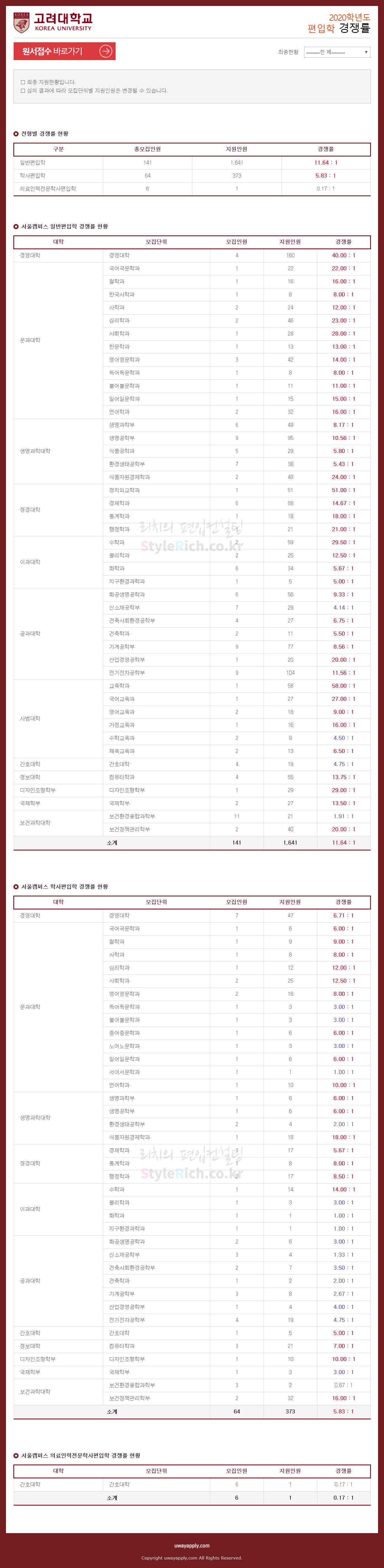 고려대 편입 2020학년도 경쟁률 간편하게 보자 2019.12.28 01:09 편입 경쟁률/2020학년도 경쟁률 2020학년도 고려대 편입 경쟁률을 살펴보겠습니다. 일반편입, 학사편입, 의료인력전문학사편입학 순으로 경쟁률이 높았습니다. 경쟁률이 전반적으로 낮은 경향을 보이고 있는데요. 고려대의 경우 지원자격에서 토익이 아닌 토플 또는 텝스 성적을 요구하기 때문에 논술이나 전공을 준비하는 수험생 중에서도 지원자체를 포기하는 경향이 있습니다. 결국 토플 또는 텝스, 논술 또는 전공이라는 2가지의 벽이 존재하기 때문에 지원자가 적을 수 밖에 없습니다. 2020학년도 고려대 편입 경쟁률 <출처: 대한민국 No.1 인터넷 원서접수 사이트! 유웨이어플라이> 2019년 고려대학교 홍보영상(학생편) 공유하기 게시글 관리 리치의 편입컨설팅 저작자표시 비영리 변경금지 (새창열림) '편입 경쟁률 > 2020학년도 경쟁률' 카테고리의 다른 글 이화여대 편입 2020학년도 경쟁률 간편하게 보자 (0) 2019.12.31 연세대 편입 2020학년도 경쟁률 간편하게 보자 (0) 2019.12.29 숙명여대 편입 2020학년도 경쟁률 간편하게 보자 (0) 2019.12.29 국민대 편입 2020학년도 경쟁률 간편하게 보자 (0) 2019.12.28 한국항공대 편입 2020학년도 경쟁률 간편하게 보자 (0) 2019.12.27 댓글 공유하기 다른 글 댓글 이 글 공유하기 구독하기 구독하기 카카오톡 카카오톡 라인 라인 트위터 트위터 Facebook Facebook 카카오스토리 카카오스토리 밴드 밴드 네이버 블로그 네이버 블로그 Pocket Pocket Evernote Evernote 다른 글 연세대 편입 2020학년도 경쟁률 간편하게 보자 연세대 편입 2020학년도 경쟁률 간편하게 보자 2019.12.29 숙명여대 편입 2020학년도 경쟁률 간편하게 보자 숙명여대 편입 2020학년도 경쟁률 간편하게 보자 2019.12.29 국민대 편입 2020학년도 경쟁률 간편하게 보자 국민대 편입 2020학년도 경쟁률 간편하게 보자 2019.12.28 한국항공대 편입 2020학년도 경쟁률 간편하게 보자 한국항공대 편입 2020학년도 경쟁률 간편하게 보자 2019.12.27 다른 글 더 둘러보기