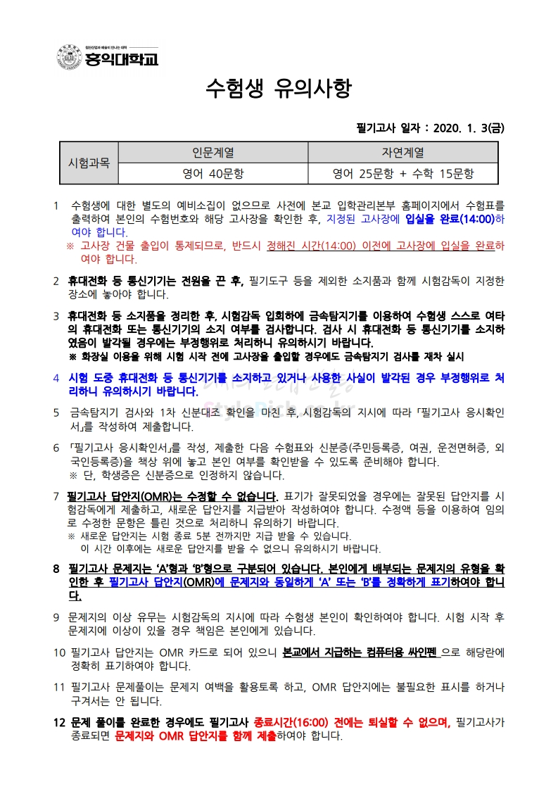 홍익대 편입 2020학년도 필기고사 유의사항 간편하게 보자 2020.01.01 15:29 편입 유의사항/2020학년도 유의사항 2020학년도 홍익대 편입 필기고사 유의사항을 살펴보겠습니다. ※ 내용 일부가 변경되거나 오표기가 있을 수 있으므로 시험 전 반드시 홍익대 입학처 홈페이지에서 최종적으로 확인 바랍니다. 2020학년도 홍익대 편입 필기고사 유의사항 2020학년도 홍익대 편입 필기고사 고사장 <출처: 홍익대 홈페이지> 2020학년도 전기 홍익대학교 국제디자인전문대학원 신입생 모집 공유하기 게시글 관리 리치의 편입컨설팅 저작자표시 비영리 변경금지 (새창열림) '편입 유의사항 > 2020학년도 유의사항' 카테고리의 다른 글 서울과학기술대 편입 2020학년도 필기고사 유의사항 간편하게 보자 (0) 2020.01.03 세종대 편입 2020학년도 필기고사 유의사항 간편하게 보자 (0) 2020.01.01 경기대 편입 2020학년도 필기고사 유의사항 간편하게 보자 (0) 2019.12.26 한양대(에리카) 편입 2020학년도 필기고사 유의사항 간편하게 보자 (0) 2019.12.26 가천대 편입 2020학년도 필기고사 유의사항 간편하게 보자 (0) 2019.12.25 댓글 공유하기 다른 글 댓글 이 글 공유하기 구독하기 구독하기 카카오톡 카카오톡 라인 라인 트위터 트위터 Facebook Facebook 카카오스토리 카카오스토리 밴드 밴드 네이버 블로그 네이버 블로그 Pocket Pocket Evernote Evernote 다른 글 서울과학기술대 편입 2020학년도 필기고사 유의사항 간편하게 보자 서울과학기술대 편입 2020학년도 필기고사 유의사항 간편하게 보자 2020.01.03 세종대 편입 2020학년도 필기고사 유의사항 간편하게 보자 세종대 편입 2020학년도 필기고사 유의사항 간편하게 보자 2020.01.01 경기대 편입 2020학년도 필기고사 유의사항 간편하게 보자 경기대 편입 2020학년도 필기고사 유의사항 간편하게 보자 2019.12.26 한양대(에리카) 편입 2020학년도 필기고사 유의사항 간편하게 보자 한양대(에리카) 편입 2020학년도 필기고사 유의사항 간편하게 보자 2019.12.26 다른 글 더 둘러보기