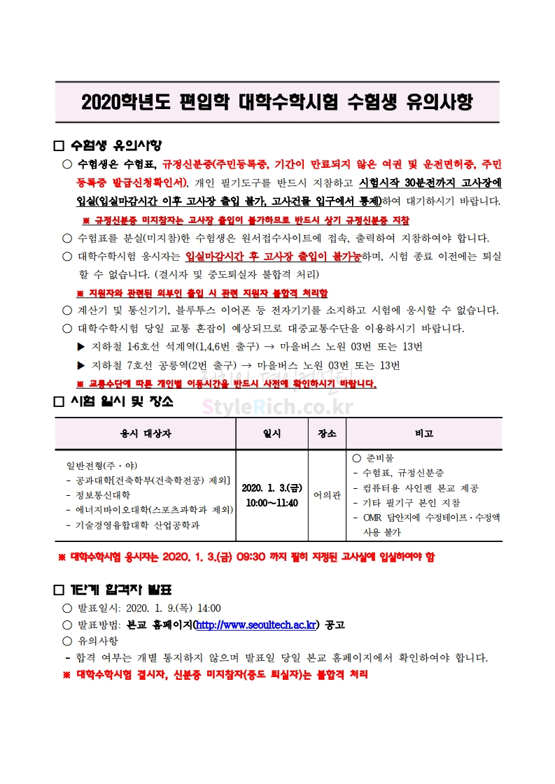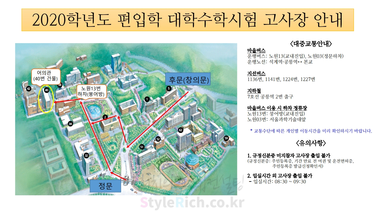서울과학기술대 편입 2020학년도 필기고사 유의사항 간편하게 보자 2020.01.03 02:06 편입 유의사항/2020학년도 유의사항 2020학년도 서울과학기술대 편입 필기고사 유의사항을 살펴보겠습니다. ※ 내용 일부가 변경되거나 오표기가 있을 수 있으므로 시험 전 반드시 서울과학기술대 입학처 홈페이지에서 최종적으로 확인 바랍니다. 2020학년도 서울과학기술대 편입 필기고사 유의사항 2020학년도 서울과학기술대 편입 필기고사 고사장 <출처: 서울과학기술대 홈페이지> [2018 서울과기대 UCC 공모전] 과기대 캠퍼스 힐링 투어 공유하기 게시글 관리 리치의 편입컨설팅 저작자표시 비영리 변경금지 (새창열림) '편입 유의사항 > 2020학년도 유의사항' 카테고리의 다른 글 가톨릭대 편입 2020학년도 필기고사 유의사항 간편하게 보자 (0) 2020.01.04 인하대 편입 2020학년도 필기고사 유의사항 간편하게 보자 (0) 2020.01.04 세종대 편입 2020학년도 필기고사 유의사항 간편하게 보자 (0) 2020.01.01 홍익대 편입 2020학년도 필기고사 유의사항 간편하게 보자 (0) 2020.01.01 경기대 편입 2020학년도 필기고사 유의사항 간편하게 보자 (0) 2019.12.26 댓글 공유하기 다른 글 댓글 이 글 공유하기 구독하기 구독하기 카카오톡 카카오톡 라인 라인 트위터 트위터 Facebook Facebook 카카오스토리 카카오스토리 밴드 밴드 네이버 블로그 네이버 블로그 Pocket Pocket Evernote Evernote 다른 글 가톨릭대 편입 2020학년도 필기고사 유의사항 간편하게 보자 가톨릭대 편입 2020학년도 필기고사 유의사항 간편하게 보자 2020.01.04 인하대 편입 2020학년도 필기고사 유의사항 간편하게 보자 인하대 편입 2020학년도 필기고사 유의사항 간편하게 보자 2020.01.04 세종대 편입 2020학년도 필기고사 유의사항 간편하게 보자 세종대 편입 2020학년도 필기고사 유의사항 간편하게 보자 2020.01.01 홍익대 편입 2020학년도 필기고사 유의사항 간편하게 보자 홍익대 편입 2020학년도 필기고사 유의사항 간편하게 보자 2020.01.01 다른 글 더 둘러보기