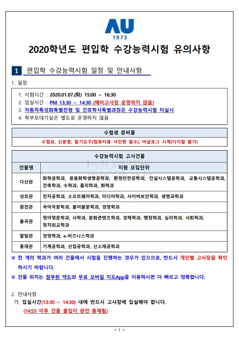 2020학년도 아주대 편입 필기고사 유의사항 01
