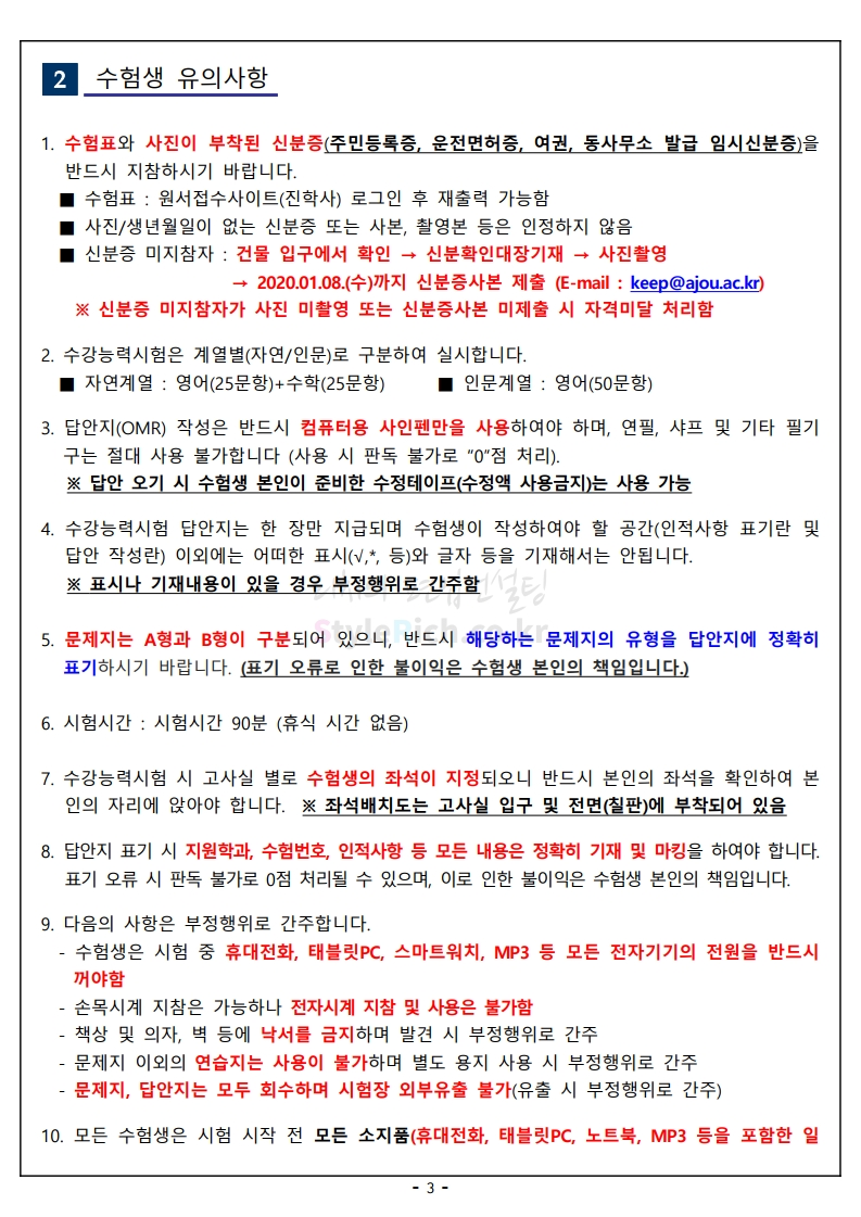 2020학년도 아주대 편입 필기고사 유의사항 03