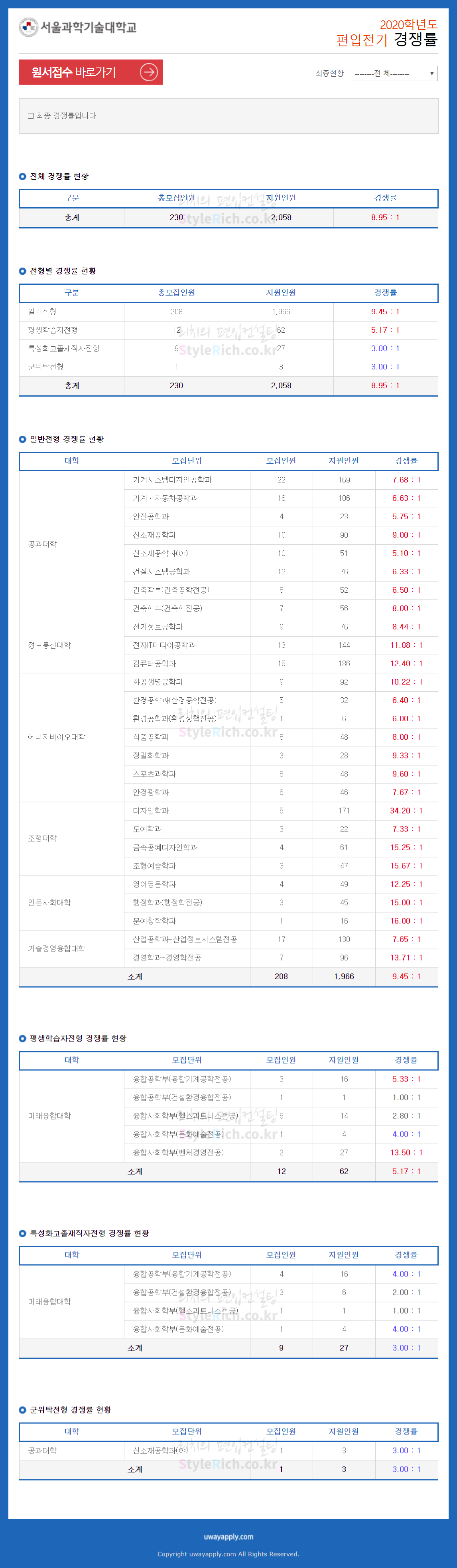 서울과학기술대 편입 2020학년도 경쟁률 간편하게 보자 2020.01.05 12:04 편입 경쟁률/2020학년도 경쟁률 2020학년도 서울과학기술대 편입 경쟁률을 살펴보겠습니다. 일반편입, 평생학습자전형편입, 특성화고졸재직자전형편입&군위탁전형편입 순으로 경쟁률이 높습니다. 서울과학기술대는 학사편입을 모집하지 않습니다. 2020학년도 서울과학기술대 편입 경쟁률 <출처: 유웨이어플라이> 환경을 생각하는 SeoulTech 캠페인(1) - Take-out 용기 분리수거 요령 공유하기 게시글 관리 리치의 편입컨설팅 저작자표시 비영리 변경금지 (새창열림) '편입 경쟁률 > 2020학년도 경쟁률' 카테고리의 다른 글 가톨릭대 편입 2020학년도 경쟁률 간편하게 보자 (0) 2020.01.05 세종대 편입 2020학년도 경쟁률 간편하게 보자 (0) 2020.01.05 홍익대 편입 2020학년도 경쟁률 간편하게 보자 (0) 2020.01.05 경기대 편입 2020학년도 경쟁률 간편하게 보자 (0) 2020.01.05 한양대(에리카) 편입 2020학년도 경쟁률 간편하게 보자 (0) 2020.01.05 댓글 공유하기 다른 글 댓글 이 글 공유하기 구독하기 구독하기 카카오톡 카카오톡 라인 라인 트위터 트위터 Facebook Facebook 카카오스토리 카카오스토리 밴드 밴드 네이버 블로그 네이버 블로그 Pocket Pocket Evernote Evernote 다른 글 가톨릭대 편입 2020학년도 경쟁률 간편하게 보자 가톨릭대 편입 2020학년도 경쟁률 간편하게 보자 2020.01.05 세종대 편입 2020학년도 경쟁률 간편하게 보자 세종대 편입 2020학년도 경쟁률 간편하게 보자 2020.01.05 홍익대 편입 2020학년도 경쟁률 간편하게 보자 홍익대 편입 2020학년도 경쟁률 간편하게 보자 2020.01.05 경기대 편입 2020학년도 경쟁률 간편하게 보자 경기대 편입 2020학년도 경쟁률 간편하게 보자 2020.01.05 다른 글 더 둘러보기