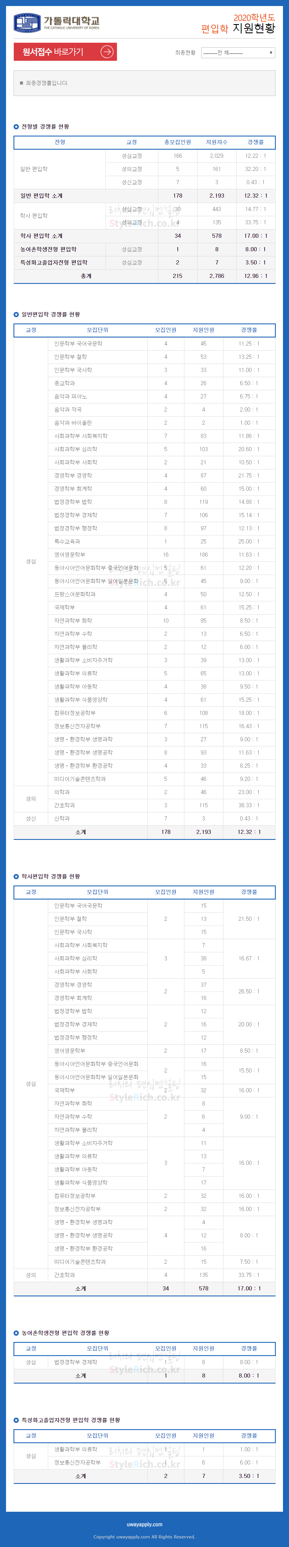 가톨릭대 편입 2020학년도 경쟁률 간편하게 보자 2020.01.05 12:49 편입 경쟁률/2020학년도 경쟁률 2020학년도 가톨릭대 편입 경쟁률을 살펴보겠습니다. 학사편입, 일반편입, 농어촌학생전형편입, 특성화고졸업자전형편입 순으로 경쟁률이 높습니다. 2020학년도 가톨릭대 편입 경쟁률 <출처: 유웨이어플라이> 가톨릭대학교 홍보동영상_2019_우리말 공유하기 게시글 관리 리치의 편입컨설팅 저작자표시 비영리 변경금지 (새창열림) '편입 경쟁률 > 2020학년도 경쟁률' 카테고리의 다른 글 동덕여대 편입 2020학년도 경쟁률 간편하게 보자 (0) 2020.01.05 인하대 편입 2020학년도 경쟁률 간편하게 보자 (0) 2020.01.05 세종대 편입 2020학년도 경쟁률 간편하게 보자 (0) 2020.01.05 서울과학기술대 편입 2020학년도 경쟁률 간편하게 보자 (0) 2020.01.05 홍익대 편입 2020학년도 경쟁률 간편하게 보자 (0) 2020.01.05 댓글 공유하기 다른 글 댓글 이 글 공유하기 구독하기 구독하기 카카오톡 카카오톡 라인 라인 트위터 트위터 Facebook Facebook 카카오스토리 카카오스토리 밴드 밴드 네이버 블로그 네이버 블로그 Pocket Pocket Evernote Evernote 다른 글 동덕여대 편입 2020학년도 경쟁률 간편하게 보자 동덕여대 편입 2020학년도 경쟁률 간편하게 보자 2020.01.05 인하대 편입 2020학년도 경쟁률 간편하게 보자 인하대 편입 2020학년도 경쟁률 간편하게 보자 2020.01.05 세종대 편입 2020학년도 경쟁률 간편하게 보자 세종대 편입 2020학년도 경쟁률 간편하게 보자 2020.01.05 서울과학기술대 편입 2020학년도 경쟁률 간편하게 보자 서울과학기술대 편입 2020학년도 경쟁률 간편하게 보자 2020.01.05 다른 글 더 둘러보기