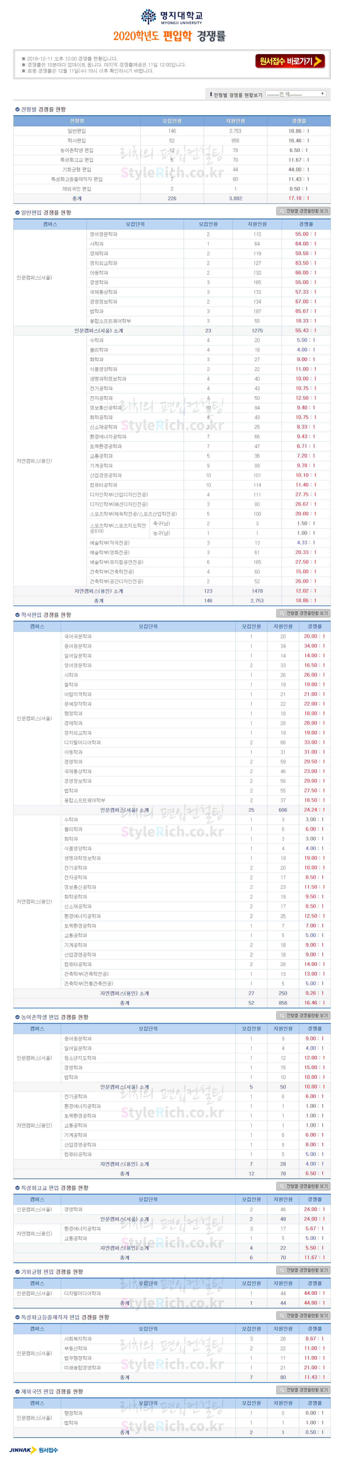 명지대 편입 2020학년도 경쟁률 간편하게 보자 2020.01.05 20:57 편입 경쟁률/2020학년도 경쟁률 2020학년도 명지대 편입 경쟁률을 살펴보겠습니다. 기회균형편입, 일반편입, 학사편입, 특성화고교편입, 특성화고등졸재직자편입, 농어촌학생편입, 재외국민편입 순으로 경쟁률이 높습니다. 2020학년도 아주대 편입 경쟁률 <출처: 진학사 원서접수> 2019학년도 명지대학교 공식 홍보 동영상 공유하기 게시글 관리 리치의 편입컨설팅 저작자표시 비영리 변경금지 (새창열림) '편입 경쟁률 > 2020학년도 경쟁률' 카테고리의 다른 글 강남대 편입 2020학년도 경쟁률 간편하게 보자 (0) 2020.01.05 수원대 편입 2020학년도 경쟁률 간편하게 보자 (0) 2020.01.05 아주대 편입 2020학년도 경쟁률 간편하게 보자 (0) 2020.01.05 동덕여대 편입 2020학년도 경쟁률 간편하게 보자 (0) 2020.01.05 인하대 편입 2020학년도 경쟁률 간편하게 보자 (0) 2020.01.05 댓글 공유하기 다른 글 댓글 이 글 공유하기 구독하기 구독하기 카카오톡 카카오톡 라인 라인 트위터 트위터 Facebook Facebook 카카오스토리 카카오스토리 밴드 밴드 네이버 블로그 네이버 블로그 Pocket Pocket Evernote Evernote 다른 글 강남대 편입 2020학년도 경쟁률 간편하게 보자 강남대 편입 2020학년도 경쟁률 간편하게 보자 2020.01.05 수원대 편입 2020학년도 경쟁률 간편하게 보자 수원대 편입 2020학년도 경쟁률 간편하게 보자 2020.01.05 아주대 편입 2020학년도 경쟁률 간편하게 보자 아주대 편입 2020학년도 경쟁률 간편하게 보자 2020.01.05 동덕여대 편입 2020학년도 경쟁률 간편하게 보자 동덕여대 편입 2020학년도 경쟁률 간편하게 보자 2020.01.05 다른 글 더 둘러보기