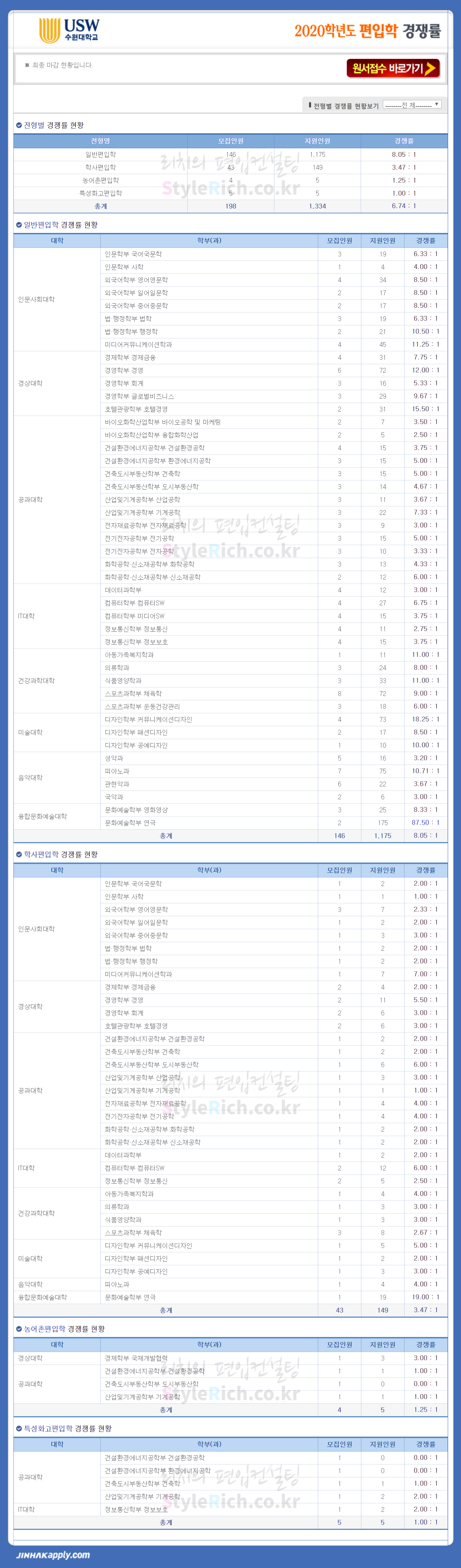 수원대 편입 2020학년도 경쟁률 간편하게 보자 2020.01.05 21:49 편입 경쟁률/2020학년도 경쟁률 2020학년도 수원대 편입 경쟁률입니다. 일반편입, 학사편입, 농어촌편입, 특성화고편입 순으로 경쟁률이 높습니다. 2020학년도 수원대 편입 경쟁률 <출처: 진학사 원서접수> [VLOG] 수원대 학식을 체험해 보았습니다! 공유하기 게시글 관리 리치의 편입컨설팅 저작자표시 비영리 변경금지 (새창열림) '편입 경쟁률 > 2020학년도 경쟁률' 카테고리의 다른 글 숭실대 편입 2020학년도 경쟁률 간편하게 보자 (0) 2020.01.05 강남대 편입 2020학년도 경쟁률 간편하게 보자 (0) 2020.01.05 명지대 편입 2020학년도 경쟁률 간편하게 보자 (0) 2020.01.05 아주대 편입 2020학년도 경쟁률 간편하게 보자 (0) 2020.01.05 동덕여대 편입 2020학년도 경쟁률 간편하게 보자 (0) 2020.01.05 댓글 공유하기 다른 글 댓글 이 글 공유하기 구독하기 구독하기 카카오톡 카카오톡 라인 라인 트위터 트위터 Facebook Facebook 카카오스토리 카카오스토리 밴드 밴드 네이버 블로그 네이버 블로그 Pocket Pocket Evernote Evernote 다른 글 숭실대 편입 2020학년도 경쟁률 간편하게 보자 숭실대 편입 2020학년도 경쟁률 간편하게 보자 2020.01.05 강남대 편입 2020학년도 경쟁률 간편하게 보자 강남대 편입 2020학년도 경쟁률 간편하게 보자 2020.01.05 명지대 편입 2020학년도 경쟁률 간편하게 보자 명지대 편입 2020학년도 경쟁률 간편하게 보자 2020.01.05 아주대 편입 2020학년도 경쟁률 간편하게 보자 아주대 편입 2020학년도 경쟁률 간편하게 보자 2020.01.05 다른 글 더 둘러보기
