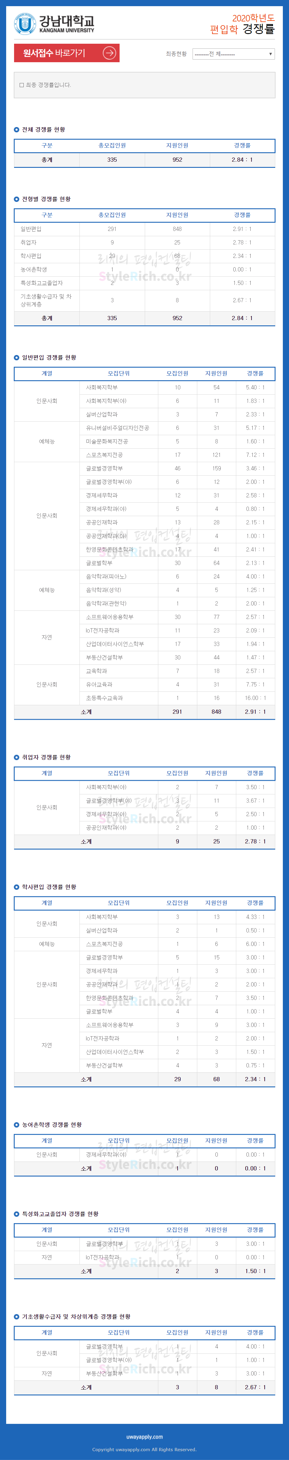강남대 편입 2020학년도 경쟁률 간편하게 보자 2020.01.05 22:18 편입 경쟁률/2020학년도 경쟁률 2020학년도 강남대 편입 경쟁률을 살펴보겠습니다. 일반편입, 취업자편입, 기초생활수급자 및 차상위계층편입, 학사편입, 특성화고교졸업자편입, 농어촌학생편입 순으로 경쟁률이 높습니다. 농어촌학생편입은 지원자가 없었습니다. 2020학년도 강남대 편입 경쟁률 <출처: 유웨이 어플라이> 강남대학교 홍보영상 공유하기 게시글 관리 리치의 편입컨설팅 저작자표시 비영리 변경금지 (새창열림) '편입 경쟁률 > 2020학년도 경쟁률' 카테고리의 다른 글 성균관대 편입 2020학년도 경쟁률 간편하게 보자 (0) 2020.01.08 숭실대 편입 2020학년도 경쟁률 간편하게 보자 (0) 2020.01.05 수원대 편입 2020학년도 경쟁률 간편하게 보자 (0) 2020.01.05 명지대 편입 2020학년도 경쟁률 간편하게 보자 (0) 2020.01.05 아주대 편입 2020학년도 경쟁률 간편하게 보자 (0) 2020.01.05 댓글 공유하기 다른 글 댓글 이 글 공유하기 구독하기 구독하기 카카오톡 카카오톡 라인 라인 트위터 트위터 Facebook Facebook 카카오스토리 카카오스토리 밴드 밴드 네이버 블로그 네이버 블로그 Pocket Pocket Evernote Evernote 다른 글 성균관대 편입 2020학년도 경쟁률 간편하게 보자 성균관대 편입 2020학년도 경쟁률 간편하게 보자 2020.01.08 숭실대 편입 2020학년도 경쟁률 간편하게 보자 숭실대 편입 2020학년도 경쟁률 간편하게 보자 2020.01.05 수원대 편입 2020학년도 경쟁률 간편하게 보자 수원대 편입 2020학년도 경쟁률 간편하게 보자 2020.01.05 명지대 편입 2020학년도 경쟁률 간편하게 보자 명지대 편입 2020학년도 경쟁률 간편하게 보자 2020.01.05 다른 글 더 둘러보기