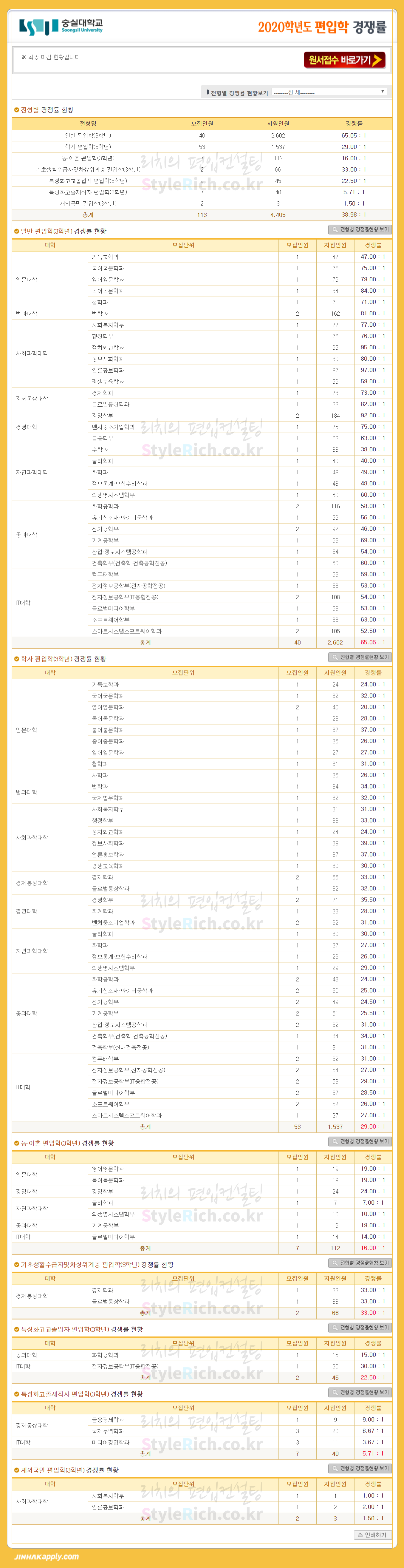 숭실대 편입 2020학년도 경쟁률 간편하게 보자 2020.01.05 22:33 편입 경쟁률/2020학년도 경쟁률 2020학년도 숭실대 편입 경쟁률을 살펴보겠습니다. 일반편입, 기초생활수급자및차상위계층편입, 학사편입, 특성화고교졸업자편입, 농어촌편입, 특성화고졸재직자편입, 재외국민편입 순으로 경쟁률이 높습니다. 2020학년도 숭실대 편입 경쟁률 <출처: 진학사 어플라이> 숭실대학교_교육과정혁신센터_펀시스템_비교과통합관리시스템 공유하기 게시글 관리 리치의 편입컨설팅 저작자표시 비영리 변경금지 (새창열림) '편입 경쟁률 > 2020학년도 경쟁률' 카테고리의 다른 글 덕성여대 편입 2020학년도 경쟁률 간편하게 보자 (0) 2020.01.09 성균관대 편입 2020학년도 경쟁률 간편하게 보자 (0) 2020.01.08 강남대 편입 2020학년도 경쟁률 간편하게 보자 (0) 2020.01.05 수원대 편입 2020학년도 경쟁률 간편하게 보자 (0) 2020.01.05 명지대 편입 2020학년도 경쟁률 간편하게 보자 (0) 2020.01.05 댓글 공유하기 다른 글 댓글 이 글 공유하기 구독하기 구독하기 카카오톡 카카오톡 라인 라인 트위터 트위터 Facebook Facebook 카카오스토리 카카오스토리 밴드 밴드 네이버 블로그 네이버 블로그 Pocket Pocket Evernote Evernote 다른 글 덕성여대 편입 2020학년도 경쟁률 간편하게 보자 덕성여대 편입 2020학년도 경쟁률 간편하게 보자 2020.01.09 성균관대 편입 2020학년도 경쟁률 간편하게 보자 성균관대 편입 2020학년도 경쟁률 간편하게 보자 2020.01.08 강남대 편입 2020학년도 경쟁률 간편하게 보자 강남대 편입 2020학년도 경쟁률 간편하게 보자 2020.01.05 수원대 편입 2020학년도 경쟁률 간편하게 보자 수원대 편입 2020학년도 경쟁률 간편하게 보자 2020.01.05 다른 글 더 둘러보기