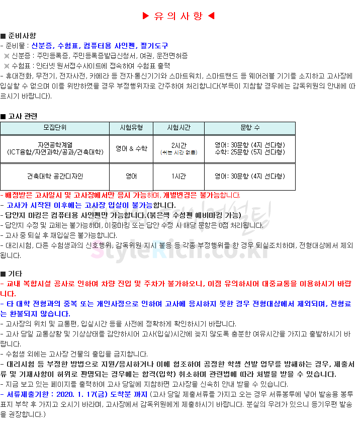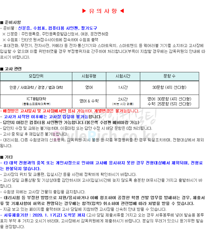 명지대 편입 2020학년도 필기고사 유의사항 간편하게 보자 2020.01.07 02:33 편입 유의사항/2020학년도 유의사항 2020학년도 명지대 편입 필기고사 유의사항을 살펴보겠습니다. ※ 내용 일부가 변경되거나 오표기가 있을 수 있으므로 시험 전 반드시 명지대 입학처 홈페이지에서 최종적으로 확인 바랍니다. 2020학년도 명지대 편입 인문캠퍼스 필기고사 유의사항 2020학년도 명지대 편입 자연캠퍼스 필기고사 유의사항 <출처: 명지대 홈페이지> [명지투데이] 외국인 재학생과 함께하는 ‘세계음식축제’ 공유하기 게시글 관리 리치의 편입컨설팅 저작자표시 비영리 변경금지 (새창열림) '편입 유의사항 > 2020학년도 유의사항' 카테고리의 다른 글 덕성여대 편입 2020학년도 필기&실기고사 유의사항 간편하게 보자 (0) 2020.01.09 숭실대 편입 2020학년도 필기고사 유의사항 간편하게 보자 (0) 2020.01.08 수원대 편입 2020학년도 필기&실기고사 유의사항 간편하게 보자 (0) 2020.01.04 아주대 편입 2020학년도 필기고사 유의사항 간편하게 보자 (0) 2020.01.04 가톨릭대 편입 2020학년도 필기고사 유의사항 간편하게 보자 (0) 2020.01.04 댓글 공유하기 다른 글 댓글 이 글 공유하기 구독하기 구독하기 카카오톡 카카오톡 라인 라인 트위터 트위터 Facebook Facebook 카카오스토리 카카오스토리 밴드 밴드 네이버 블로그 네이버 블로그 Pocket Pocket Evernote Evernote 다른 글 덕성여대 편입 2020학년도 필기&실기고사 유의사항 간편하게 보자 덕성여대 편입 2020학년도 필기&실기고사 유의사항 간편하게 보자 2020.01.09 숭실대 편입 2020학년도 필기고사 유의사항 간편하게 보자 숭실대 편입 2020학년도 필기고사 유의사항 간편하게 보자 2020.01.08 수원대 편입 2020학년도 필기&실기고사 유의사항 간편하게 보자 수원대 편입 2020학년도 필기&실기고사 유의사항 간편하게 보자 2020.01.04 아주대 편입 2020학년도 필기고사 유의사항 간편하게 보자 아주대 편입 2020학년도 필기고사 유의사항 간편하게 보자 2020.01.04 다른 글 더 둘러보기