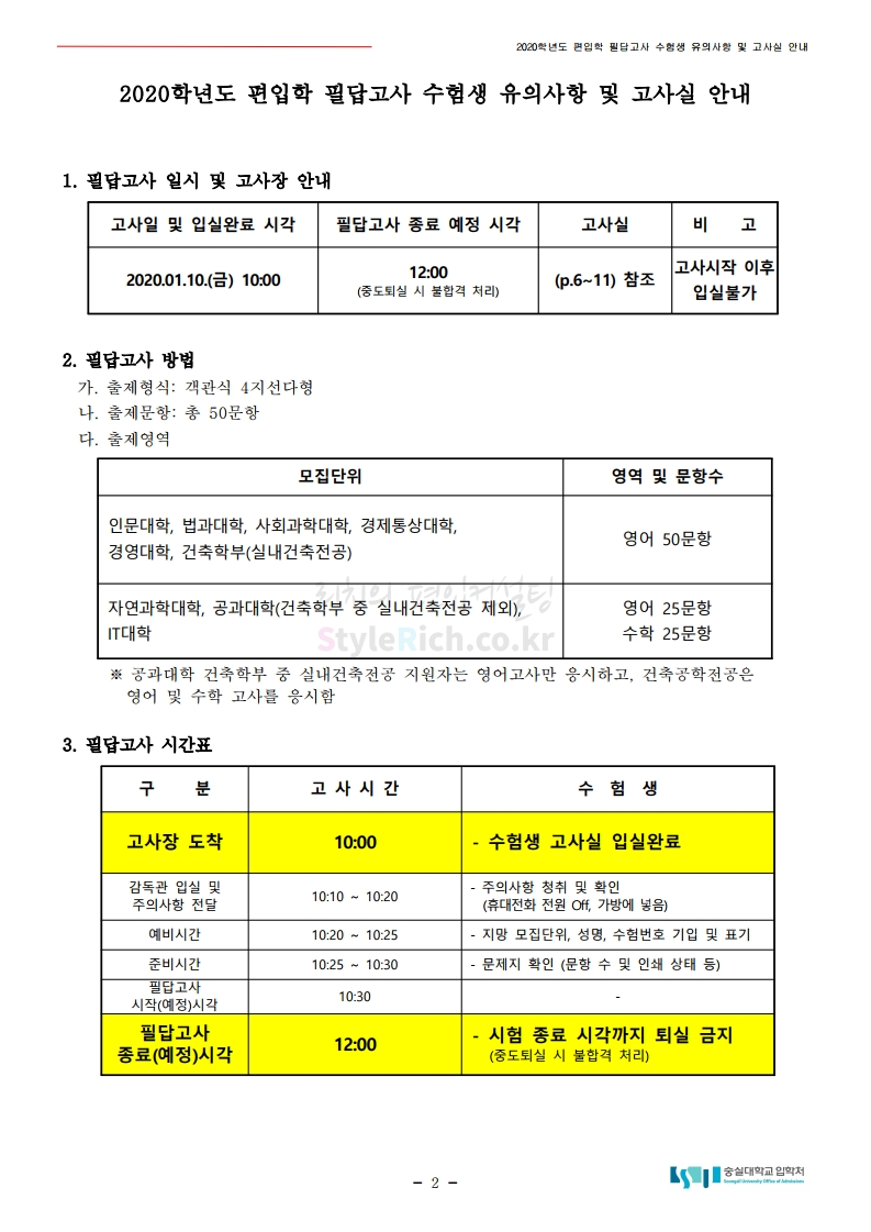 2020학년도 숭실대 편입 필기고사 유의사항 02