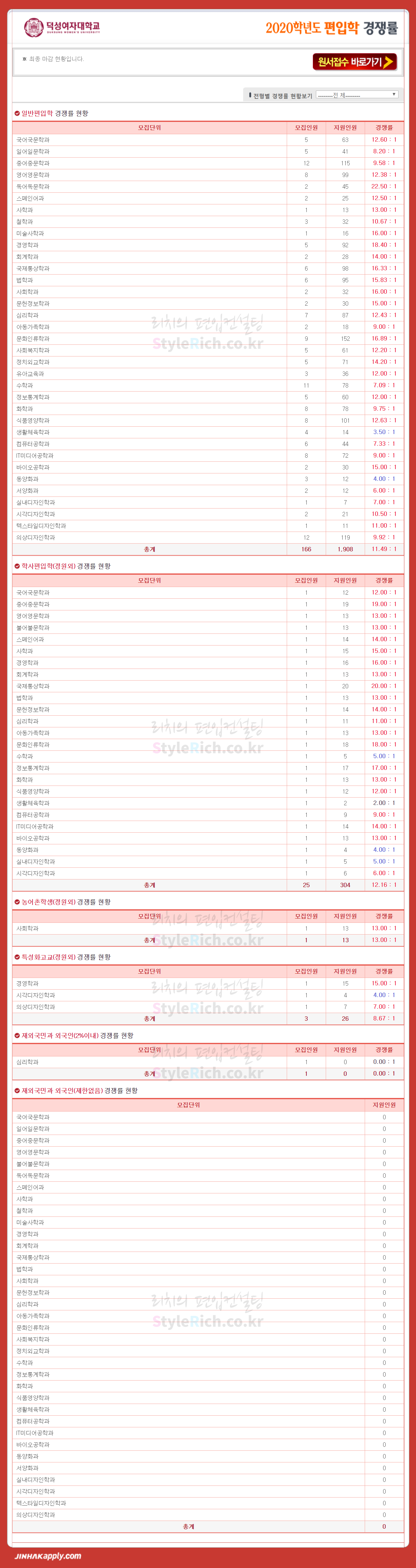 덕성여대 편입 2020학년도 경쟁률 간편하게 보자 2020.01.09 01:46 편입 경쟁률/2020학년도 경쟁률 2020학년도 덕성여대 편입 경쟁률을 살펴보겠습니다. 농어촌학생편입, 학사편입, 일반편입, 특성화고교편입 순으로 경쟁률이 높습니다. 재외국민과 외국인편입(2%이내)은 지원자가 없어 경쟁률을 산정할 수 없으며, 재외국민과 외국인편입(제한없음)은 모집인원에 제한이 없어 경쟁률 자체가 성립되지 않습니다. 2020학년도 덕성여대 편입 경쟁률 <출처: 진학사 원서접수> 덕성여자대학교 졸업제도안내 공유하기 게시글 관리 리치의 편입컨설팅 저작자표시 비영리 변경금지 (새창열림) '편입 경쟁률 > 2020학년도 경쟁률' 카테고리의 다른 글 중앙대 편입 2020학년도 경쟁률 간편하게 보자 (0) 2020.01.12 서강대 편입 2020학년도 경쟁률 간편하게 보자 (0) 2020.01.12 성균관대 편입 2020학년도 경쟁률 간편하게 보자 (0) 2020.01.08 숭실대 편입 2020학년도 경쟁률 간편하게 보자 (0) 2020.01.05 강남대 편입 2020학년도 경쟁률 간편하게 보자 (0) 2020.01.05 댓글 공유하기 다른 글 댓글 이 글 공유하기 구독하기 구독하기 카카오톡 카카오톡 라인 라인 트위터 트위터 Facebook Facebook 카카오스토리 카카오스토리 밴드 밴드 네이버 블로그 네이버 블로그 Pocket Pocket Evernote Evernote 다른 글 중앙대 편입 2020학년도 경쟁률 간편하게 보자 중앙대 편입 2020학년도 경쟁률 간편하게 보자 2020.01.12 서강대 편입 2020학년도 경쟁률 간편하게 보자 서강대 편입 2020학년도 경쟁률 간편하게 보자 2020.01.12 성균관대 편입 2020학년도 경쟁률 간편하게 보자 성균관대 편입 2020학년도 경쟁률 간편하게 보자 2020.01.08 숭실대 편입 2020학년도 경쟁률 간편하게 보자 숭실대 편입 2020학년도 경쟁률 간편하게 보자 2020.01.05 다른 글 더 둘러보기