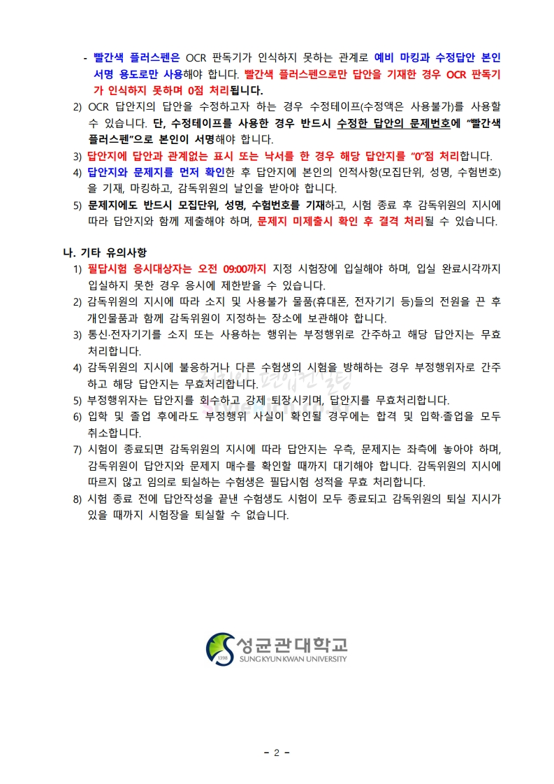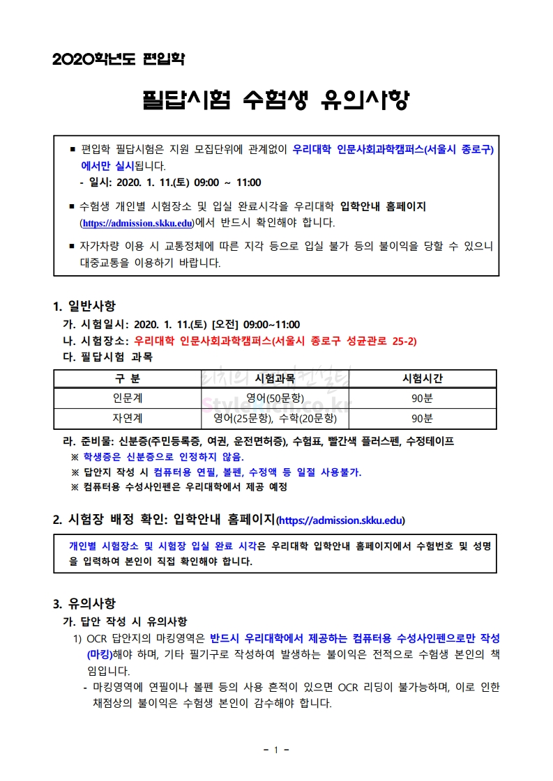 성균관대 편입 2020학년도 필기고사 유의사항 간편하게 보자 2020.01.10 00:40 편입 유의사항/2020학년도 유의사항 2020학년도 성균관대 편입 필기고사 유의사항을 살펴보겠습니다. ※ 내용 일부가 변경되거나 오표기가 있을 수 있으므로 시험 전 반드시 성균관대 입학처 홈페이지에서 최종적으로 확인 바랍니다. 2020학년도 성균관대 편입 필기고사 유의사항 01 2020학년도 성균관대 편입 필기고사 유의사항 02 <출처: 성균관대 홈페이지> 성균관대를 빛낸 2019년 10대 뉴스 공유하기 게시글 관리 리치의 편입컨설팅 저작자표시 비영리 변경금지 (새창열림) '편입 유의사항 > 2020학년도 유의사항' 카테고리의 다른 글 중앙대 편입 2020학년도 필기&실기고사 유의사항 간편하게 보자 (0) 2020.01.11 서강대 편입 2020학년도 필기고사 유의사항 간편하게 보자 (0) 2020.01.10 덕성여대 편입 2020학년도 필기&실기고사 유의사항 간편하게 보자 (0) 2020.01.09 숭실대 편입 2020학년도 필기고사 유의사항 간편하게 보자 (0) 2020.01.08 명지대 편입 2020학년도 필기고사 유의사항 간편하게 보자 (0) 2020.01.07 댓글 공유하기 다른 글 댓글 이 글 공유하기 구독하기 구독하기 카카오톡 카카오톡 라인 라인 트위터 트위터 Facebook Facebook 카카오스토리 카카오스토리 밴드 밴드 네이버 블로그 네이버 블로그 Pocket Pocket Evernote Evernote 다른 글 중앙대 편입 2020학년도 필기&실기고사 유의사항 간편하게 보자 중앙대 편입 2020학년도 필기&실기고사 유의사항 간편하게 보자 2020.01.11 서강대 편입 2020학년도 필기고사 유의사항 간편하게 보자 서강대 편입 2020학년도 필기고사 유의사항 간편하게 보자 2020.01.10 덕성여대 편입 2020학년도 필기&실기고사 유의사항 간편하게 보자 덕성여대 편입 2020학년도 필기&실기고사 유의사항 간편하게 보자 2020.01.09 숭실대 편입 2020학년도 필기고사 유의사항 간편하게 보자 숭실대 편입 2020학년도 필기고사 유의사항 간편하게 보자 2020.01.08 다른 글 더 둘러보기