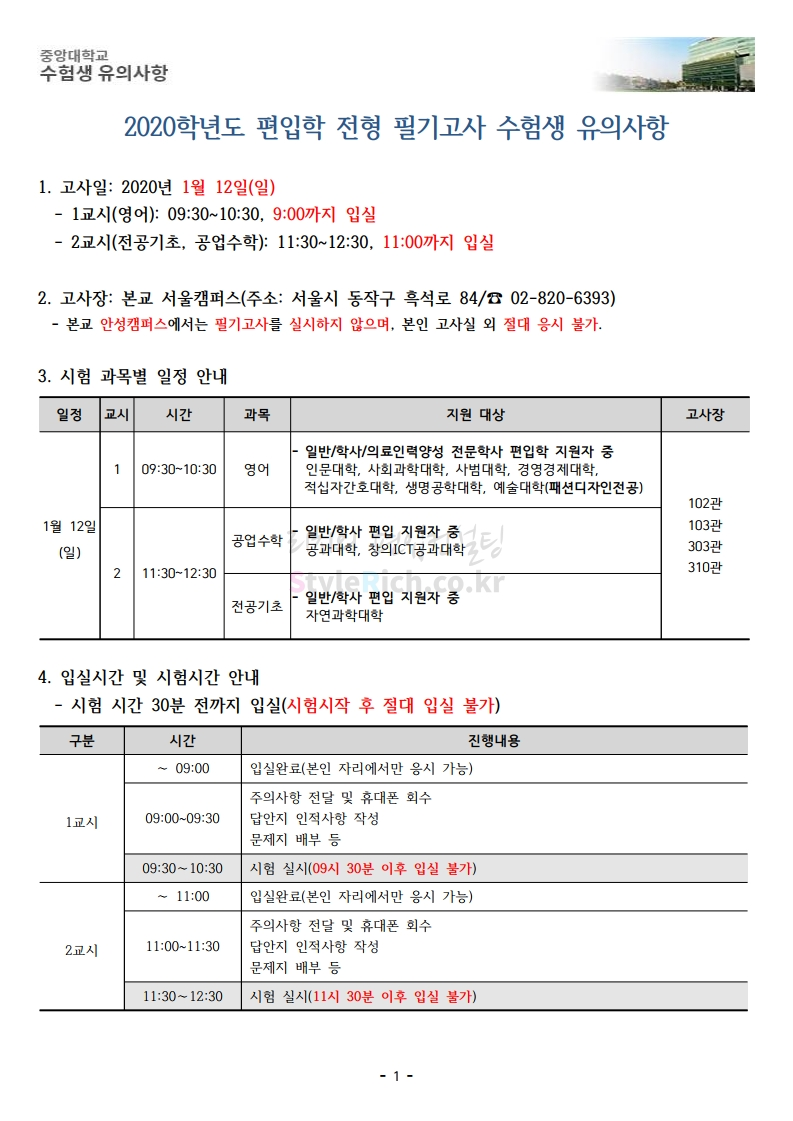 2020학년도 중앙대 편입 필기&실기고사 유의사항을 살펴보겠습니다.