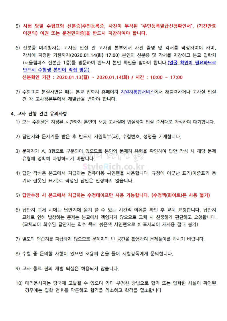 2020학년도 한양대 편입 필기고사 유의사항 04