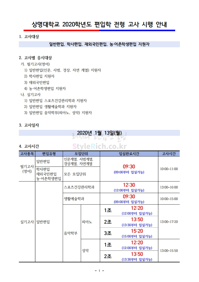 2020학년도 상명대 편입 필기고사 유의사항 01