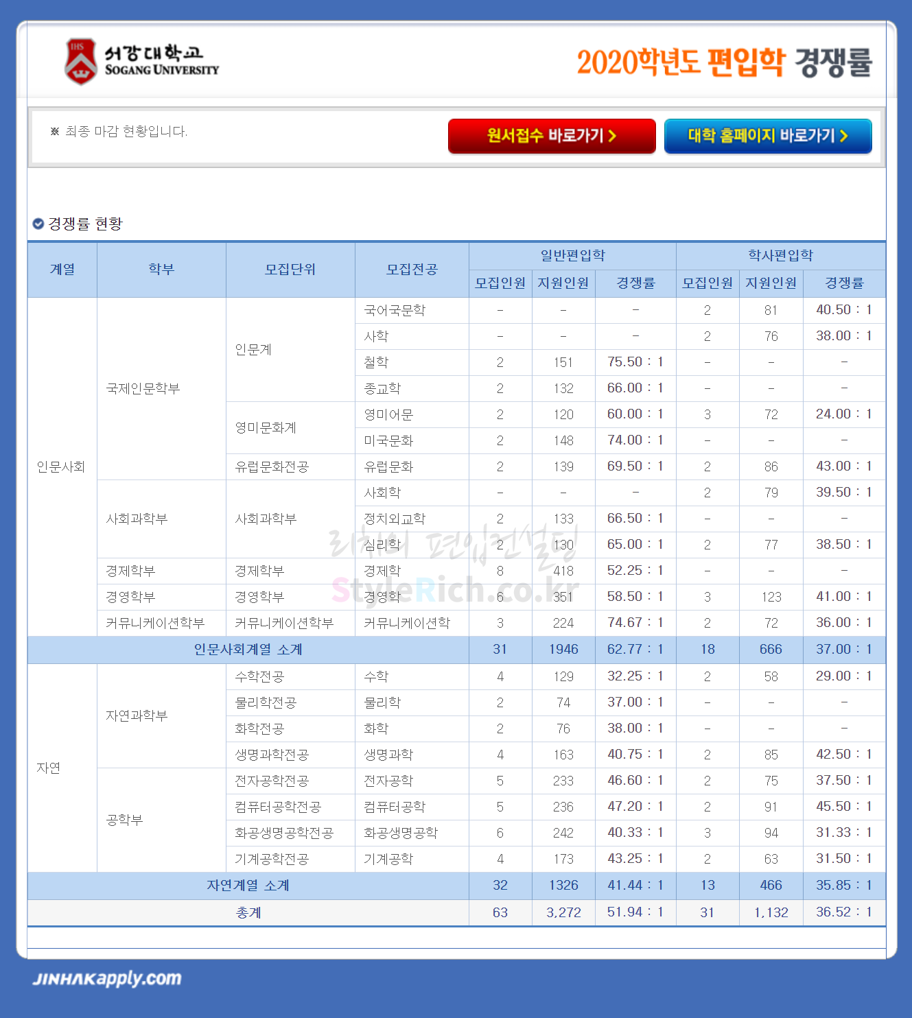 서강대 편입 2020학년도 경쟁률 간편하게 보자 2020.01.12 13:00 편입 경쟁률/2020학년도 경쟁률 2020학년도 서강대 편입 경쟁률을 살펴보겠습니다. 일반편입, 학사편입 순으로 경쟁률이 높습니다. 2020학년도 서강대 편입 경쟁률 <출처: 진학사 원서접수> 소소하고 평범한 이야기들, 서강사람들 #2 공유하기 게시글 관리 리치의 편입컨설팅 저작자표시 비영리 변경금지 (새창열림) '편입 경쟁률 > 2020학년도 경쟁률' 카테고리의 다른 글 한양대 편입 2020학년도 경쟁률을 간편하게 보자 (0) 2020.01.12 중앙대 편입 2020학년도 경쟁률 간편하게 보자 (0) 2020.01.12 덕성여대 편입 2020학년도 경쟁률 간편하게 보자 (0) 2020.01.09 성균관대 편입 2020학년도 경쟁률 간편하게 보자 (0) 2020.01.08 숭실대 편입 2020학년도 경쟁률 간편하게 보자 (0) 2020.01.05 댓글 공유하기 다른 글 댓글 이 글 공유하기 구독하기 구독하기 카카오톡 카카오톡 라인 라인 트위터 트위터 Facebook Facebook 카카오스토리 카카오스토리 밴드 밴드 네이버 블로그 네이버 블로그 Pocket Pocket Evernote Evernote 다른 글 한양대 편입 2020학년도 경쟁률을 간편하게 보자 한양대 편입 2020학년도 경쟁률을 간편하게 보자 2020.01.12 중앙대 편입 2020학년도 경쟁률 간편하게 보자 중앙대 편입 2020학년도 경쟁률 간편하게 보자 2020.01.12 덕성여대 편입 2020학년도 경쟁률 간편하게 보자 덕성여대 편입 2020학년도 경쟁률 간편하게 보자 2020.01.09 성균관대 편입 2020학년도 경쟁률 간편하게 보자 성균관대 편입 2020학년도 경쟁률 간편하게 보자 2020.01.08 다른 글 더 둘러보기