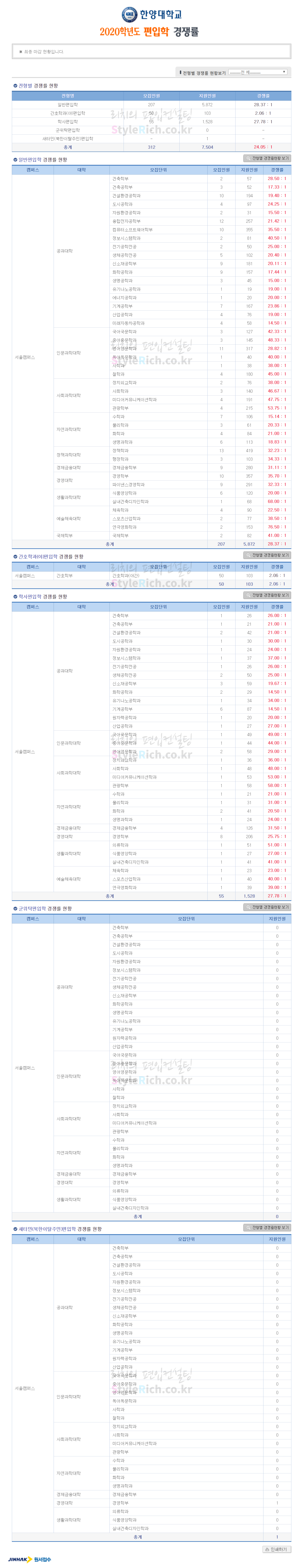 한양대 편입 2020학년도 경쟁률을 간편하게 보자 2020.01.12 23:43 편입 경쟁률/2020학년도 경쟁률 2020학년도 한양대 편입 경쟁률을 살펴보겠습니다. 일반편입, 학사편입, 간호학과(야)편입 순으로 경쟁률이 높습니다. 군위탁편입, 새터민(북한이탈주민)편입은 모집인원이 정해져 있지 않아 경쟁률이 성립되지 않습니다. 2020학년도 한양대 편입 경쟁률 <출처: 진학사 원서접수> [한양대학교 채널H] 2020 신년 인사회 및 시무식 공유하기 게시글 관리 리치의 편입컨설팅 저작자표시 비영리 변경금지 (새창열림) '편입 경쟁률 > 2020학년도 경쟁률' 카테고리의 다른 글 한성대 편입 2020학년도 경쟁률 간편하게 보자 (0) 2020.01.21 상명대 편입 2020학년도 경쟁률 간편하게 보자 (0) 2020.01.21 중앙대 편입 2020학년도 경쟁률 간편하게 보자 (0) 2020.01.12 서강대 편입 2020학년도 경쟁률 간편하게 보자 (0) 2020.01.12 덕성여대 편입 2020학년도 경쟁률 간편하게 보자 (0) 2020.01.09 댓글 공유하기 다른 글 댓글 이 글 공유하기 구독하기 구독하기 카카오톡 카카오톡 라인 라인 트위터 트위터 Facebook Facebook 카카오스토리 카카오스토리 밴드 밴드 네이버 블로그 네이버 블로그 Pocket Pocket Evernote Evernote 다른 글 한성대 편입 2020학년도 경쟁률 간편하게 보자 한성대 편입 2020학년도 경쟁률 간편하게 보자 2020.01.21 상명대 편입 2020학년도 경쟁률 간편하게 보자 상명대 편입 2020학년도 경쟁률 간편하게 보자 2020.01.21 중앙대 편입 2020학년도 경쟁률 간편하게 보자 중앙대 편입 2020학년도 경쟁률 간편하게 보자 2020.01.12 서강대 편입 2020학년도 경쟁률 간편하게 보자 서강대 편입 2020학년도 경쟁률 간편하게 보자 2020.01.12 다른 글 더 둘러보기