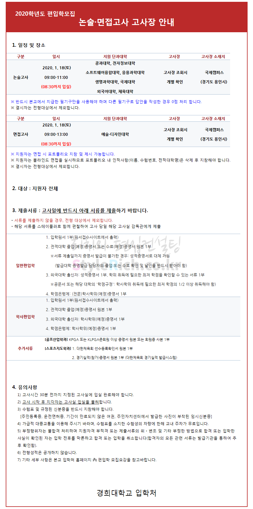 경희대(국제) 편입 2020학년도 논술&면접고사 유의사항 간편하게 보자 2020.01.18 00:33 편입 유의사항/2020학년도 유의사항 2020학년도 경희대(국제) 편입 논술, 면접고사 유의사항을 살펴보겠습니다. ※ 내용 일부가 변경되거나 오표기가 있을 수 있으므로 시험 전 반드시 경희대 입학처 홈페이지에서 최종적으로 확인 바랍니다. 2020학년도 경희대 편입 논술&면접고사 유의사항 <출처: 경희대 홈페이지> 경희대학교 캠퍼스투어 공유하기 게시글 관리 리치의 편입컨설팅 저작자표시 비영리 변경금지 (새창열림) '편입 유의사항 > 2020학년도 유의사항' 카테고리의 다른 글 경희대(서울) 편입 2020학년도 논술고사 유의사항 간편하게 보자 (0) 2020.01.19 서울여대 편입 2020학년도 필기고사 유의사항 간편하게 보자 (0) 2020.01.18 서경대 편입 2020학년도 필기&실기고사 유의사항 간편하게 보자 (0) 2020.01.17 한국산업기술대 편입 2020학년도 필기고사 유의사항 간편하게 보자 (0) 2020.01.16 상명대(천안) 편입 2020학년도 필기&실기&면접고사 유의사항 간편하게 보자 (0) 2020.01.16 댓글 공유하기 다른 글 댓글 이 글 공유하기 구독하기 구독하기 카카오톡 카카오톡 라인 라인 트위터 트위터 Facebook Facebook 카카오스토리 카카오스토리 밴드 밴드 네이버 블로그 네이버 블로그 Pocket Pocket Evernote Evernote 다른 글 경희대(서울) 편입 2020학년도 논술고사 유의사항 간편하게 보자 경희대(서울) 편입 2020학년도 논술고사 유의사항 간편하게 보자 2020.01.19 서울여대 편입 2020학년도 필기고사 유의사항 간편하게 보자 서울여대 편입 2020학년도 필기고사 유의사항 간편하게 보자 2020.01.18 서경대 편입 2020학년도 필기&실기고사 유의사항 간편하게 보자 서경대 편입 2020학년도 필기&실기고사 유의사항 간편하게 보자 2020.01.17 한국산업기술대 편입 2020학년도 필기고사 유의사항 간편하게 보자 한국산업기술대 편입 2020학년도 필기고사 유의사항 간편하게 보자 2020.01.16 다른 글 더 둘러보기