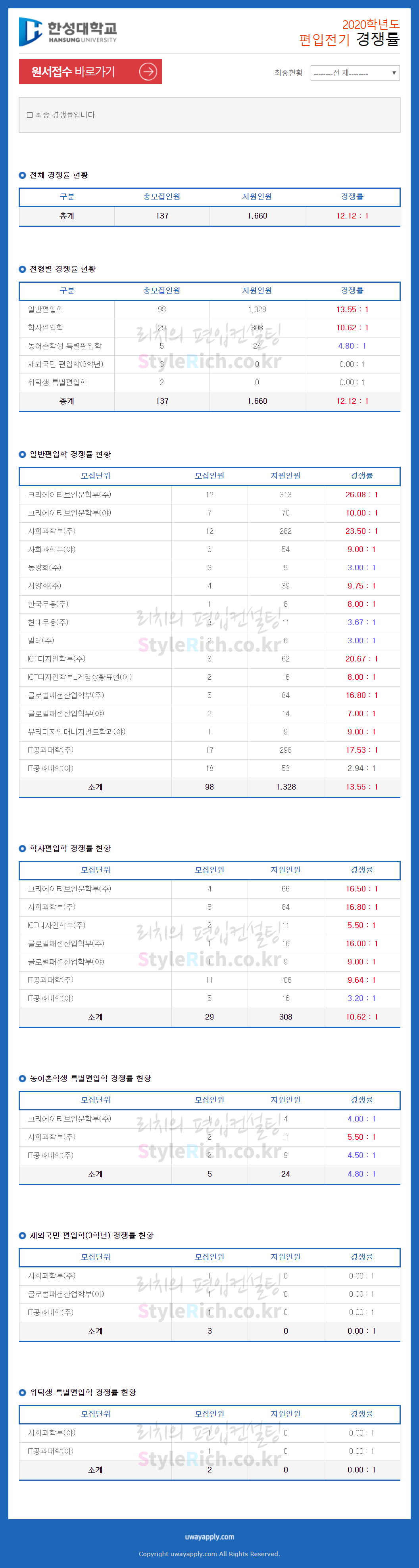 한성대 편입 2020학년도 경쟁률 간편하게 보자 2020.01.21 23:51 편입 경쟁률/2020학년도 경쟁률 2020학년도 한성대 편입 경쟁률을 살펴보겠습니다. 일반편입, 학사편입, 농어촌학생 특별편입 순으로 경쟁률이 높습니다. 재외국민 편입, 위탁생 특별편입은 지원자가 없었습니다. 2020학년도 한성대 편입 경쟁률 <출처: 유웨이 어플라이> [한성대 역사] 한성의 어제, 오늘 그리고 내일 공유하기 게시글 관리 리치의 편입컨설팅 저작자표시 비영리 변경금지 (새창열림) '편입 경쟁률 > 2020학년도 경쟁률' 카테고리의 다른 글 서울시립대 편입 2020학년도 경쟁률 간편하게 보자 (0) 2020.01.23 광운대 편입 2020학년도 경쟁률 간편하게 보자 (0) 2020.01.22 상명대 편입 2020학년도 경쟁률 간편하게 보자 (0) 2020.01.21 한양대 편입 2020학년도 경쟁률을 간편하게 보자 (0) 2020.01.12 중앙대 편입 2020학년도 경쟁률 간편하게 보자 (0) 2020.01.12 댓글 공유하기 다른 글 댓글 이 글 공유하기 구독하기 구독하기 카카오톡 카카오톡 라인 라인 트위터 트위터 Facebook Facebook 카카오스토리 카카오스토리 밴드 밴드 네이버 블로그 네이버 블로그 Pocket Pocket Evernote Evernote 다른 글 서울시립대 편입 2020학년도 경쟁률 간편하게 보자 서울시립대 편입 2020학년도 경쟁률 간편하게 보자 2020.01.23 광운대 편입 2020학년도 경쟁률 간편하게 보자 광운대 편입 2020학년도 경쟁률 간편하게 보자 2020.01.22 상명대 편입 2020학년도 경쟁률 간편하게 보자 상명대 편입 2020학년도 경쟁률 간편하게 보자 2020.01.21 한양대 편입 2020학년도 경쟁률을 간편하게 보자 한양대 편입 2020학년도 경쟁률을 간편하게 보자 2020.01.12 다른 글 더 둘러보기