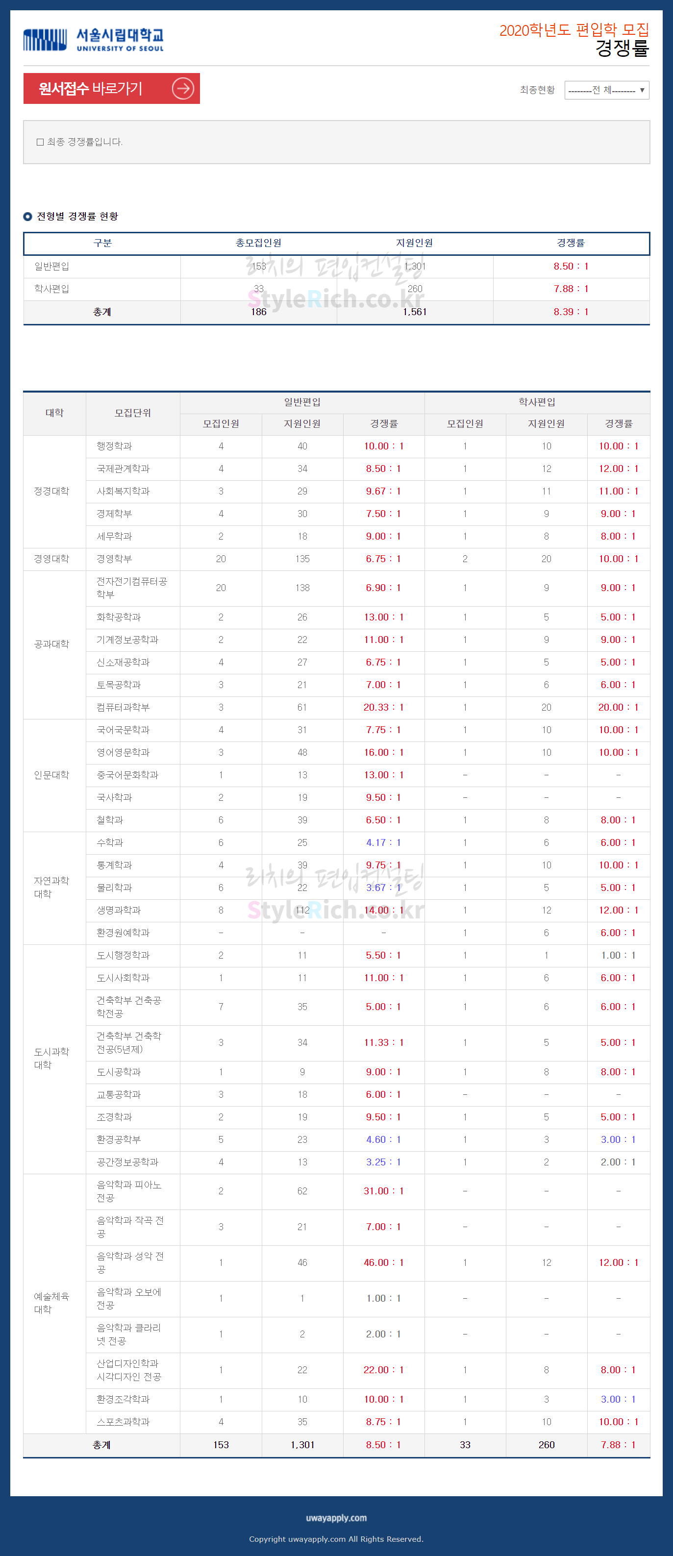 서울시립대 편입 2020학년도 경쟁률 간편하게 보자 2020.01.23 00:27 편입 경쟁률/2020학년도 경쟁률 2020학년도 서울시립대 편입 경쟁률을 살펴보겠습니다. 일반편입, 학사편입 순으로 경쟁률이 높습니다. 2020학년도 서울시립대 편입 경쟁률 <출처: 유웨이 어플라이> 2020 서울시립대학교 홍보영상 공유하기 게시글 관리 리치의 편입컨설팅 저작자표시 비영리 변경금지 (새창열림) '편입 경쟁률 > 2020학년도 경쟁률' 카테고리의 다른 글 한국산업기술대 편입 2020학년도 경쟁률 간편하게 보자 (0) 2020.01.23 상명대(천안) 편입 2020학년도 경쟁률 간편하게 보자 (0) 2020.01.23 광운대 편입 2020학년도 경쟁률 간편하게 보자 (0) 2020.01.22 한성대 편입 2020학년도 경쟁률 간편하게 보자 (0) 2020.01.21 상명대 편입 2020학년도 경쟁률 간편하게 보자 (0) 2020.01.21 댓글 공유하기 다른 글 댓글 이 글 공유하기 구독하기 구독하기 카카오톡 카카오톡 라인 라인 트위터 트위터 Facebook Facebook 카카오스토리 카카오스토리 밴드 밴드 네이버 블로그 네이버 블로그 Pocket Pocket Evernote Evernote 다른 글 한국산업기술대 편입 2020학년도 경쟁률 간편하게 보자 한국산업기술대 편입 2020학년도 경쟁률 간편하게 보자 2020.01.23 상명대(천안) 편입 2020학년도 경쟁률 간편하게 보자 상명대(천안) 편입 2020학년도 경쟁률 간편하게 보자 2020.01.23 광운대 편입 2020학년도 경쟁률 간편하게 보자 광운대 편입 2020학년도 경쟁률 간편하게 보자 2020.01.22 한성대 편입 2020학년도 경쟁률 간편하게 보자 한성대 편입 2020학년도 경쟁률 간편하게 보자 2020.01.21 다른 글 더 둘러보기