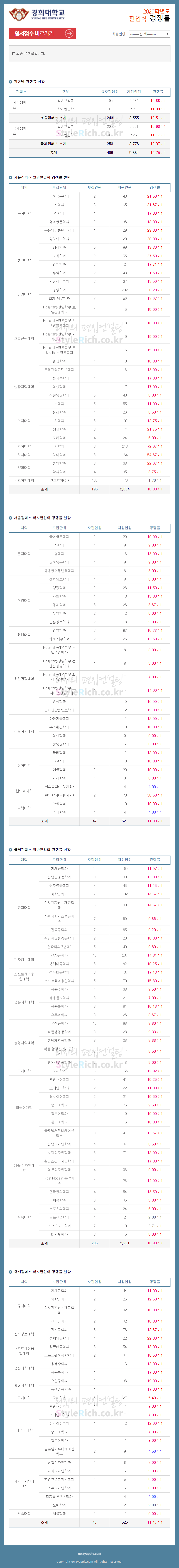경희대 편입 2020학년도 경쟁률 간편하게 보자 2020.01.26 21:38 편입 경쟁률/2020학년도 경쟁률 2020학년도 경희대 편입 경쟁률을 살펴보겠습니다. 학사편입, 일반편입 순으로 경쟁률이 높습니다. 2020학년도 경희대 편입 경쟁률 <출처: 유웨이 어플라이> 2020학년도 경희대 편입 경쟁률 공유하기 게시글 관리 리치의 편입컨설팅 저작자표시 비영리 변경금지 (새창열림) '편입 경쟁률 > 2020학년도 경쟁률' 카테고리의 다른 글 한국외대 편입 2020학년도 경쟁률 간편하게 보자 (0) 2020.01.27 서울여대 편입 2020학년도 경쟁률 간편하게 보자 (0) 2020.01.27 서경대 편입 2020학년도 서경대 경쟁률 간편하게 보자 (0) 2020.01.26 한국산업기술대 편입 2020학년도 경쟁률 간편하게 보자 (0) 2020.01.23 상명대(천안) 편입 2020학년도 경쟁률 간편하게 보자 (0) 2020.01.23 댓글 공유하기 다른 글 댓글 이 글 공유하기 구독하기 구독하기 카카오톡 카카오톡 라인 라인 트위터 트위터 Facebook Facebook 카카오스토리 카카오스토리 밴드 밴드 네이버 블로그 네이버 블로그 Pocket Pocket Evernote Evernote 다른 글 한국외대 편입 2020학년도 경쟁률 간편하게 보자 한국외대 편입 2020학년도 경쟁률 간편하게 보자 2020.01.27 서울여대 편입 2020학년도 경쟁률 간편하게 보자 서울여대 편입 2020학년도 경쟁률 간편하게 보자 2020.01.27 서경대 편입 2020학년도 서경대 경쟁률 간편하게 보자 서경대 편입 2020학년도 서경대 경쟁률 간편하게 보자 2020.01.26 한국산업기술대 편입 2020학년도 경쟁률 간편하게 보자 한국산업기술대 편입 2020학년도 경쟁률 간편하게 보자 2020.01.23 다른 글 더 둘러보기