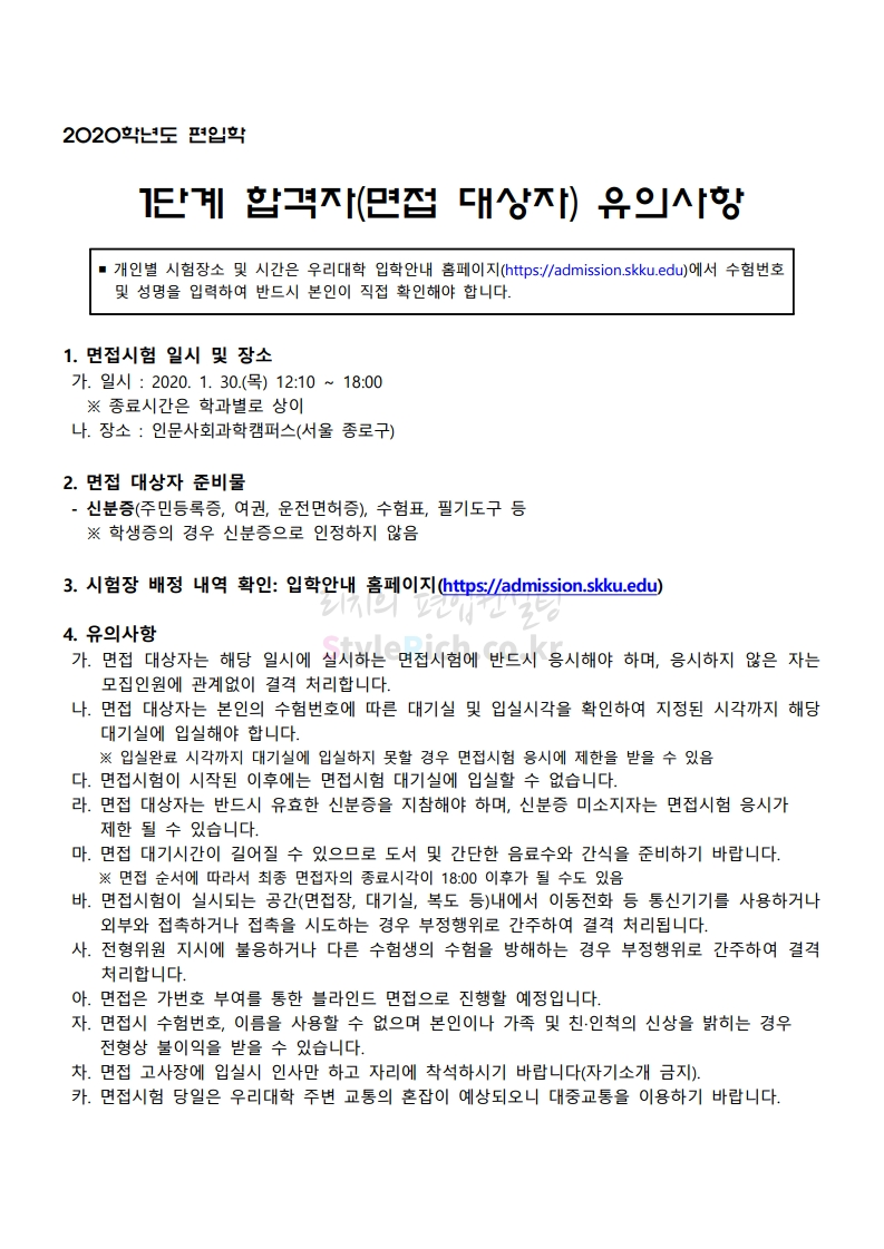 성균관대 편입 2020학년도 면접고사 유의사항 간편하게 보자 2020.01.30 22:33 편입 유의사항/2020학년도 유의사항 2020학년도 성균관대 편입 면접고사 유의사항을 살펴보겠습니다. 2020학년도 성균관대 편입 면접고사 유의사항 <출처: 성균관대 홈페이지> 😏성균 알쓸신잡😏 알아두면 쓸데없는 신비한 잡학사전 공유하기 게시글 관리 리치의 편입컨설팅 저작자표시 비영리 변경금지 (새창열림) '편입 유의사항 > 2020학년도 유의사항' 카테고리의 다른 글 아주대 편입 2020학년도 면접고사 유의사항 간편하게 보자 (0) 2020.01.31 숙명여대 편입 2020학년도 면접고사 유의사항 간편하게 보자 (0) 2020.01.31 서울과학기술대 편입 2020학년도 면접고사 유의사항 간편하게 보자 (0) 2020.01.30 서울과학기술대 편입 2020학년도 조형대학 실기고사 유의사항 간편하게 보자 (0) 2020.01.30 고려대 편입 2020학년도 면접고사 유의사항 간편하게 보자 (0) 2020.01.29 댓글 공유하기 다른 글 댓글 이 글 공유하기 구독하기 구독하기 카카오톡 카카오톡 라인 라인 트위터 트위터 Facebook Facebook 카카오스토리 카카오스토리 밴드 밴드 네이버 블로그 네이버 블로그 Pocket Pocket Evernote Evernote 다른 글 아주대 편입 2020학년도 면접고사 유의사항 간편하게 보자 아주대 편입 2020학년도 면접고사 유의사항 간편하게 보자 2020.01.31 숙명여대 편입 2020학년도 면접고사 유의사항 간편하게 보자 숙명여대 편입 2020학년도 면접고사 유의사항 간편하게 보자 2020.01.31 서울과학기술대 편입 2020학년도 면접고사 유의사항 간편하게 보자 서울과학기술대 편입 2020학년도 면접고사 유의사항 간편하게 보자 2020.01.30 서울과학기술대 편입 2020학년도 조형대학 실기고사 유의사항 간편하게 보자 서울과학기술대 편입 2020학년도 조형대학 실기고사 유의사항 간편하게 보자 2020.01.30 다른 글 더 둘러보기