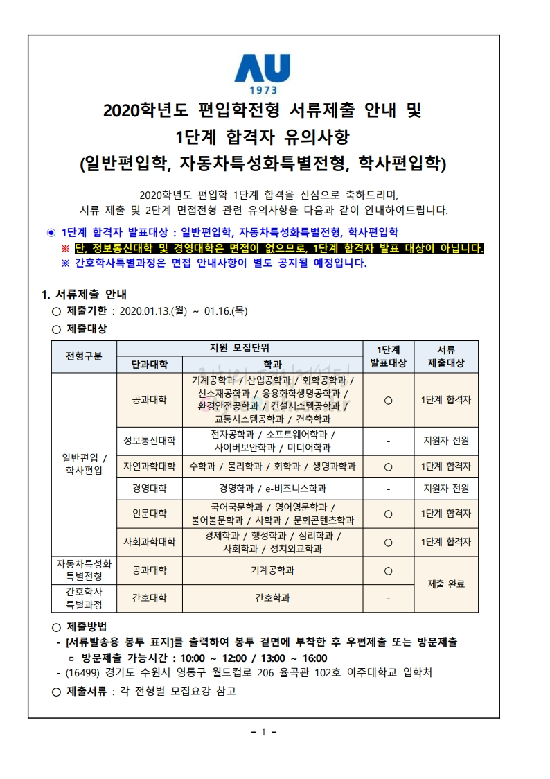 2020학년도 아주대 편입 서류제출 안내