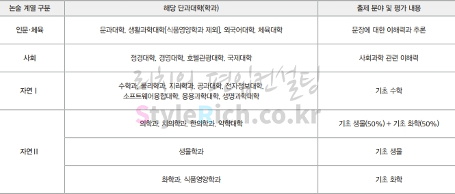 논술은 계열 구분에 따라 출제분야 및 평가내용이 다르며, 120분이 주어집니다. 인문·체육계열 논술은 문장에 대한 이해력과 추론, 사회계열은 사회과학 관련 이해력, 자연1은 기초수학, 자연2는 해당 단과 대학에 따라 기초생물+기초화학, 기초생물, 기초화학으로 출제분야가 나누어집니다.