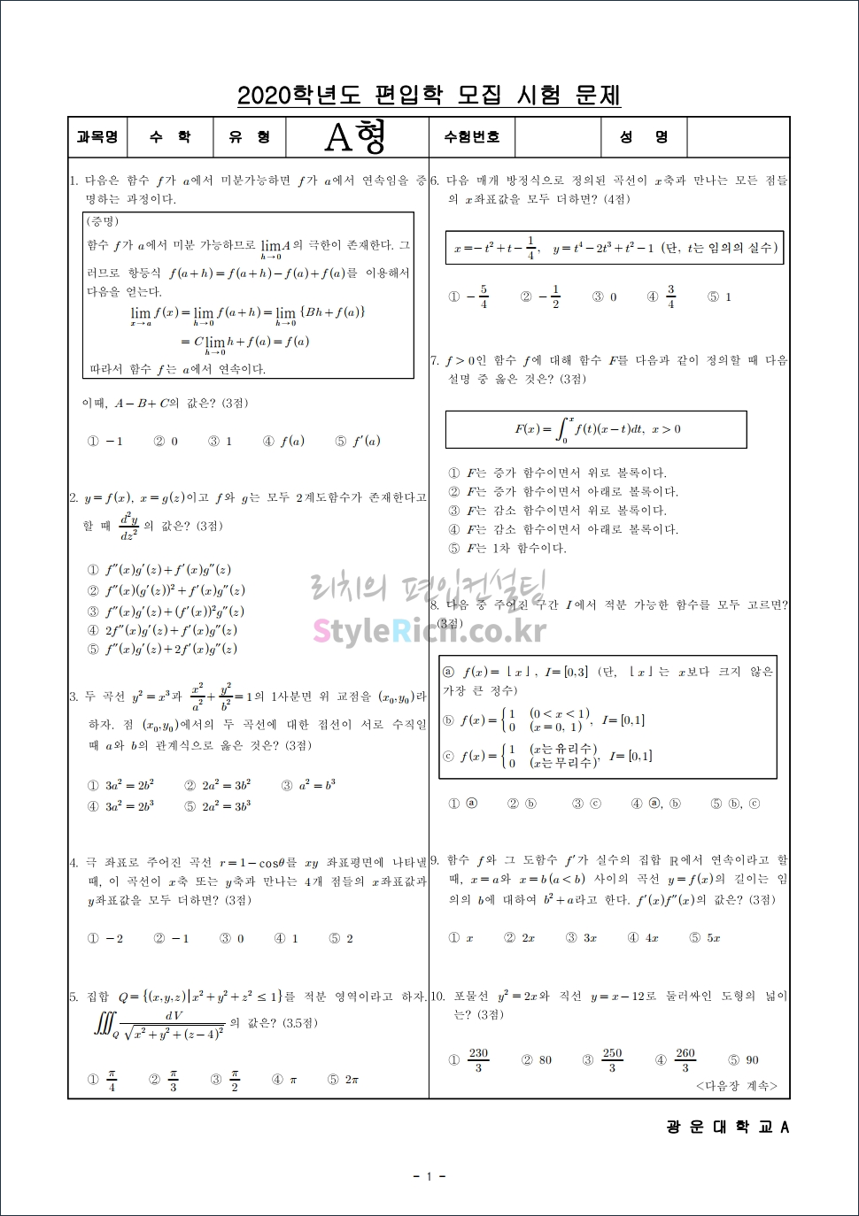2020학년도 광운대 편입 기출문제 수학 1페이지